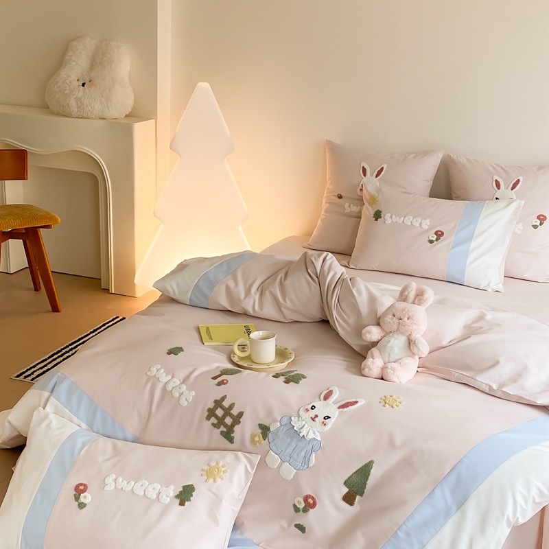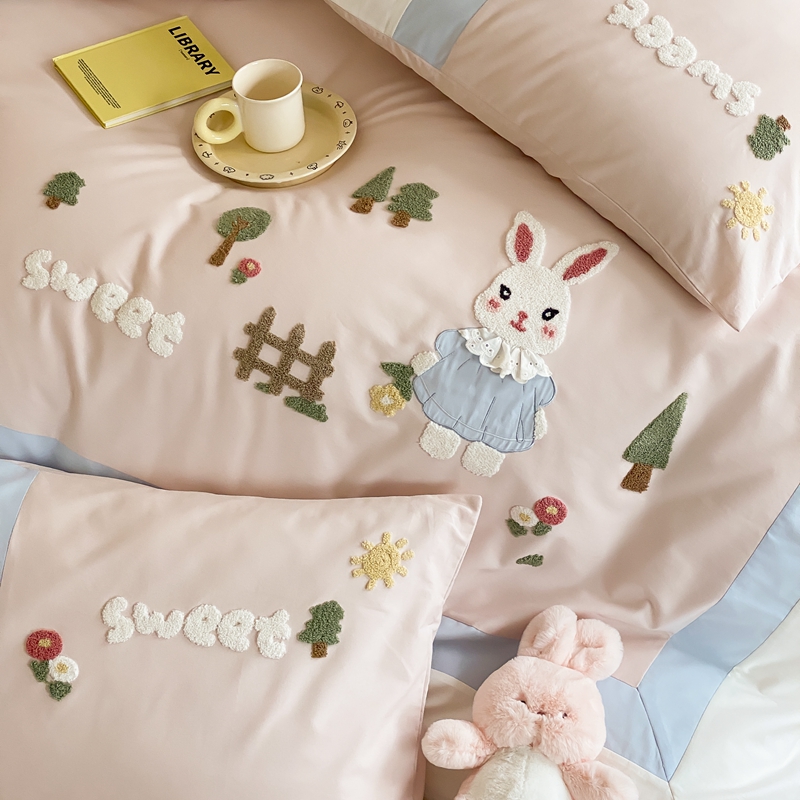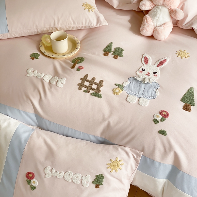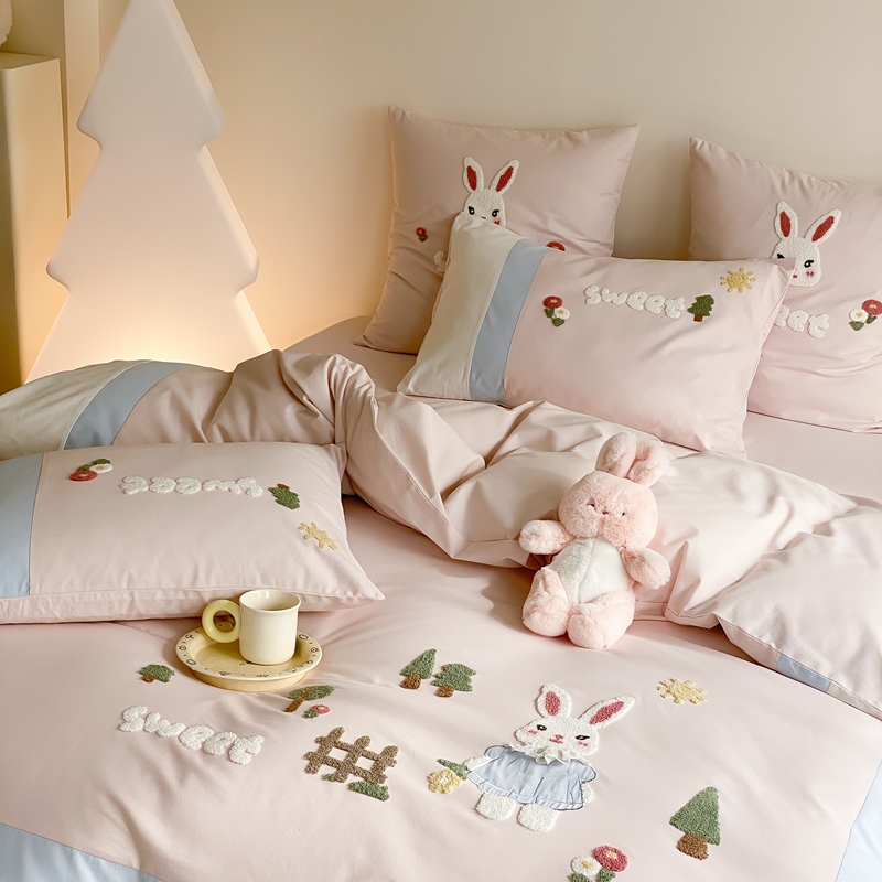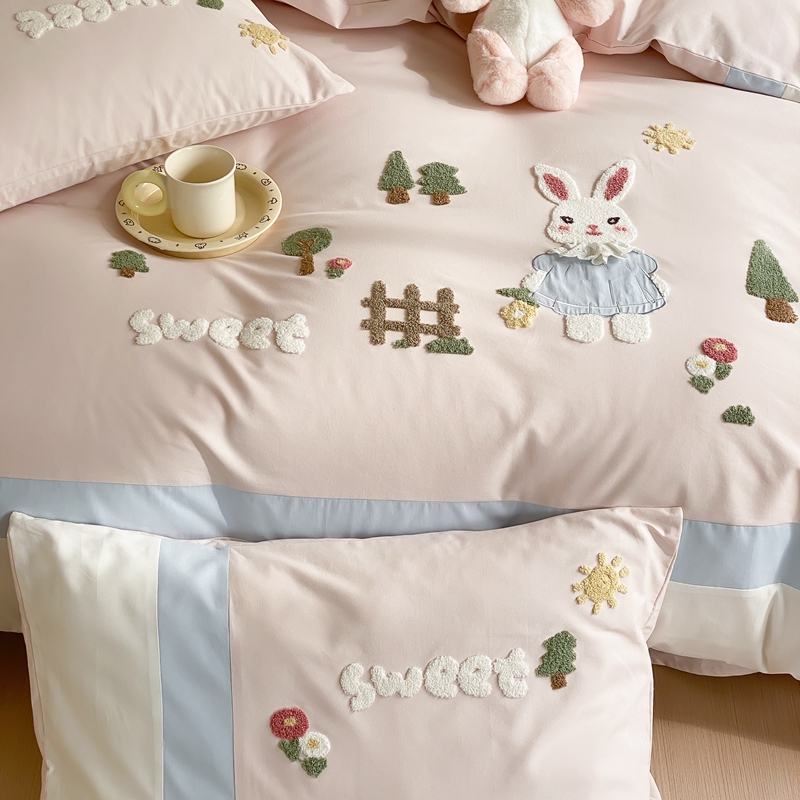 (总)星野 2025新款高克重牛奶绒贴布绣四件套-波点兔,波点兔
