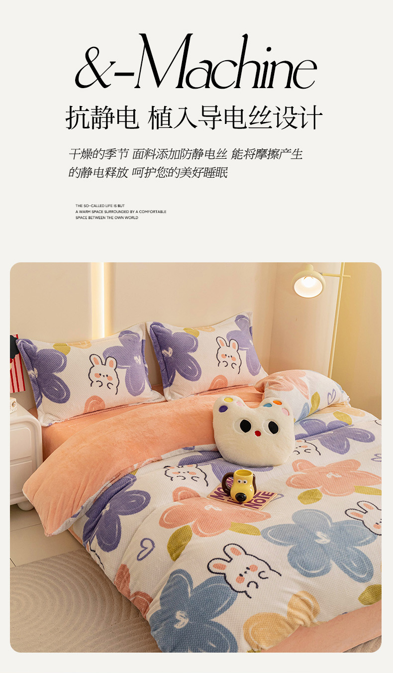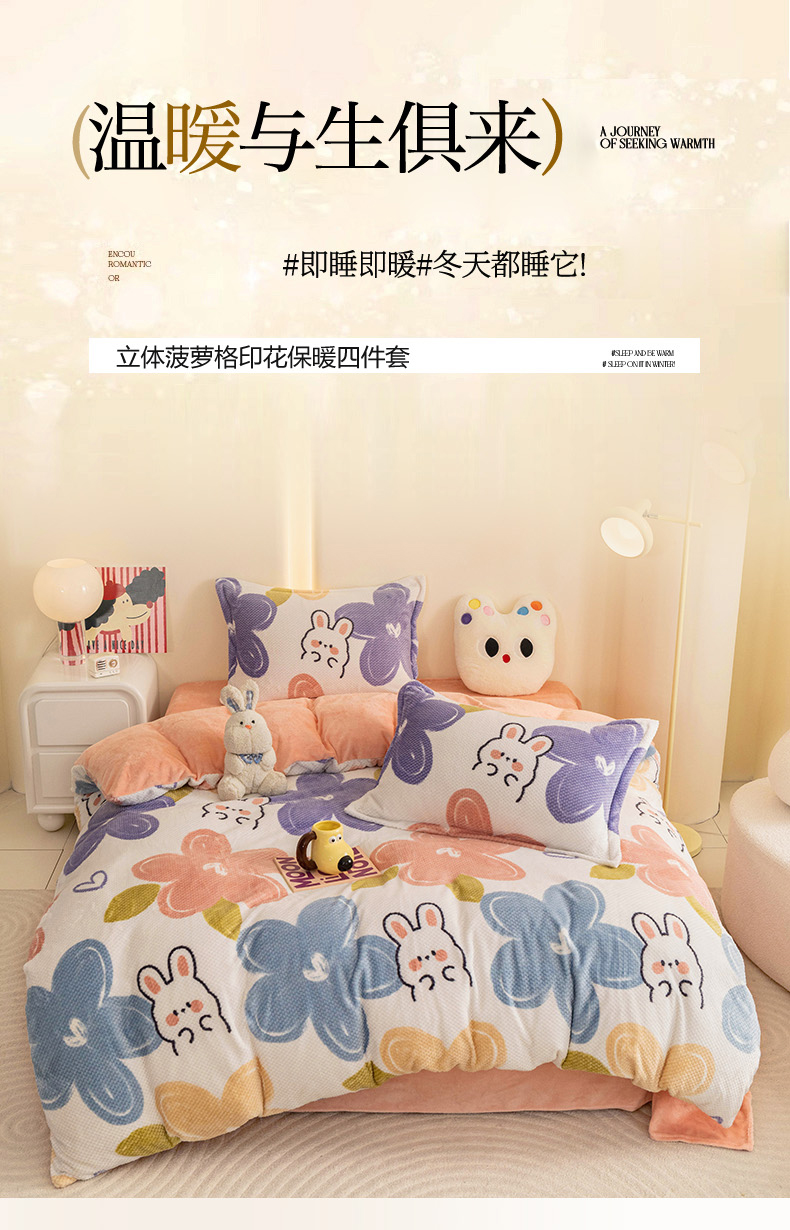 当前位置: 91家纺网 > 商品网购 > 床品套件 > 四件套 > 牛奶绒四件套 > 2024新款立体菠萝格印花保暖牛奶绒系列四件套 七彩小兔