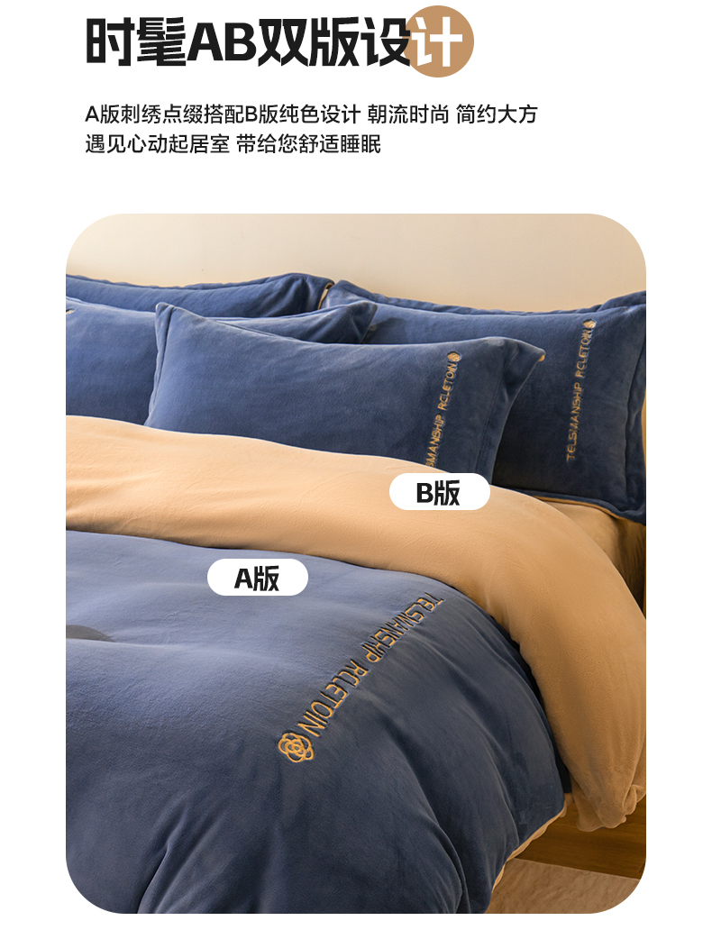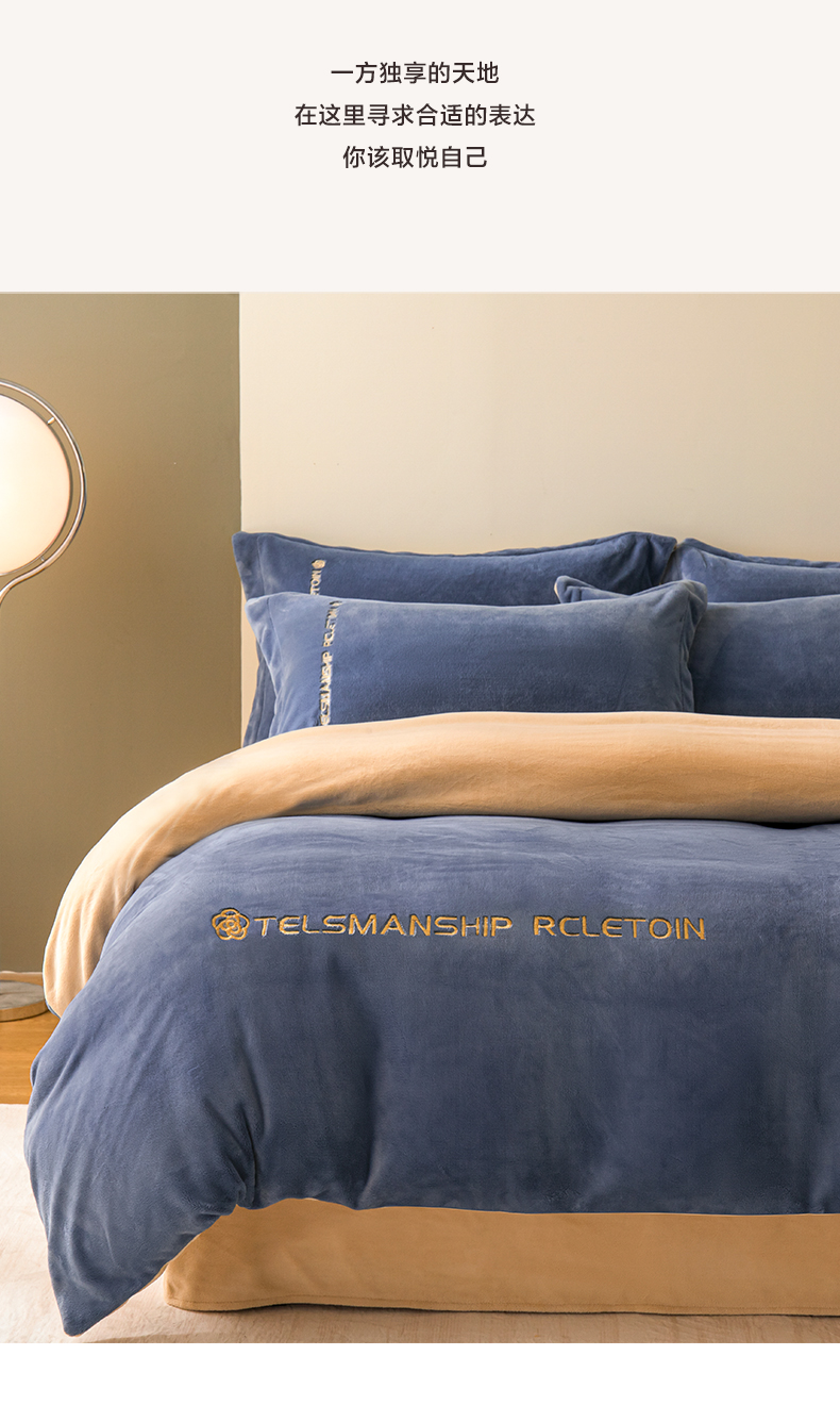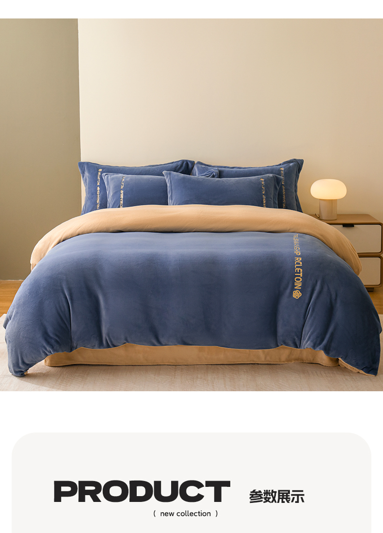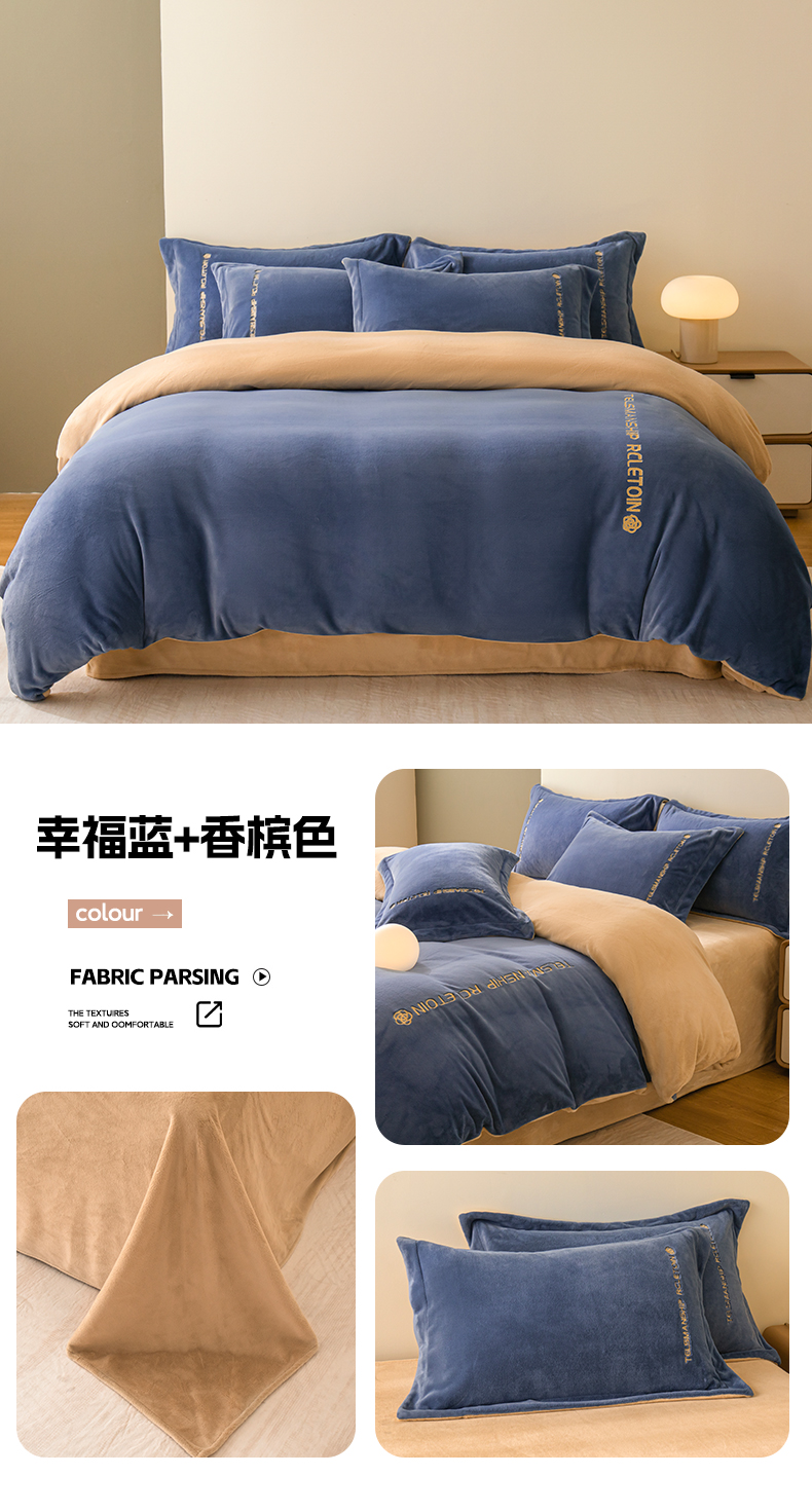 商品名称:花愿(原花纪) 2025新款牛奶绒撞色刺绣四件套—泽西 幸福蓝+香槟色