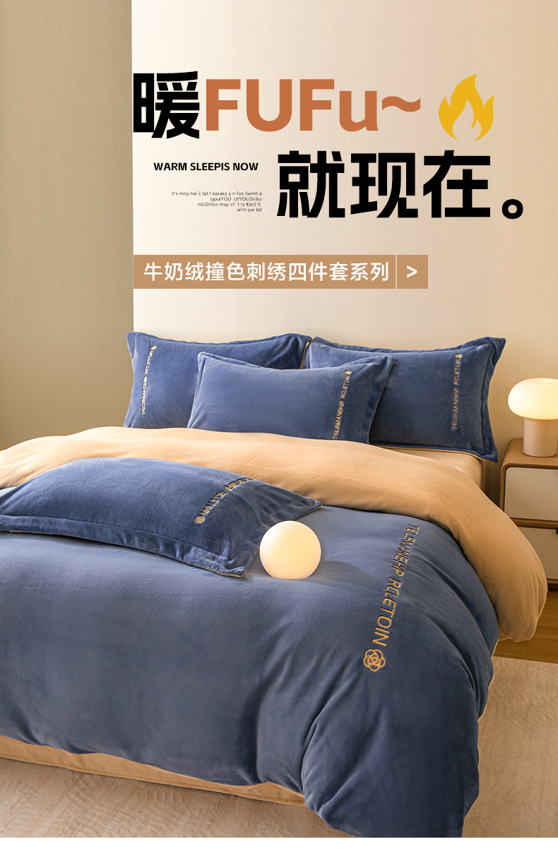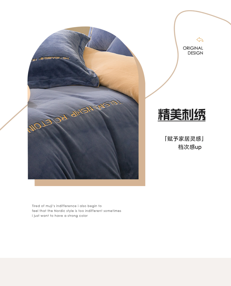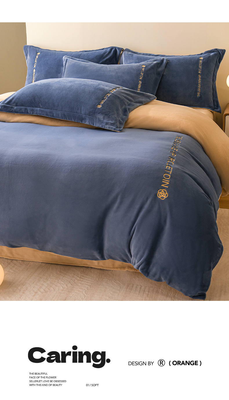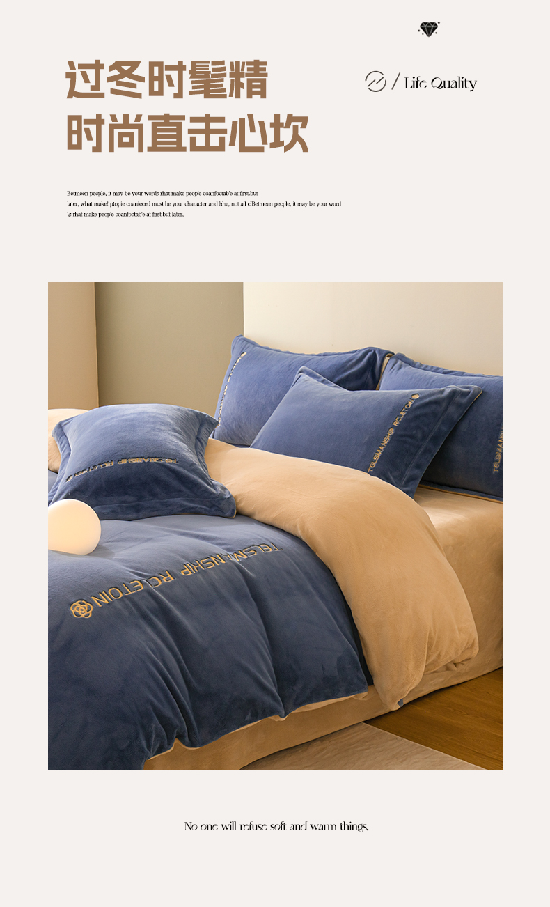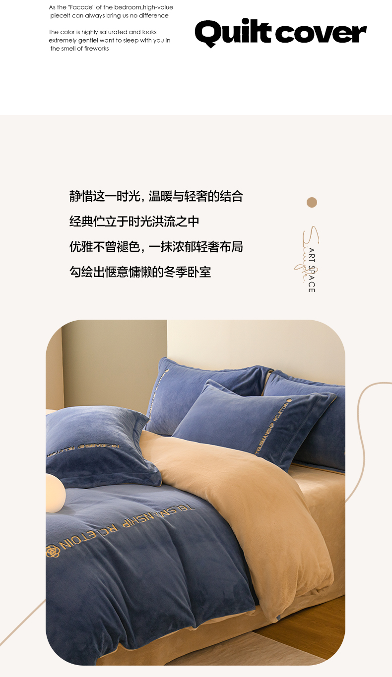 商品名称:花愿(原花纪) 2025新款牛奶绒撞色刺绣四件套—泽西 幸福蓝+香槟色