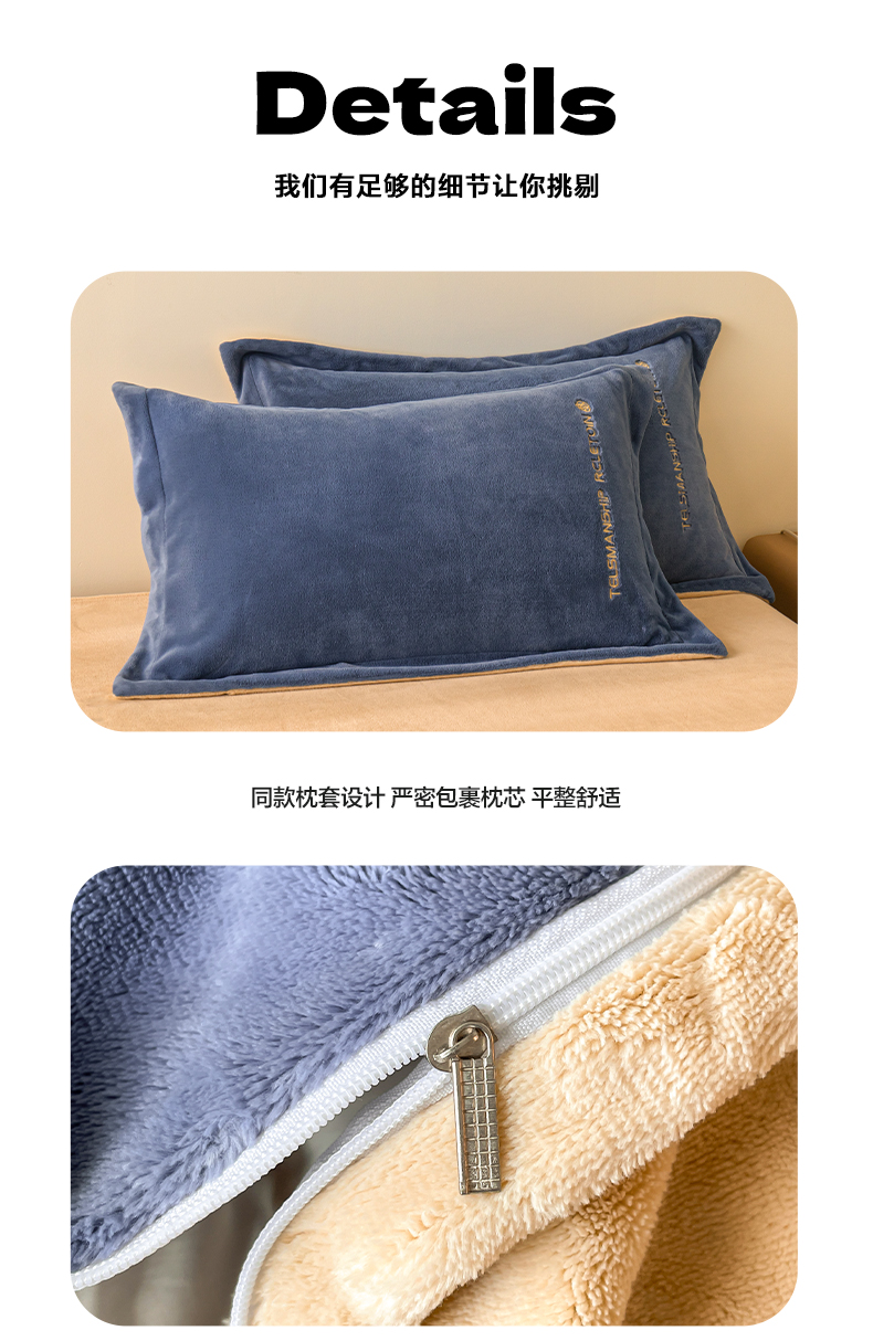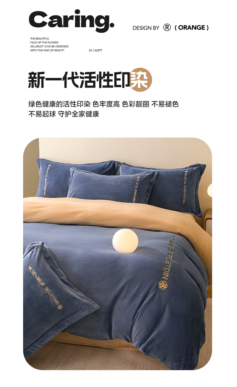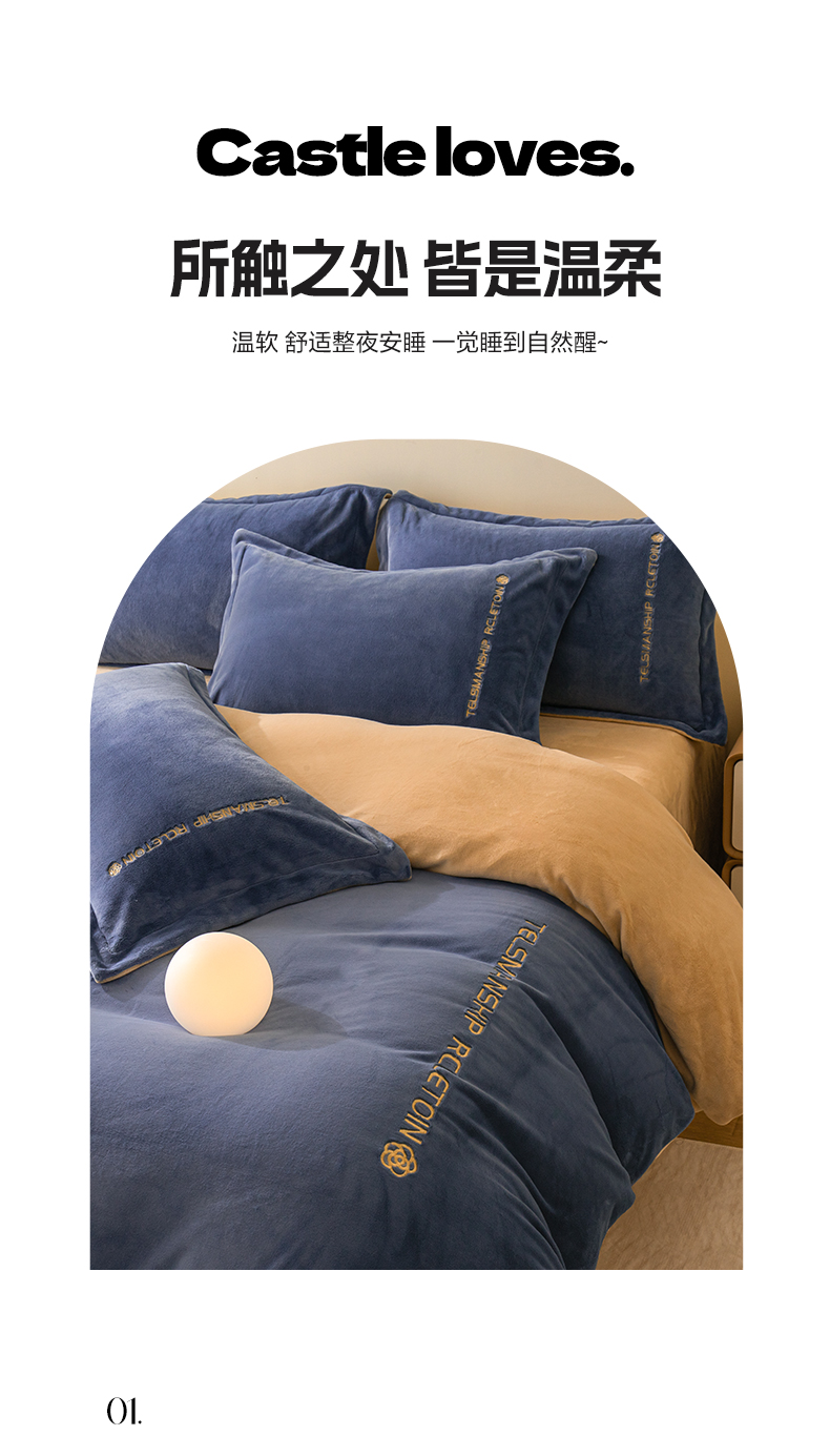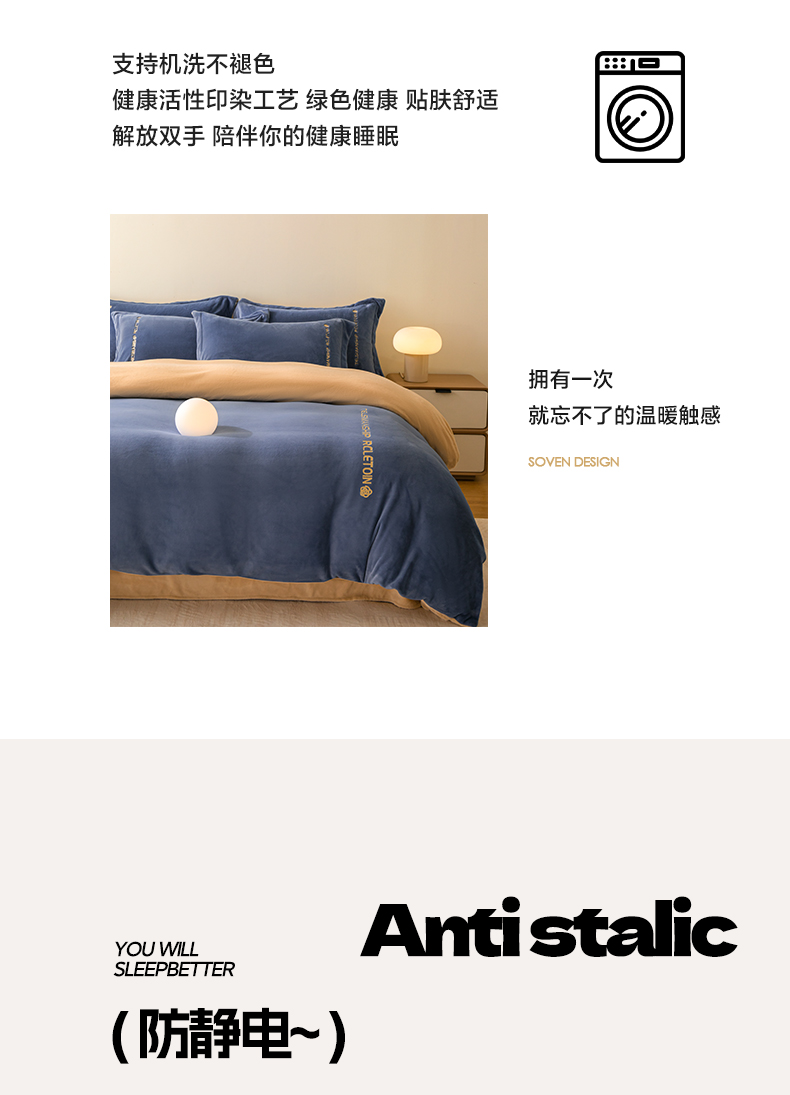 商品名称:花愿(原花纪) 2025新款牛奶绒撞色刺绣四件套—泽西 幸福蓝+香槟色