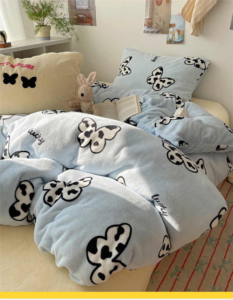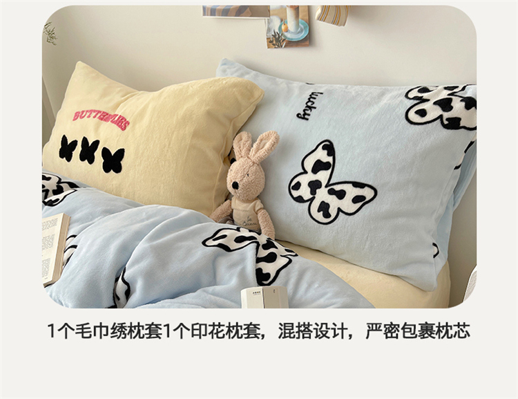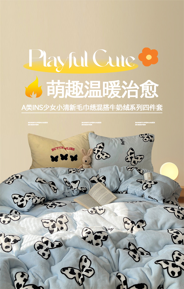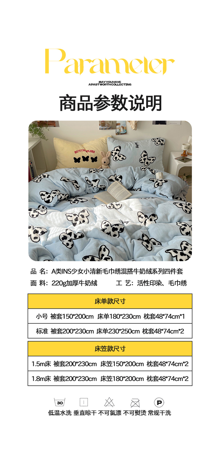 当前位置: 91家纺网 > 商品网购 > 床品套件 > 四件套 > 牛奶绒四件套 > 2024新款A类ins少女小清新蝴蝶爱心蝴蝶结毛巾绣混搭牛奶绒系列四件套 绒毛巾绣-奶牛蝴蝶蓝