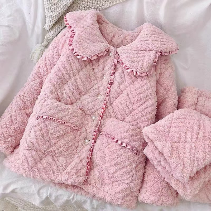 洛兰沙家居馆 2024新款公主风女秋冬季三层夹棉珊瑚绒加厚保暖两件套女士可外穿加绒家居服 L02