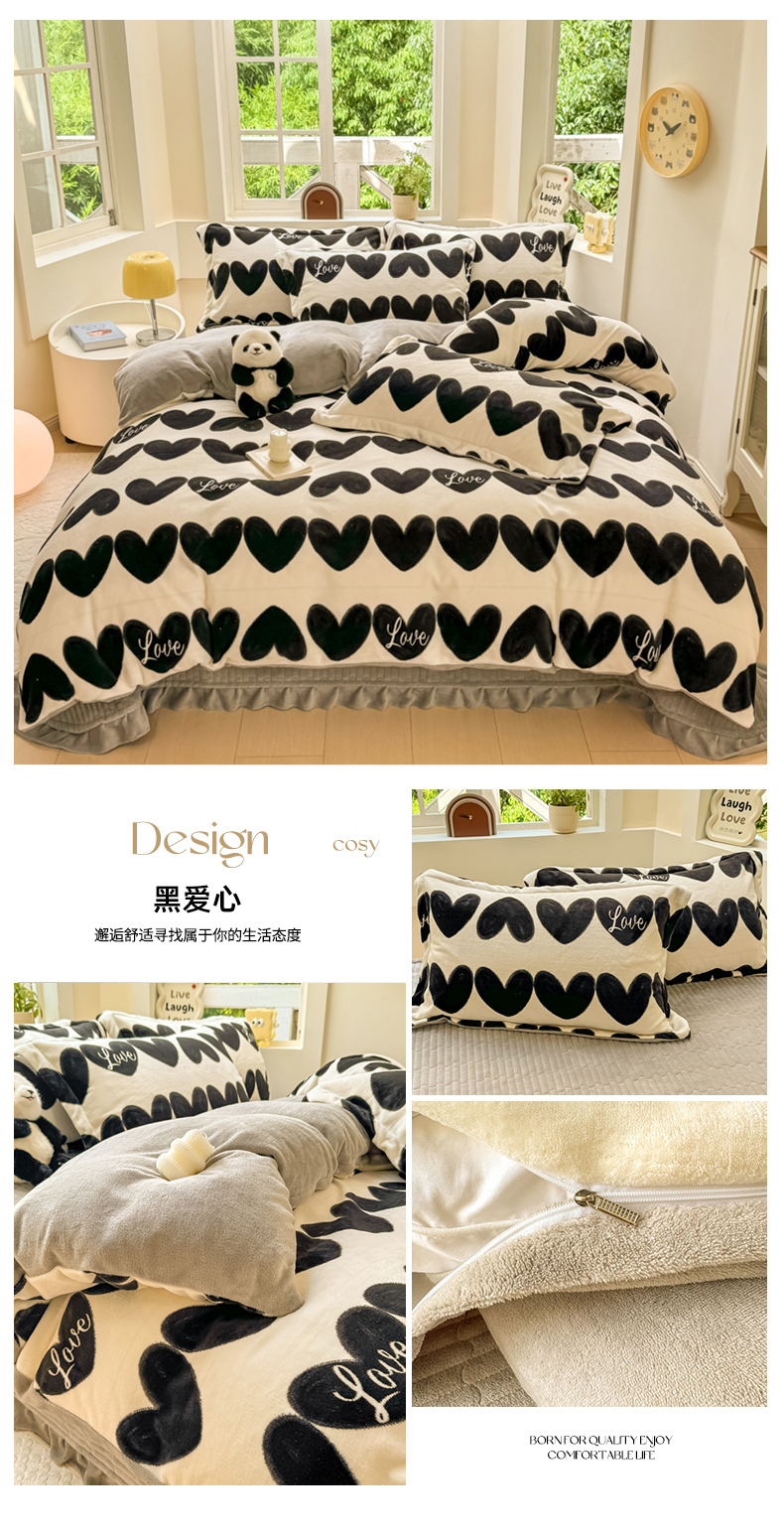 商品名称:尚美 2024新款高克重印花花边牛奶绒床盖四件套 黑爱心