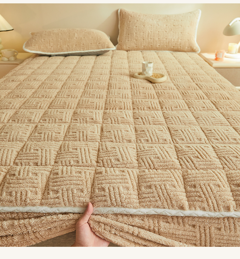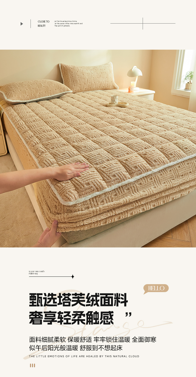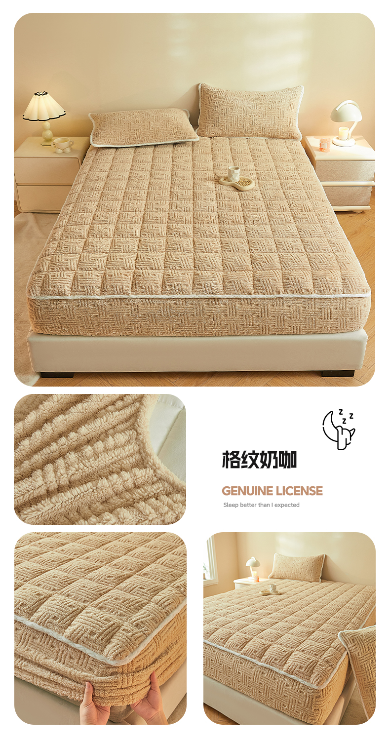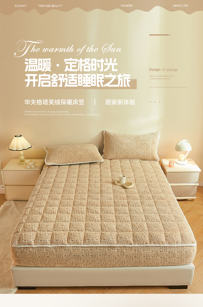 商品名称:卡伦家纺 2025新款塔芙绒方格纹加厚保暖夹棉床笠 格纹奶咖