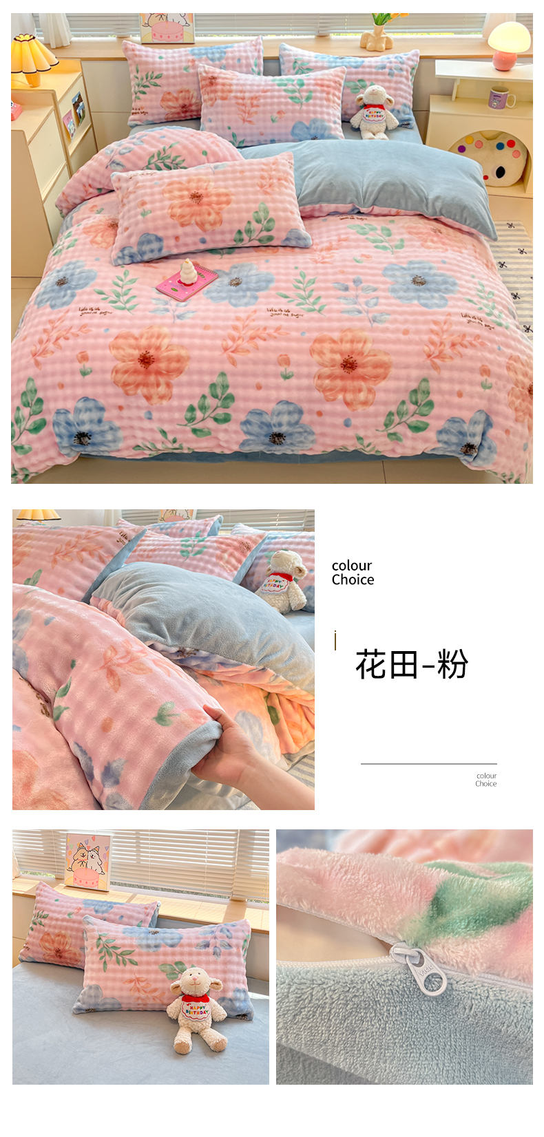 当前位置: 91家纺网 > 商品网购 > 床品套件 > 四件套 > 牛奶绒四件套 > 鸿羽樱(鸿羽樱)家纺 2024新款加厚泡泡牛奶绒印花工艺立体四件套 花田-粉