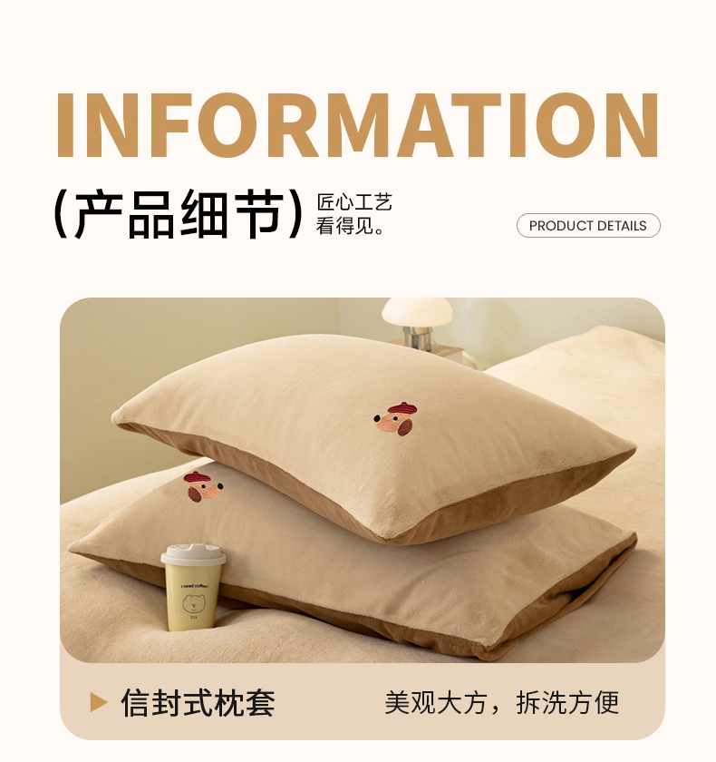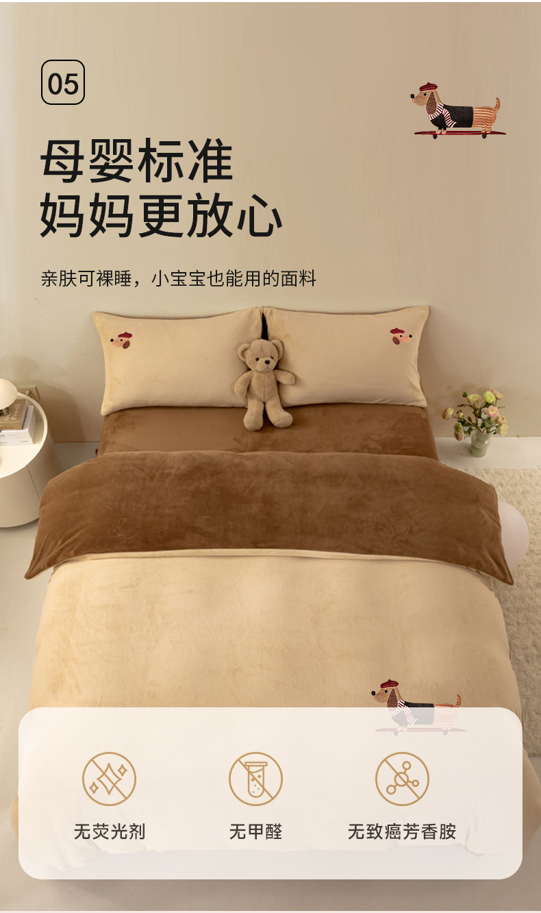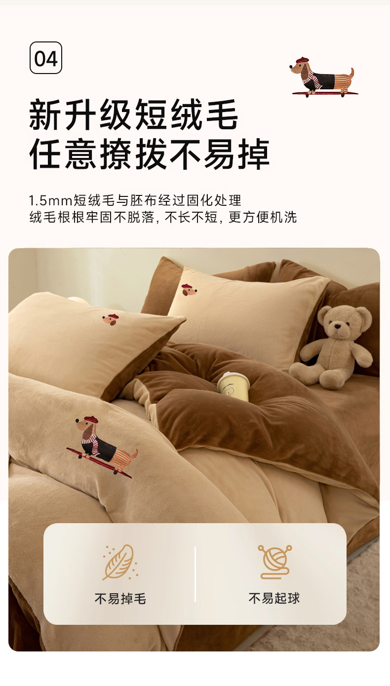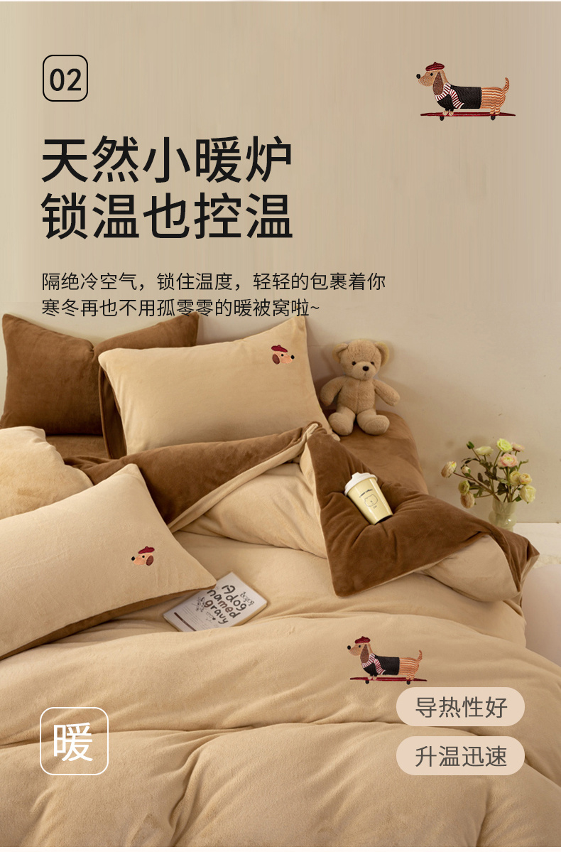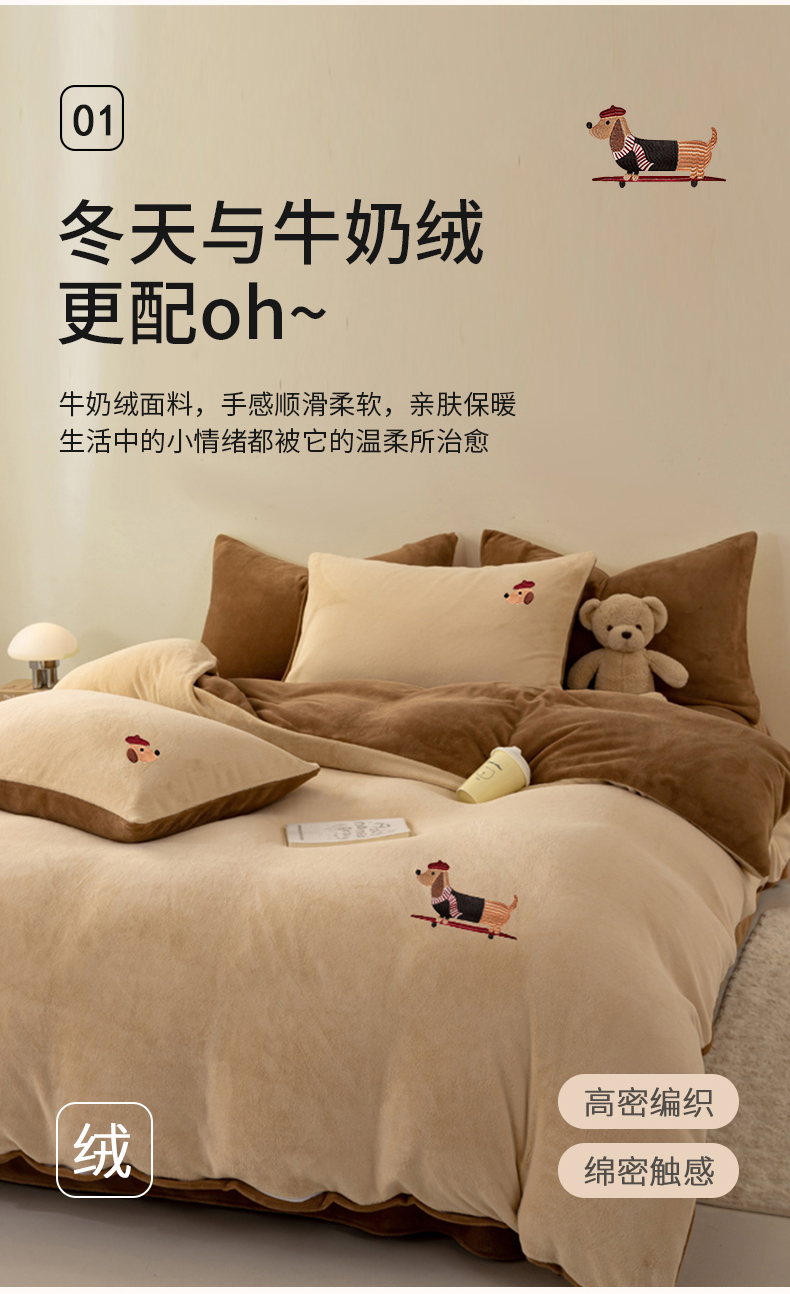 当前位置: 91家纺网 > 商品网购 > 床品套件 > 四件套 > 牛奶绒四件套 > 沐晴家纺 2024新品秋冬加厚牛奶绒纯色简约绣花卡通四件套 腊肠狗(米黄+深咖)