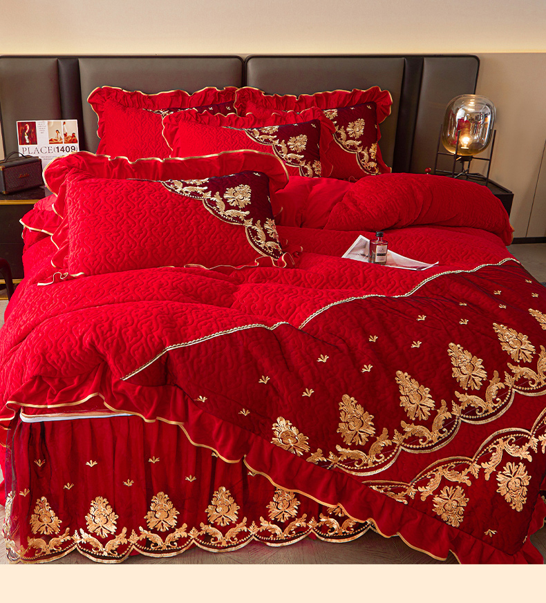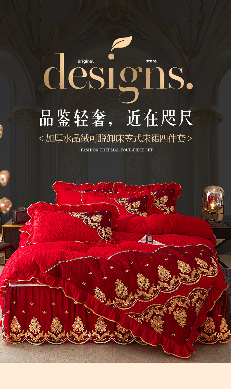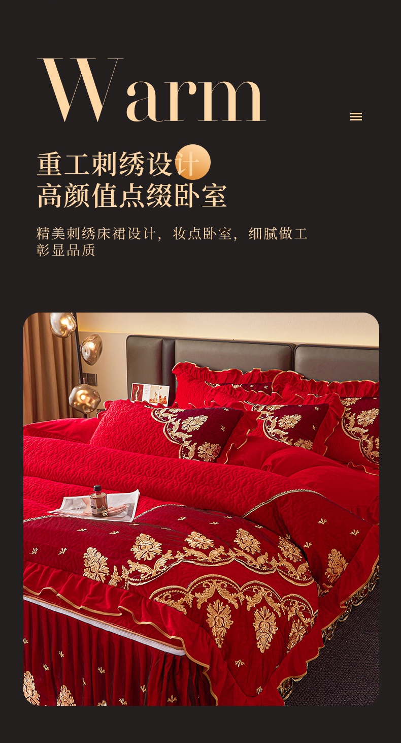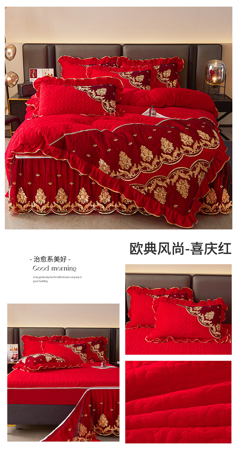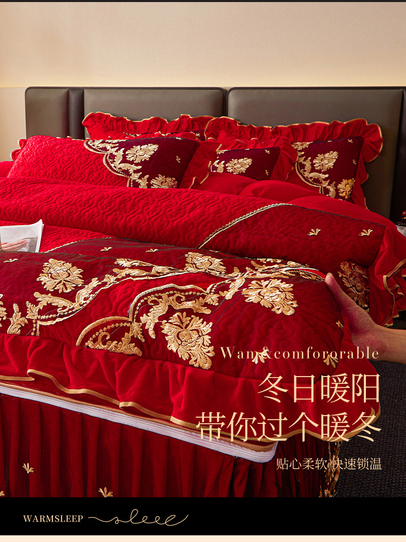当前位置: 91家纺网 > 商品网购 > 床品套件 > 四件套 > 水晶绒四件套 > 罗艺轩 2024新款高克重水晶绒夹棉床裙四件套-欧典风尚 欧典风尚-喜庆红