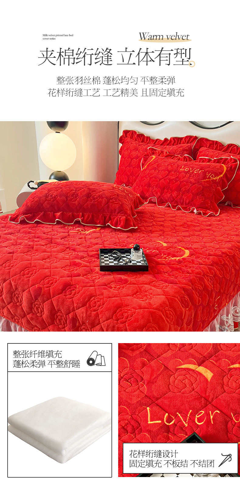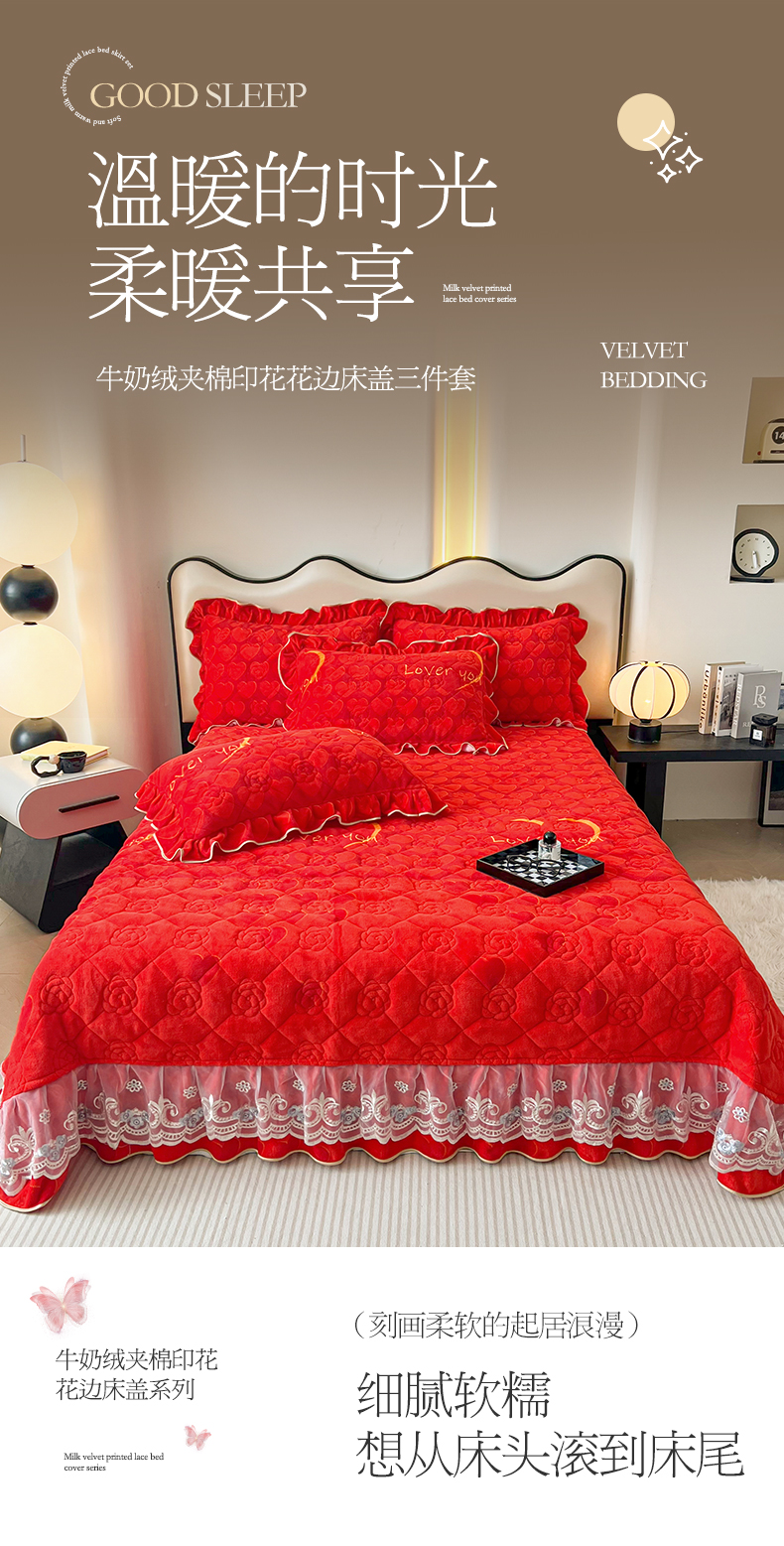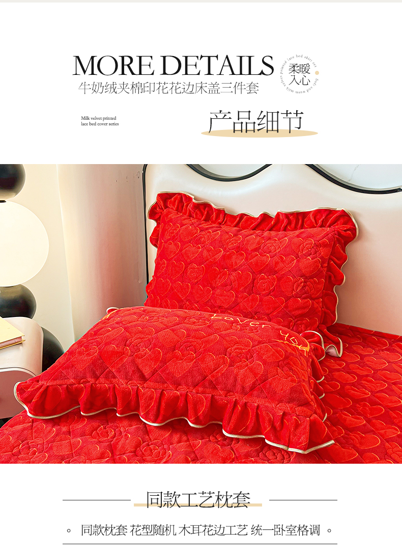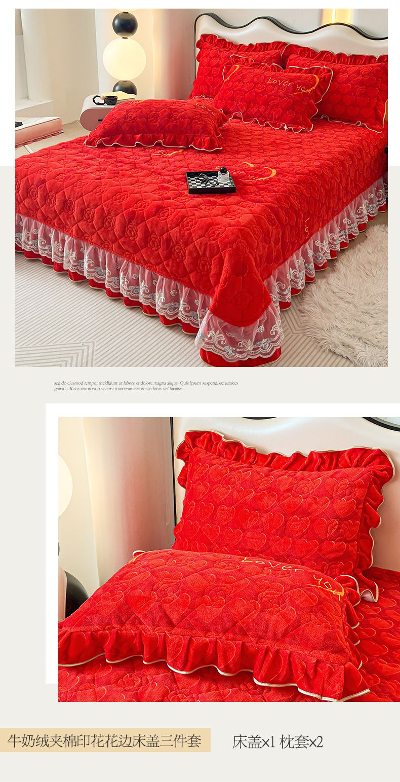当前位置: 91家纺网 > 商品网购 > 床品套件 > 三件套 > 宜凡家纺 2024新款牛奶绒印花夹棉花边床盖三件套 心动时刻 大红