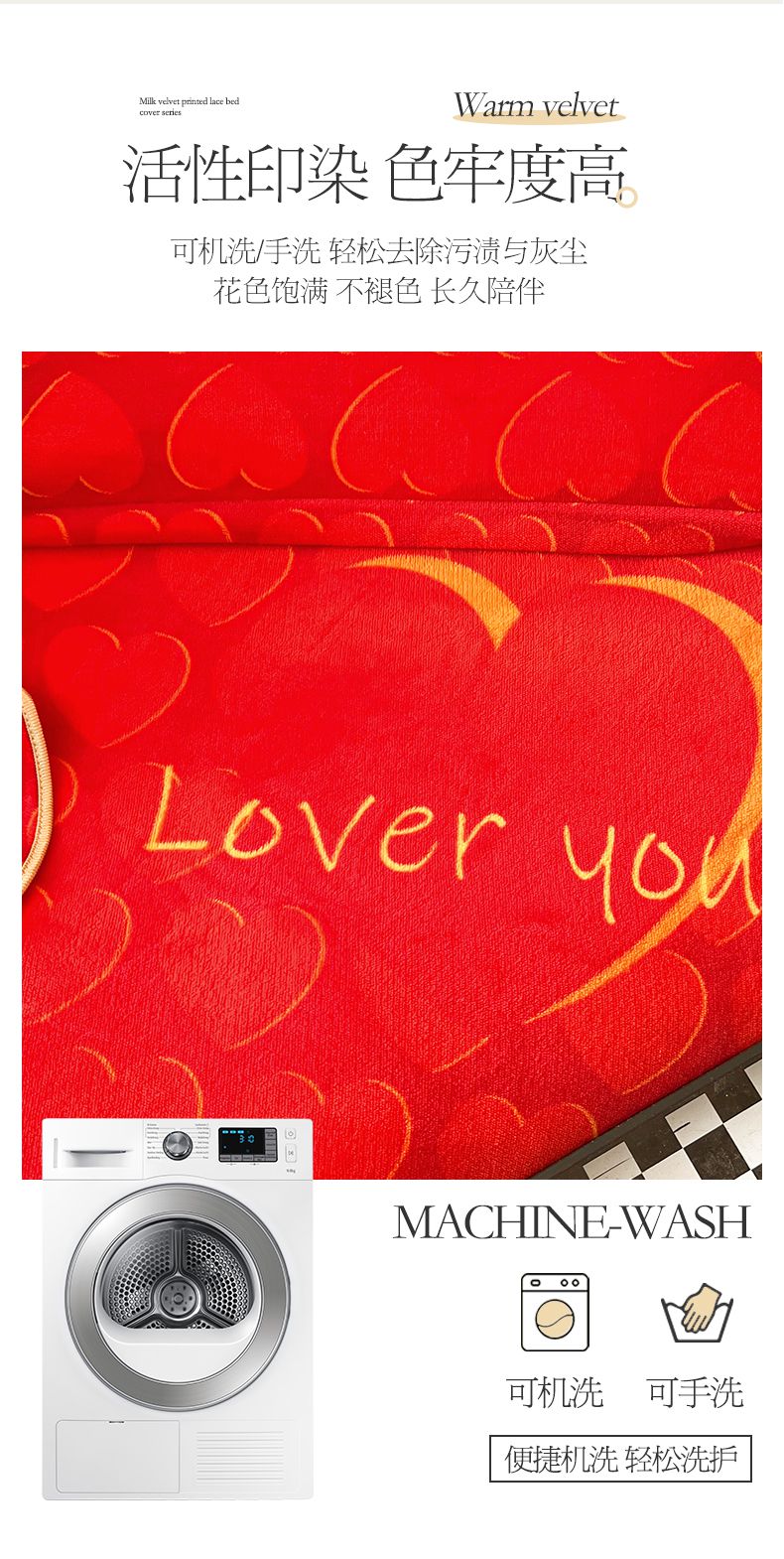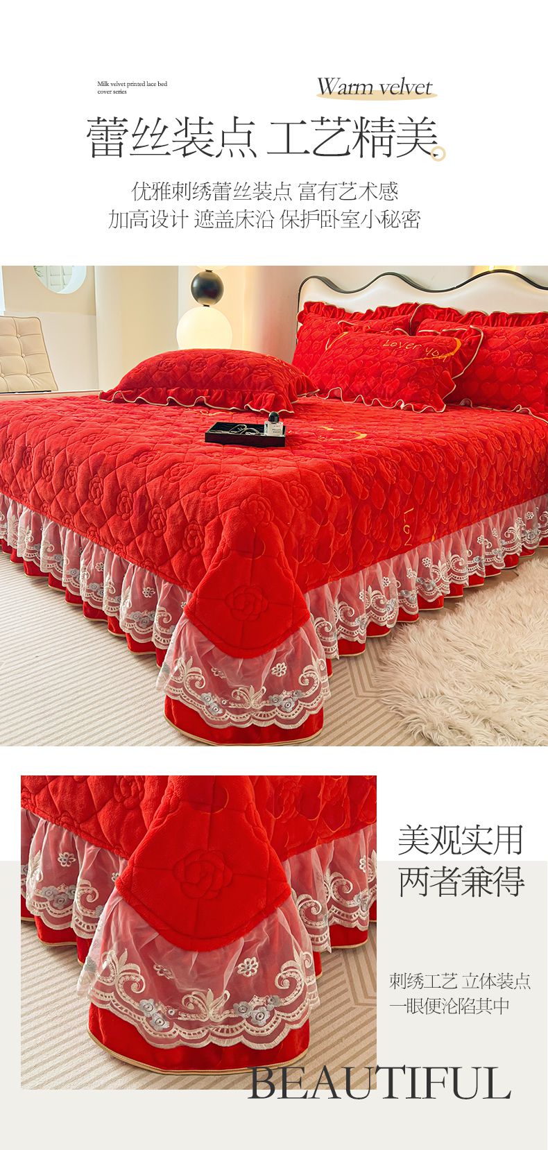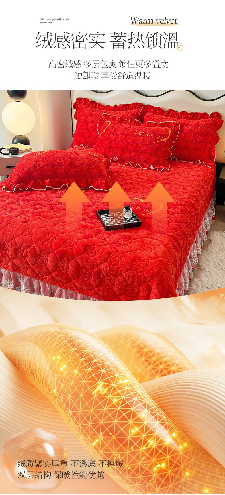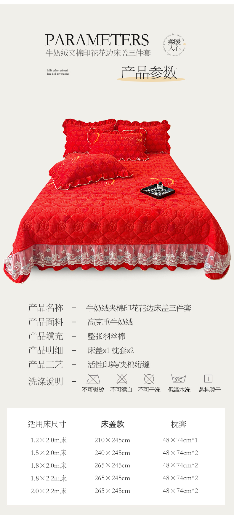 当前位置: 91家纺网 > 商品网购 > 床品套件 > 三件套 > 宜凡家纺 2024新款牛奶绒印花夹棉花边床盖三件套 心动时刻 大红