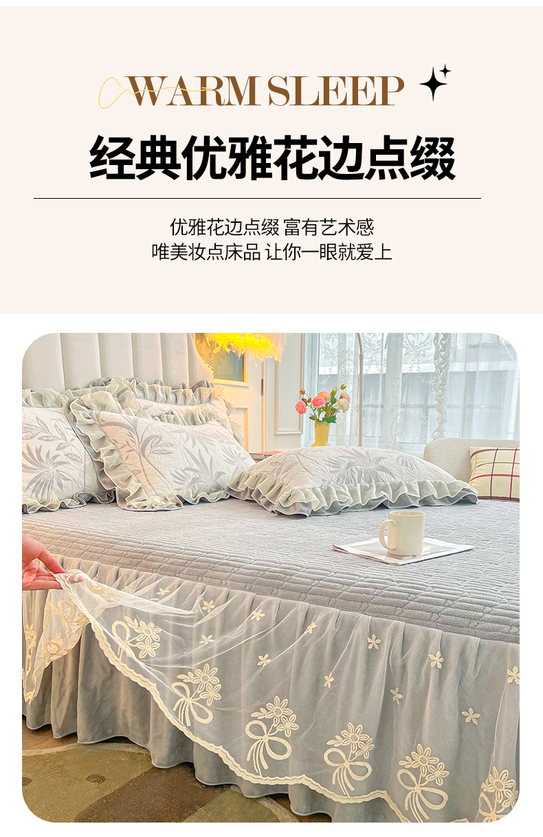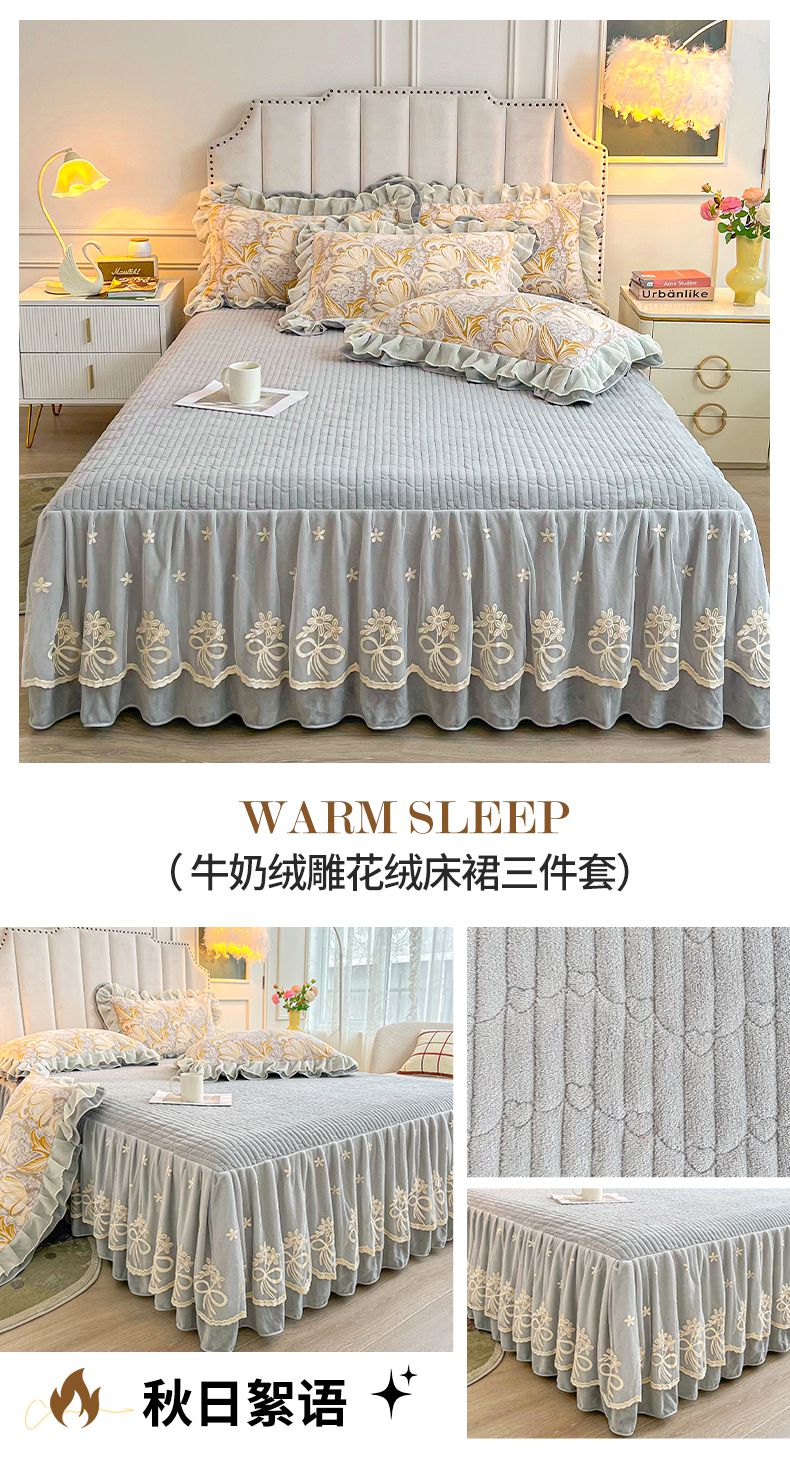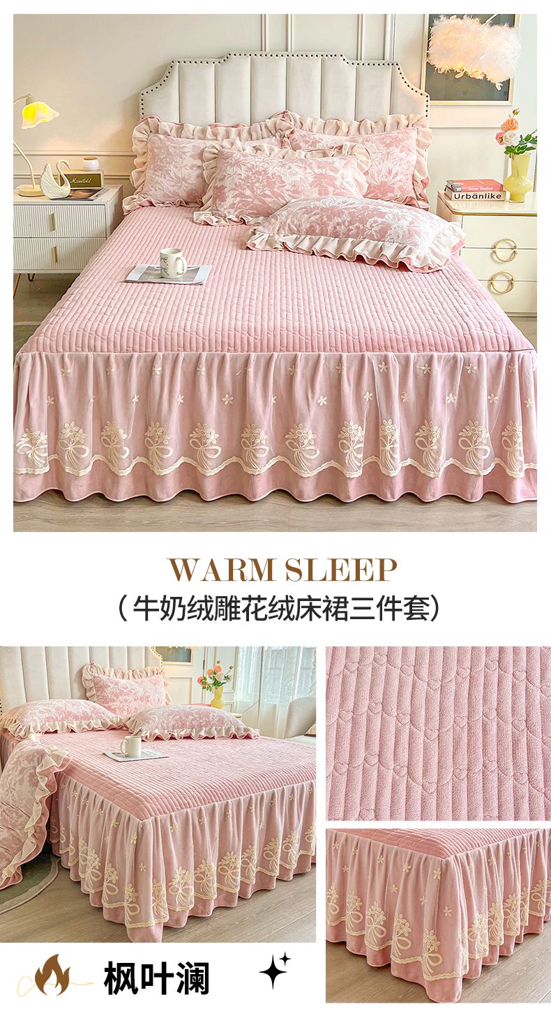 当前位置: 91家纺网 > 商品网购 > 床品套件 > 三件套 > 宜凡家纺 2024新款牛奶绒雕花绒床裙三件套 幽兰情