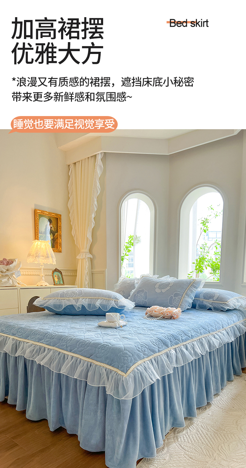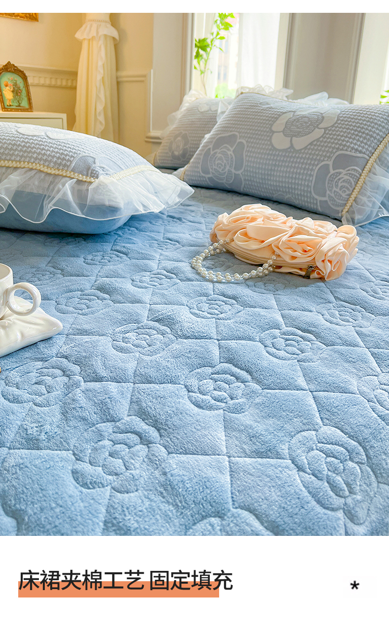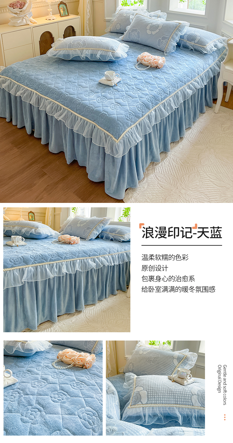 商品名称:麒豆豆 2024新款雕花绒床裙三件套-浪漫印记 浪漫印记-天蓝