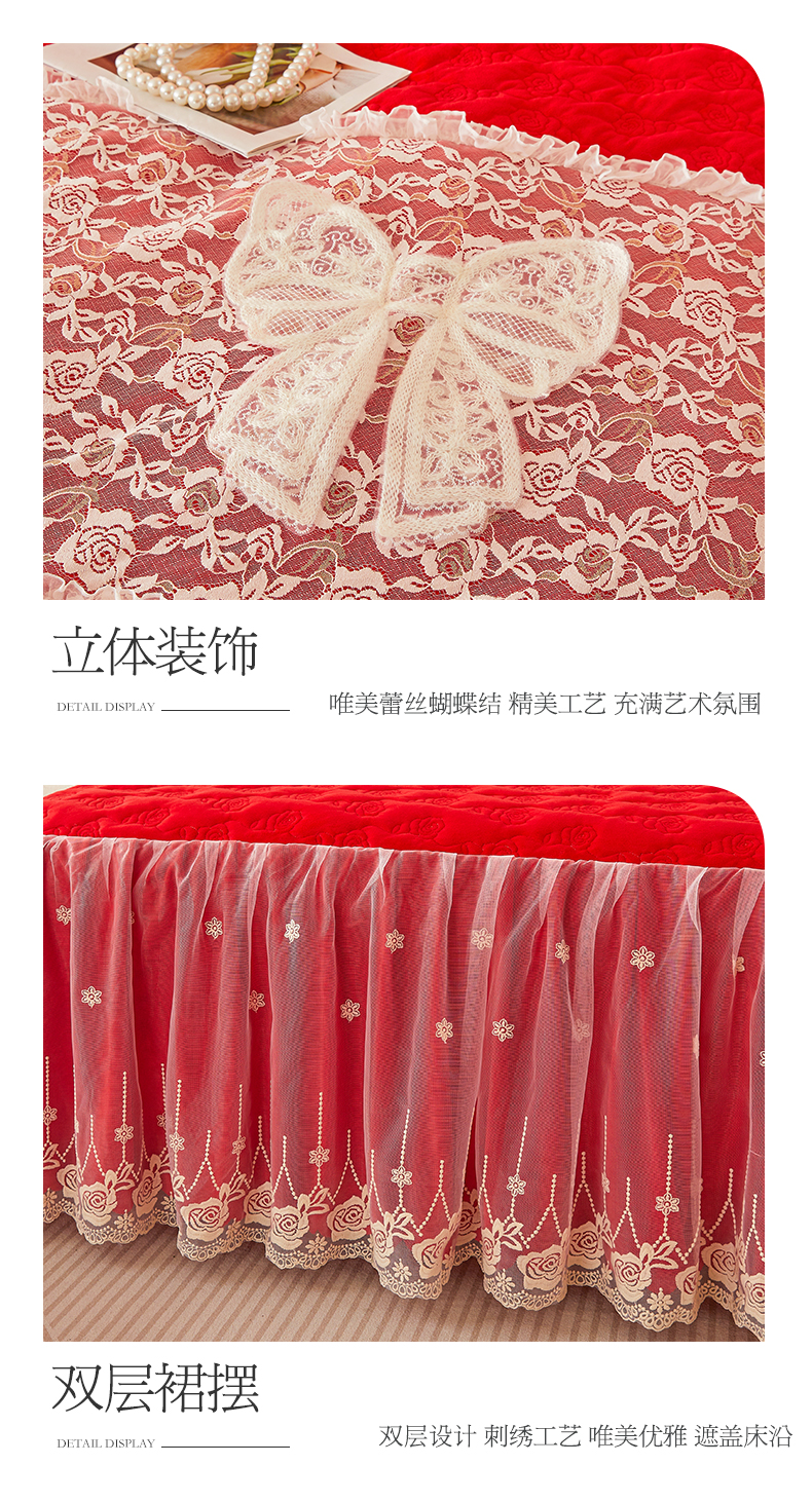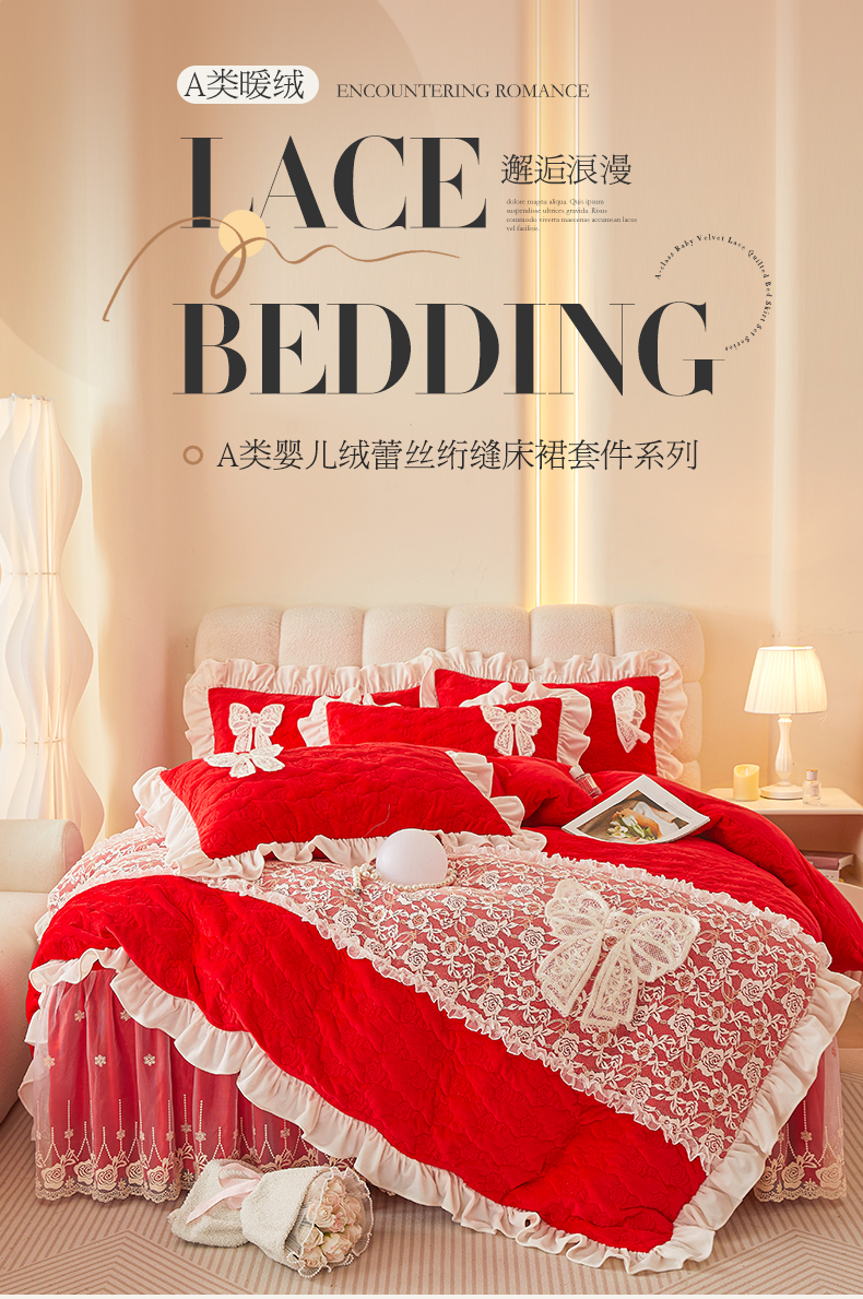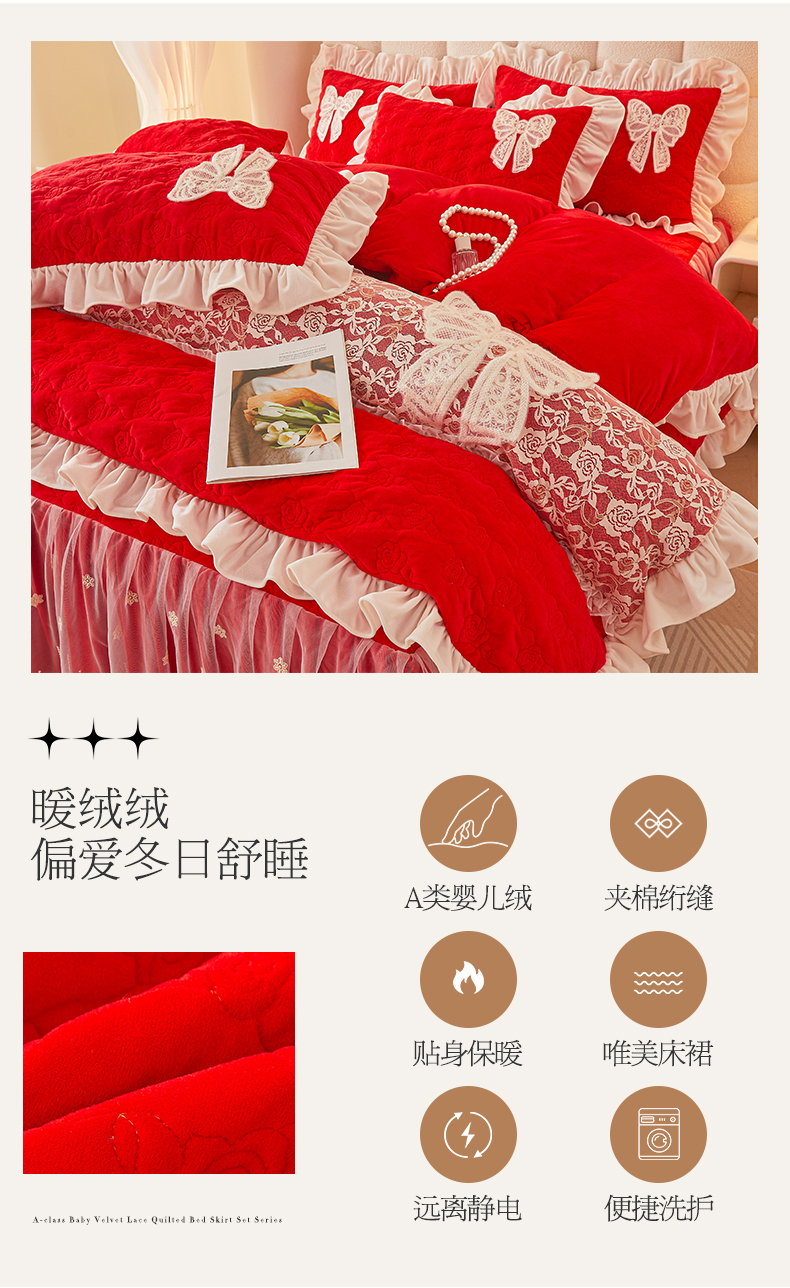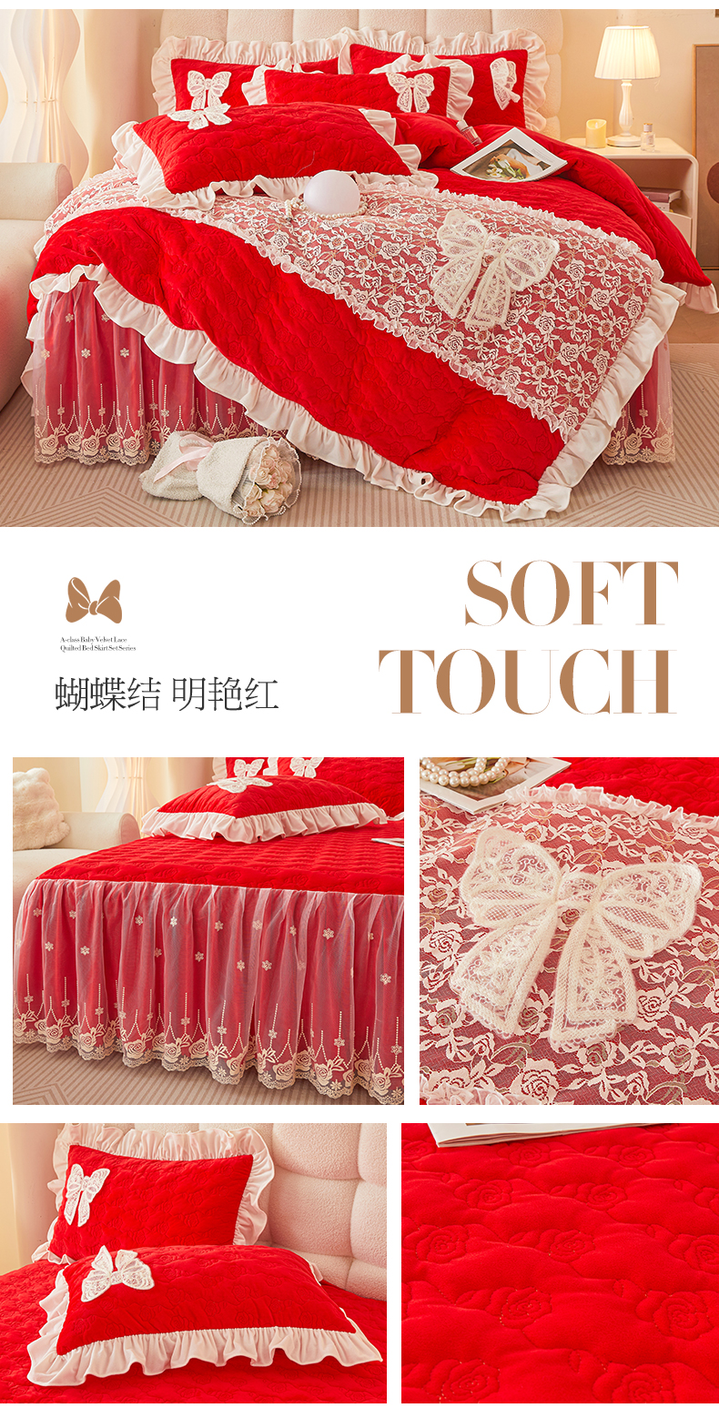 情恒家纺 2025新款A类婴儿绒全夹棉奶油风(蝴蝶结)床裙款四件套 蝴蝶结明艳红