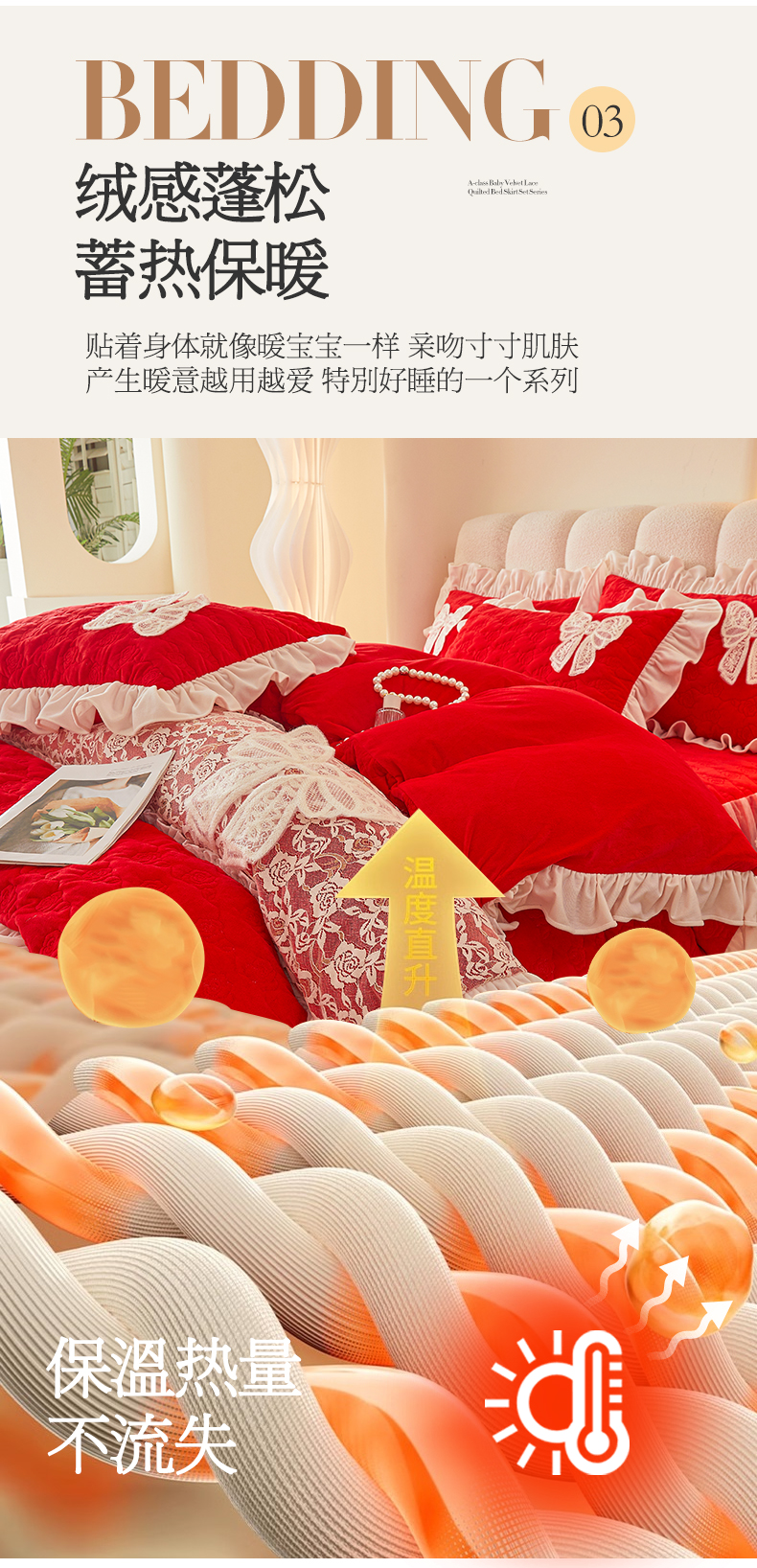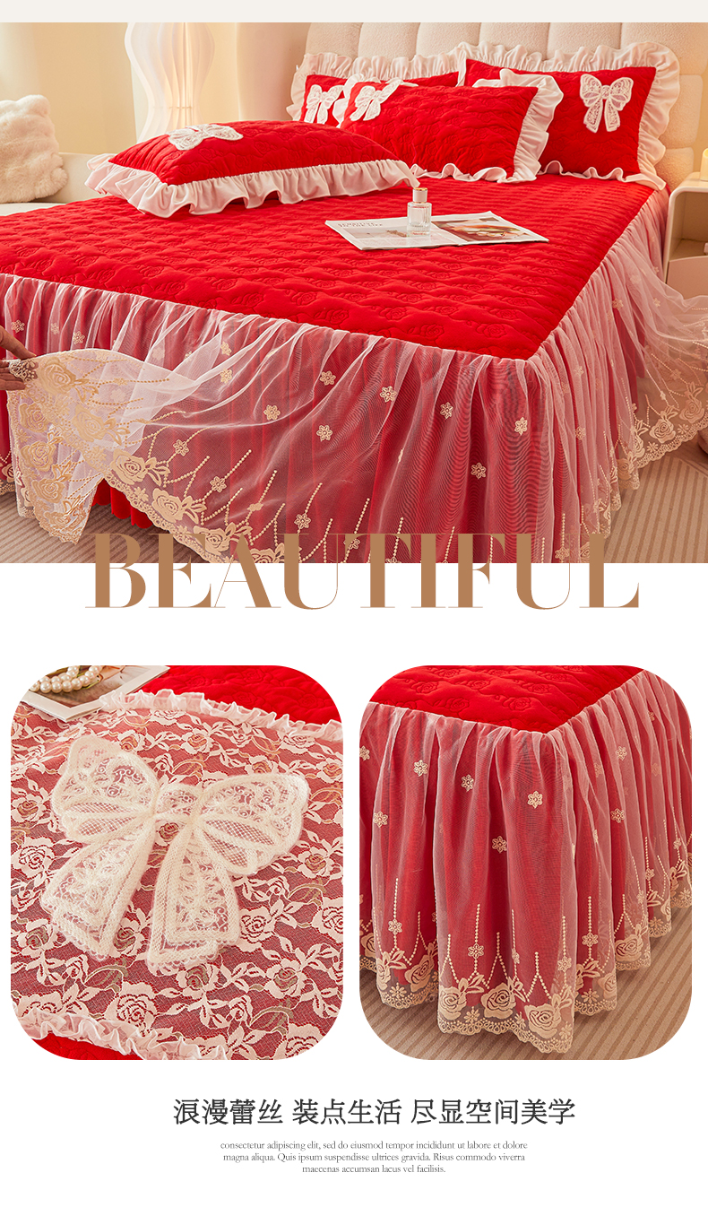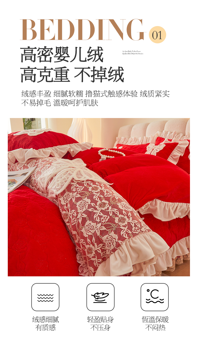 情恒家纺 2025新款A类婴儿绒全夹棉奶油风(蝴蝶结)床裙款四件套 蝴蝶结明艳红