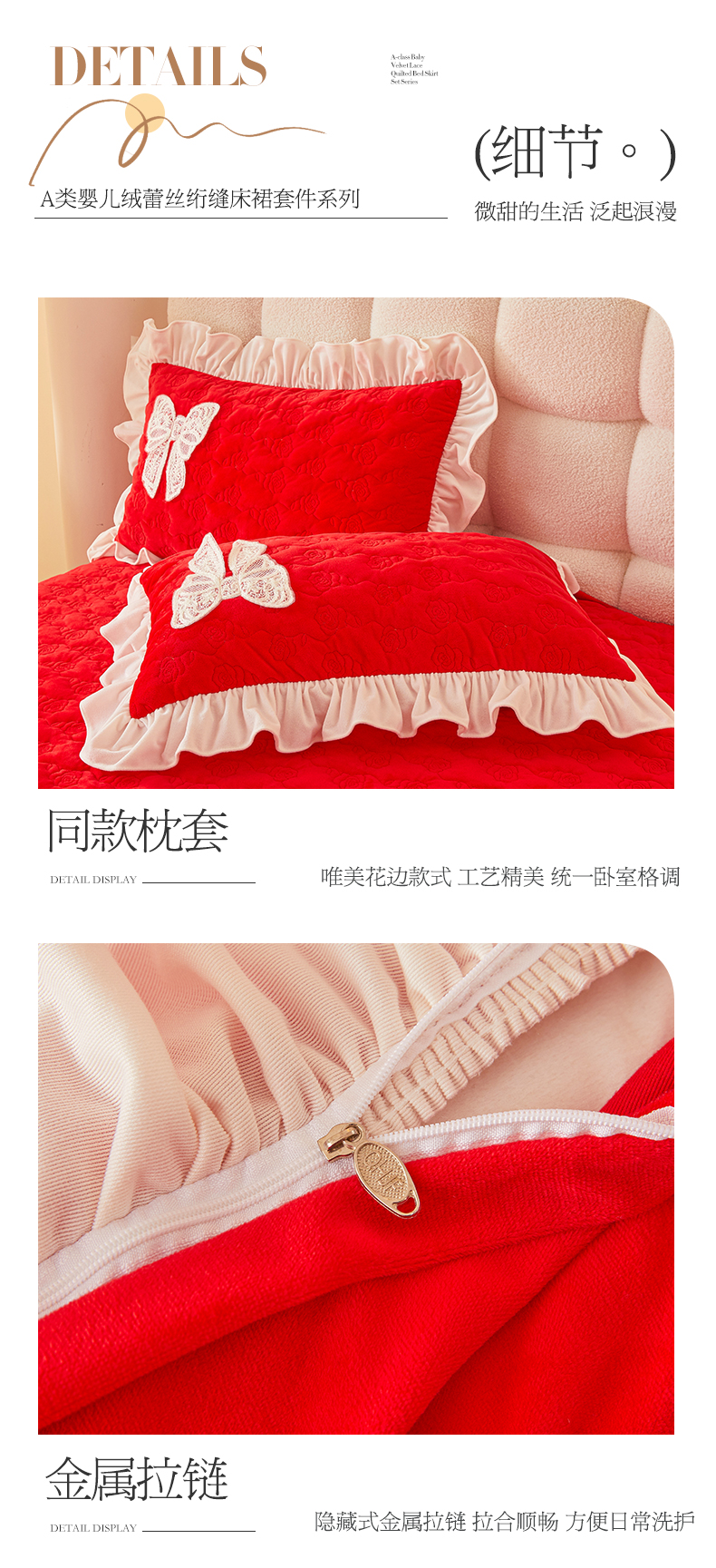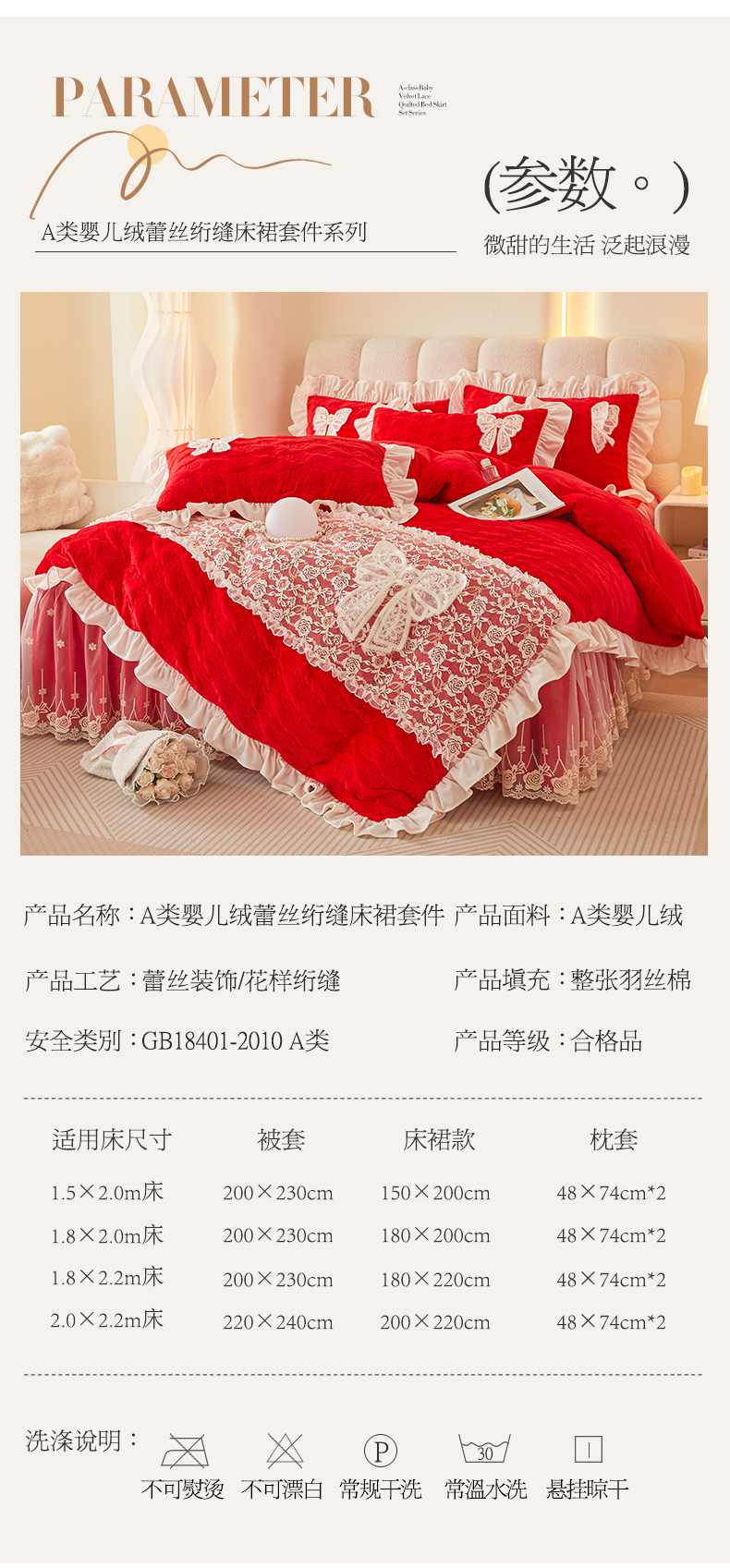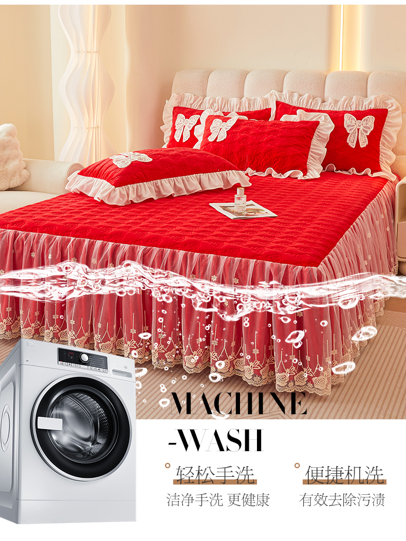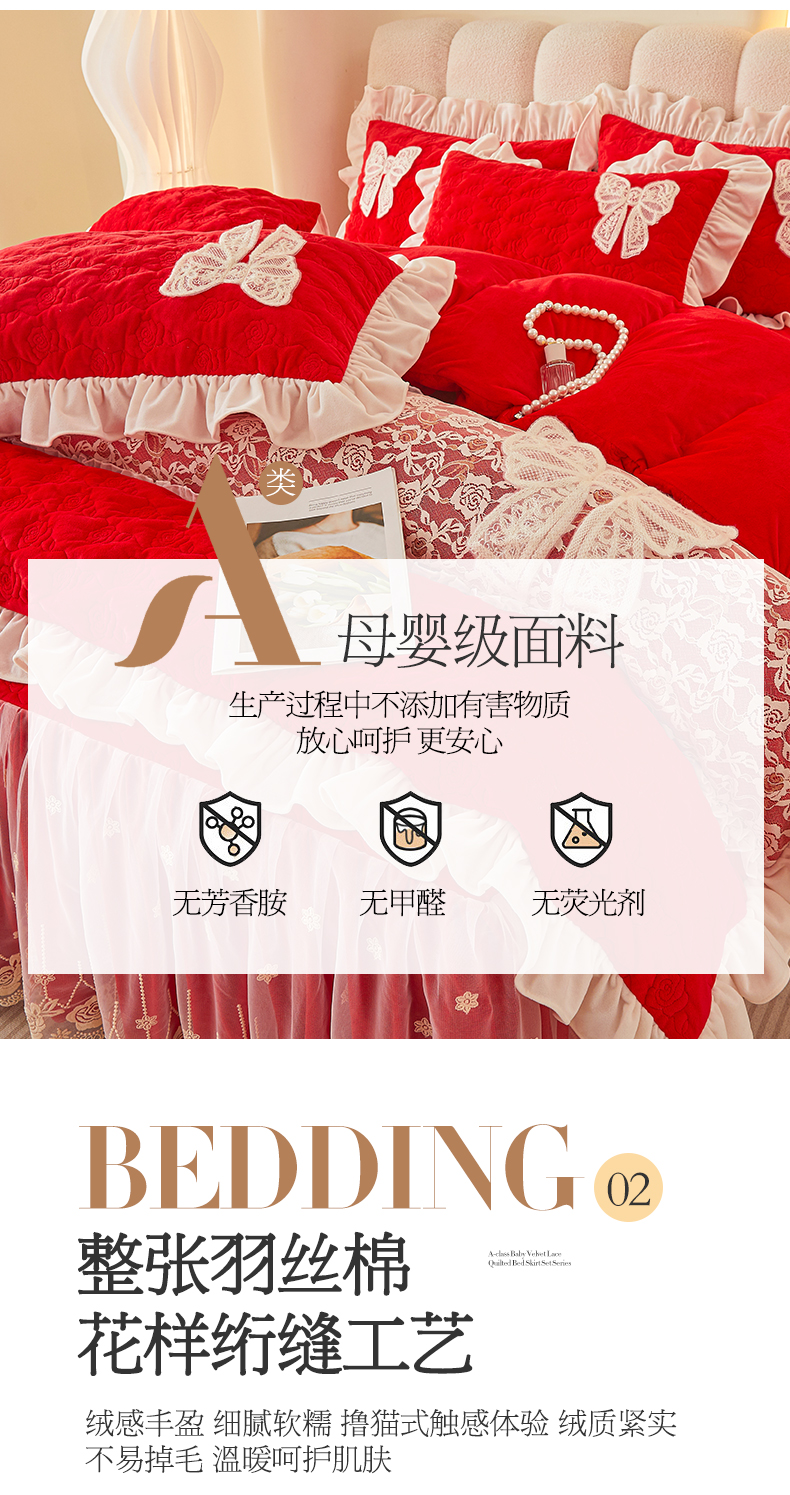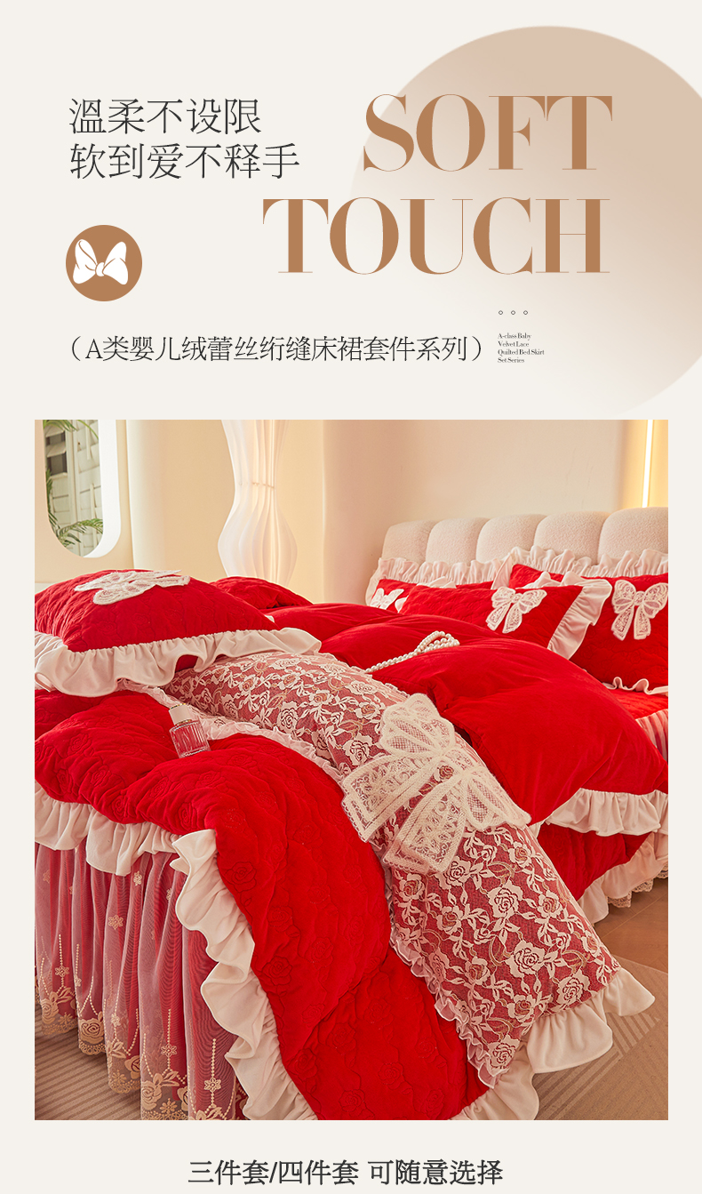 商品名称:情恒家纺 2025新款A类婴儿绒全夹棉奶油风(蝴蝶结)床裙款四件套 蝴蝶结明艳红