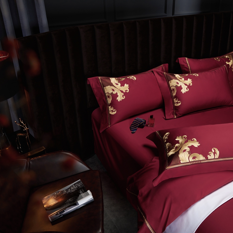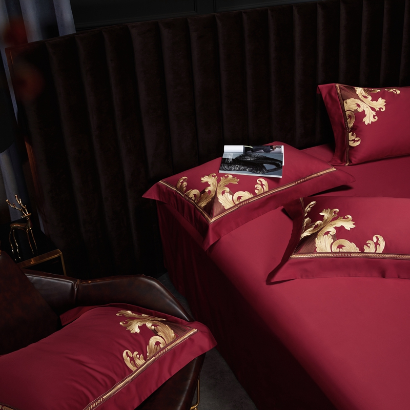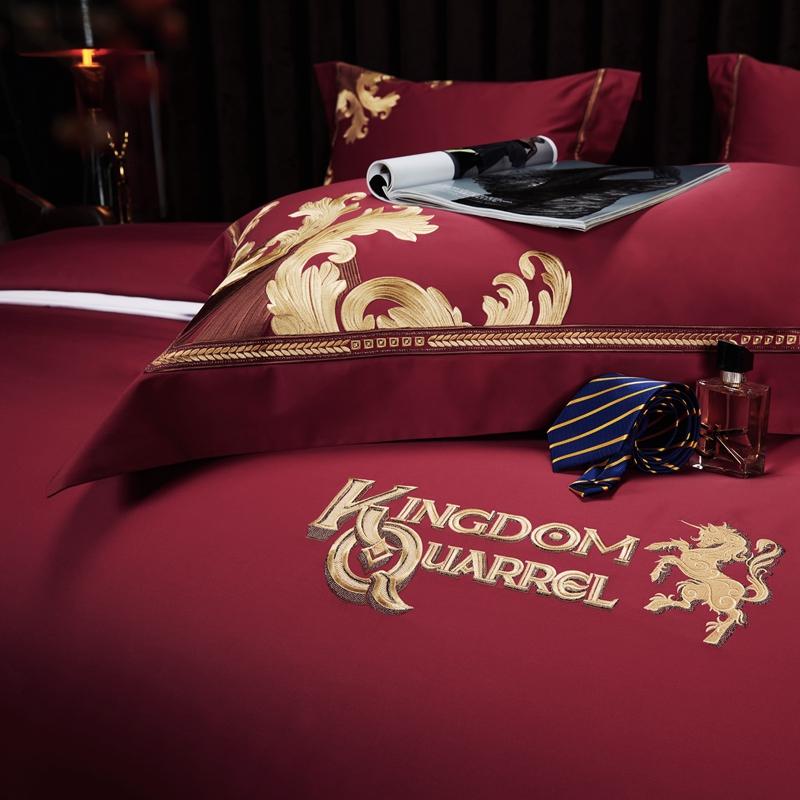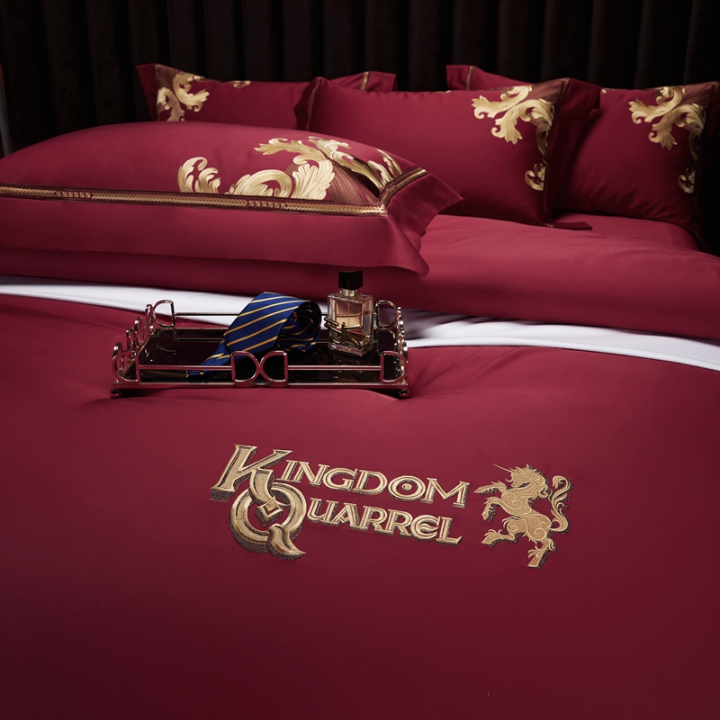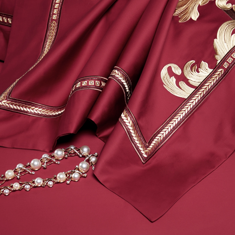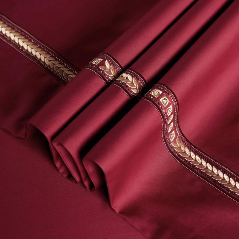 商品名称:缔缦 2024新款定织新布种S140系列刺绣拼角工艺四件套-威廉皇室 威廉皇室 酒红