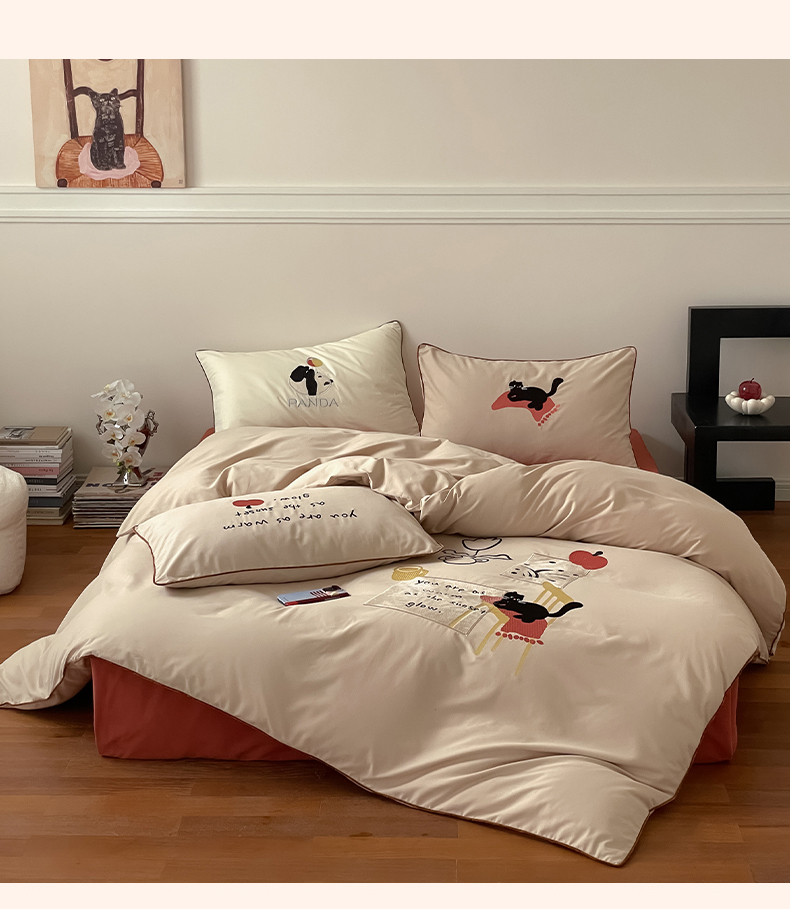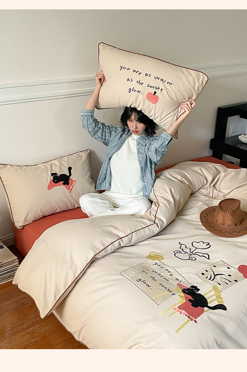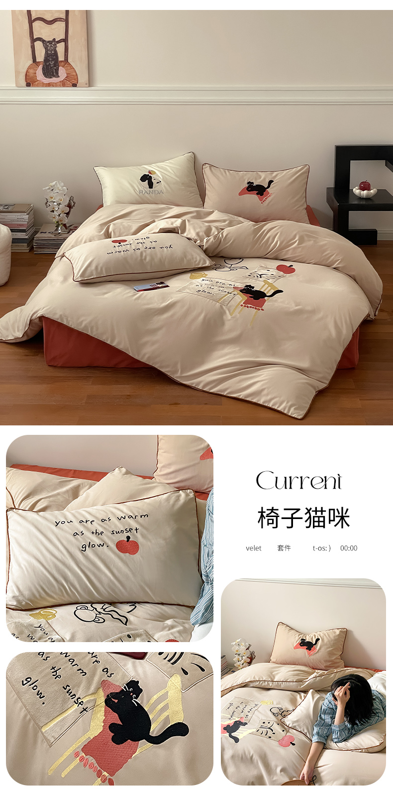 圆岛家纺 2024秋冬全棉磨毛刺绣贴布绣卡通四件套 椅子猫咪