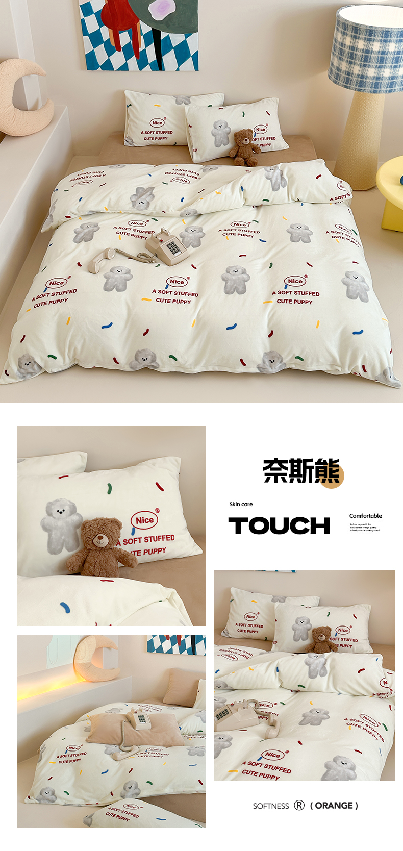 商品名称:三味舒屋 2025新款卡通印花牛奶绒单被套枕套床笠 奈斯熊