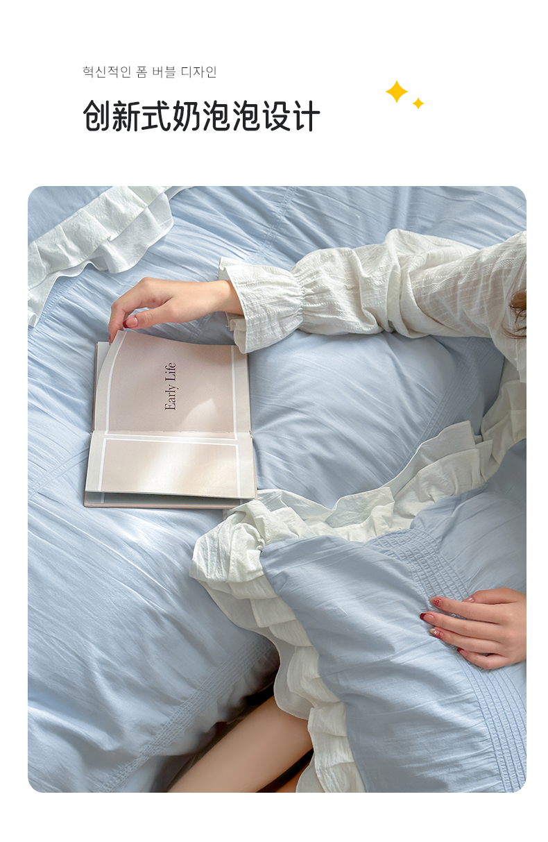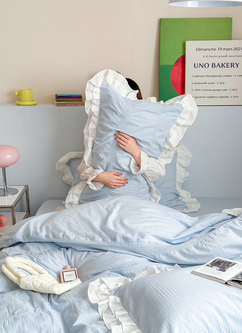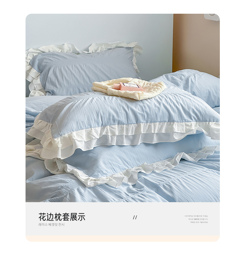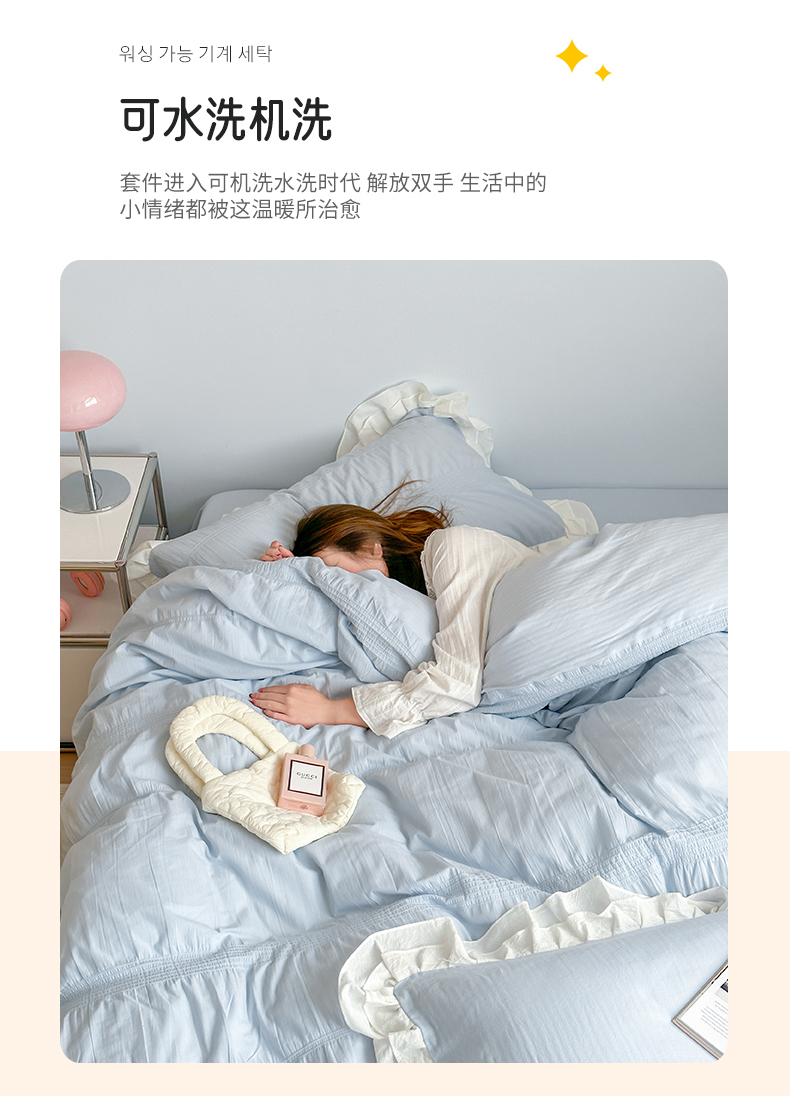 尺素 2024新款韩版ins花边款双人1.8四件套水洗棉泡泡纱被套人字纹床单 奶泡泡-也许雾蓝