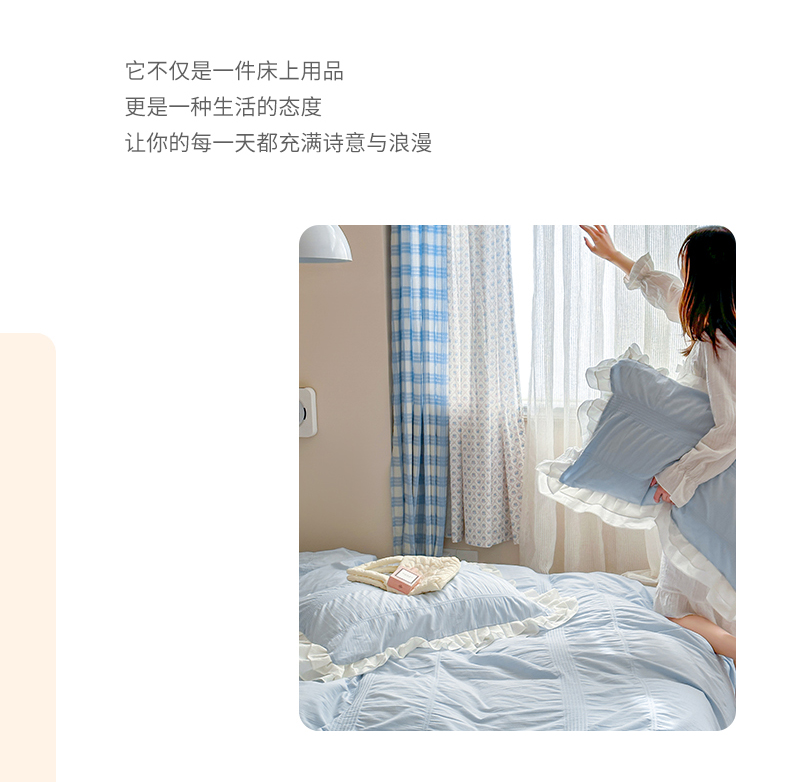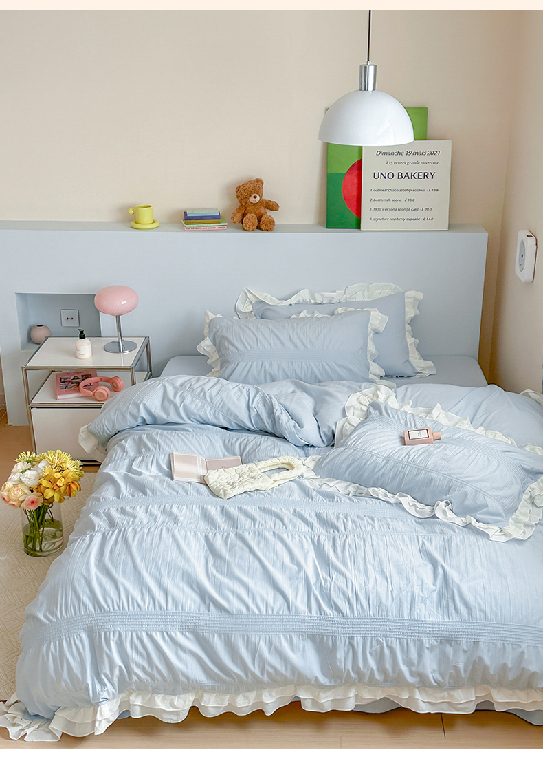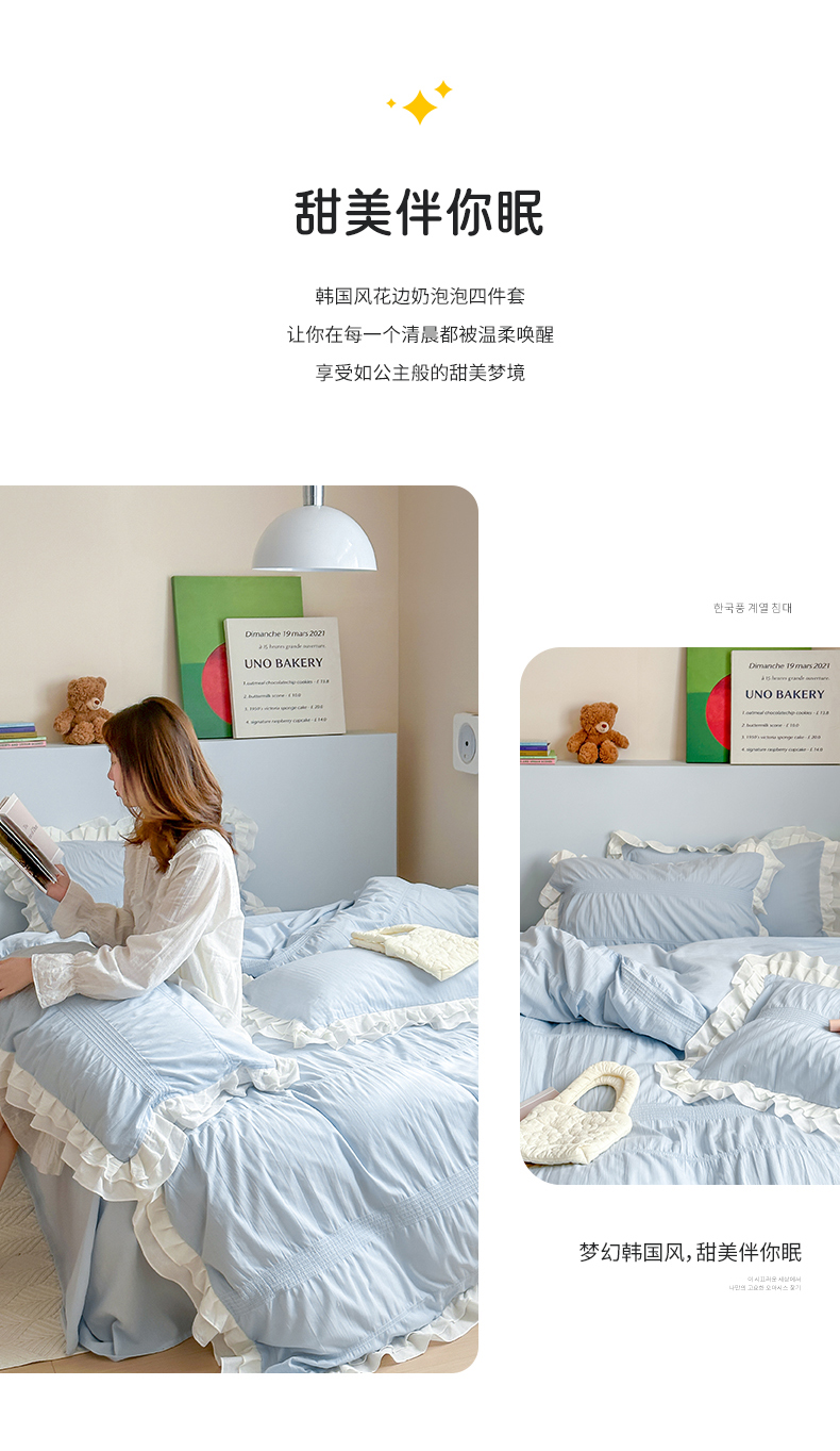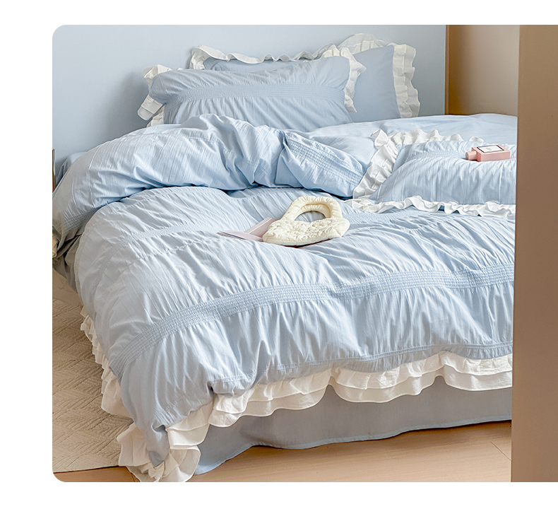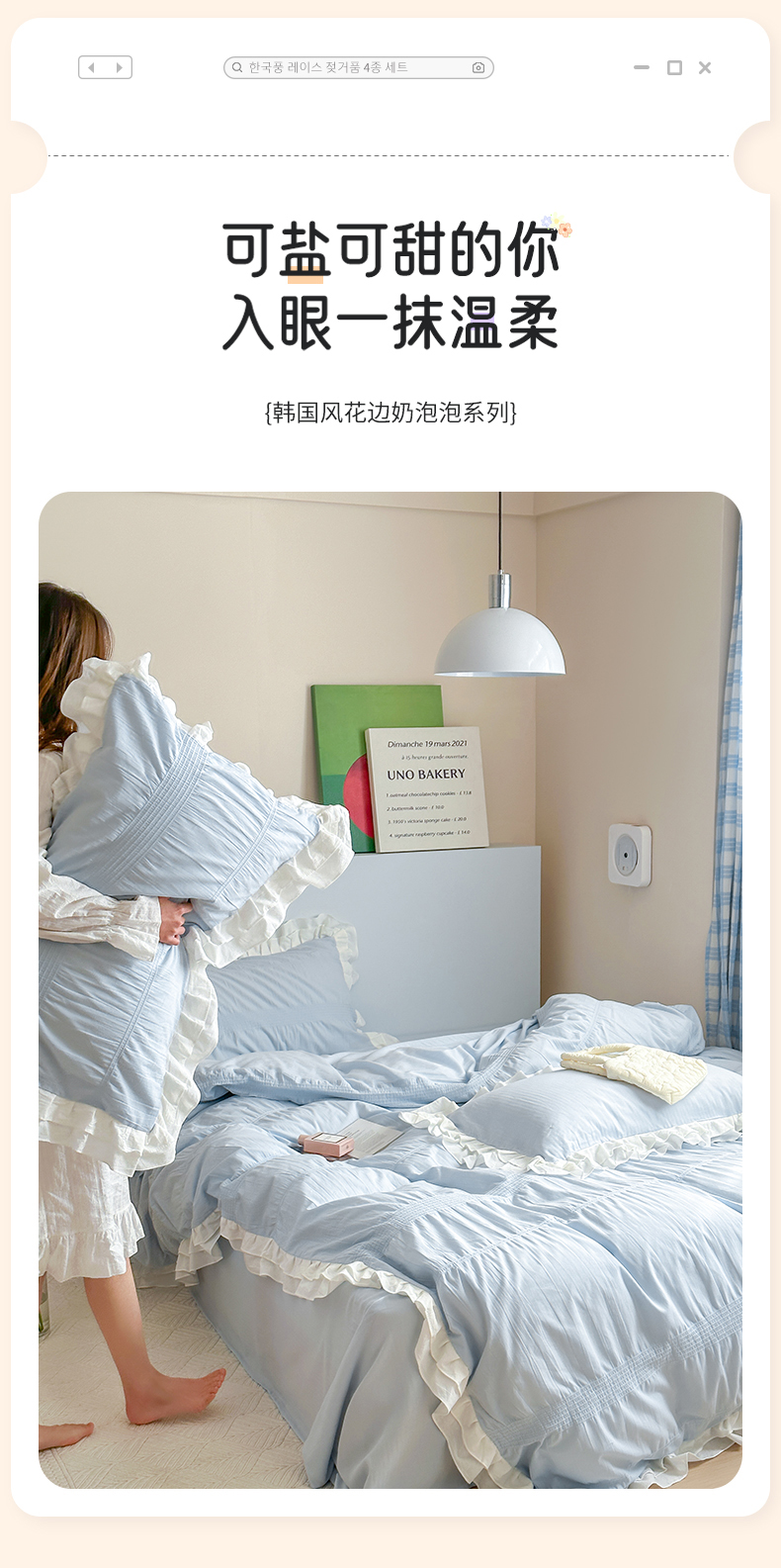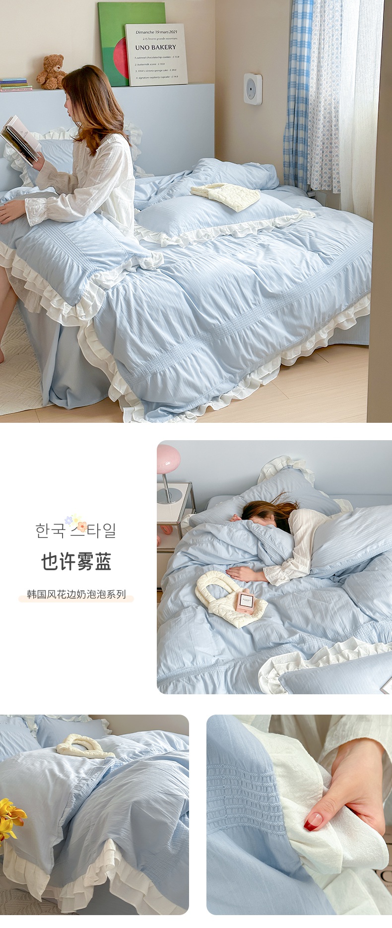 商品名称:尺素 2024新款韩版ins花边款双人1.8四件套水洗棉泡泡纱被套人字纹床单 奶泡泡-也许雾蓝