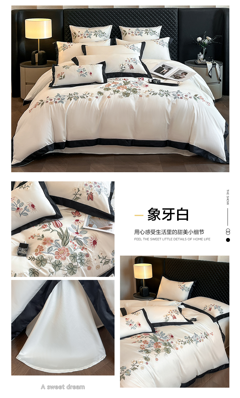 2025新款亲肤棉撞色拼角绣花四件套-可可西里 象牙白