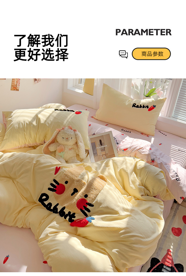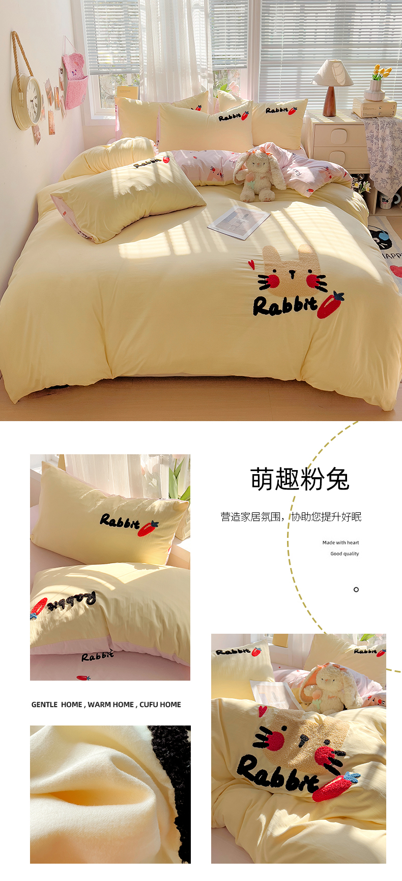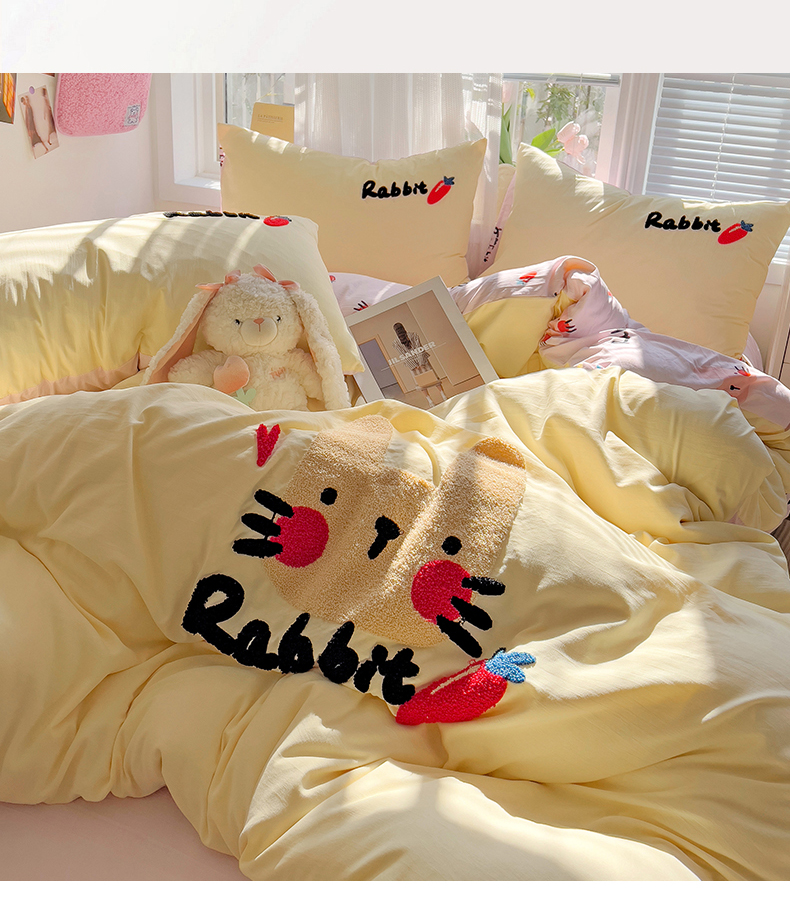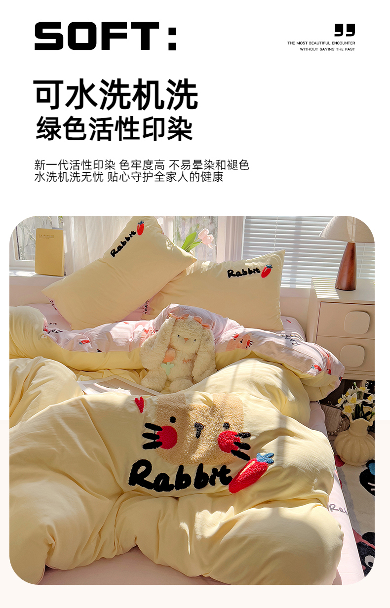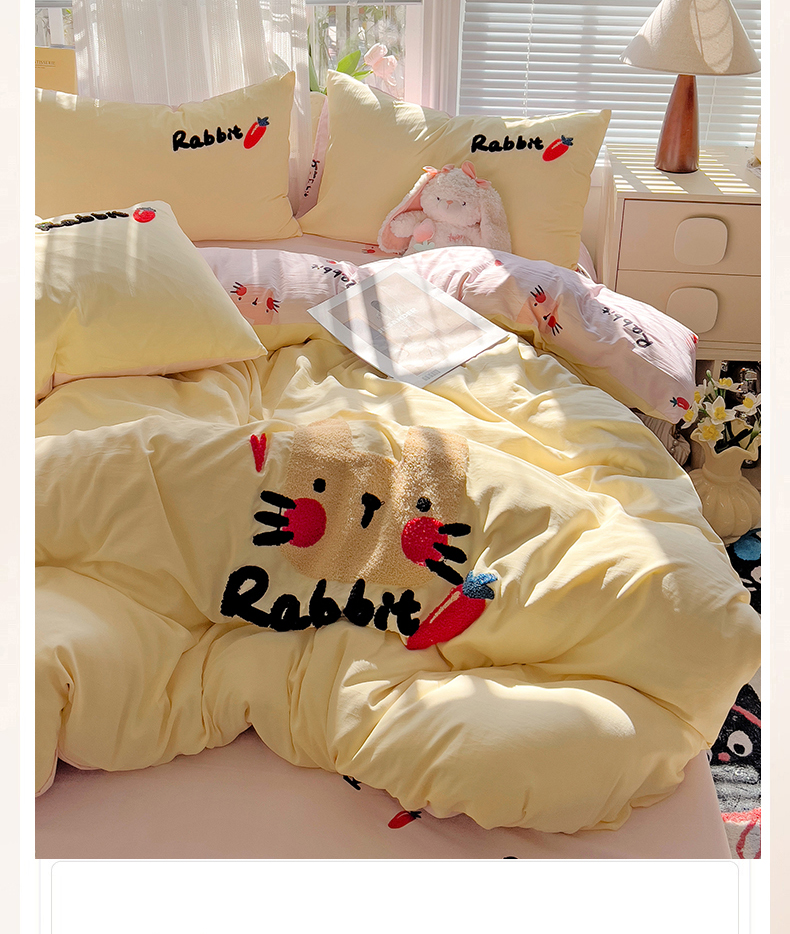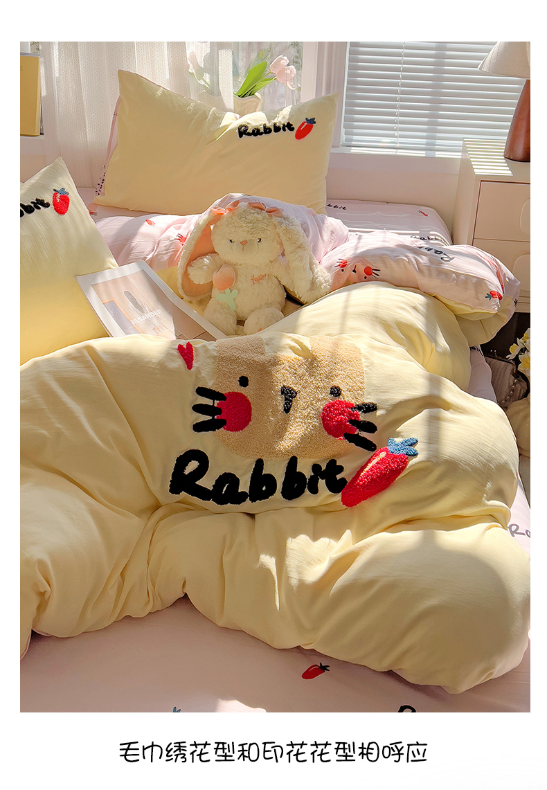 当前位置: 91家纺网 > 商品网购 > 床品套件 > 四件套 > 水洗棉四件套 > 凯洛奇 2025新款1卡通水洗棉印+绣毛巾绣四件套 萌趣粉兔