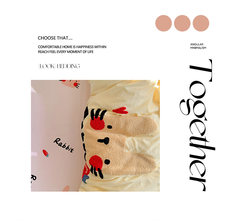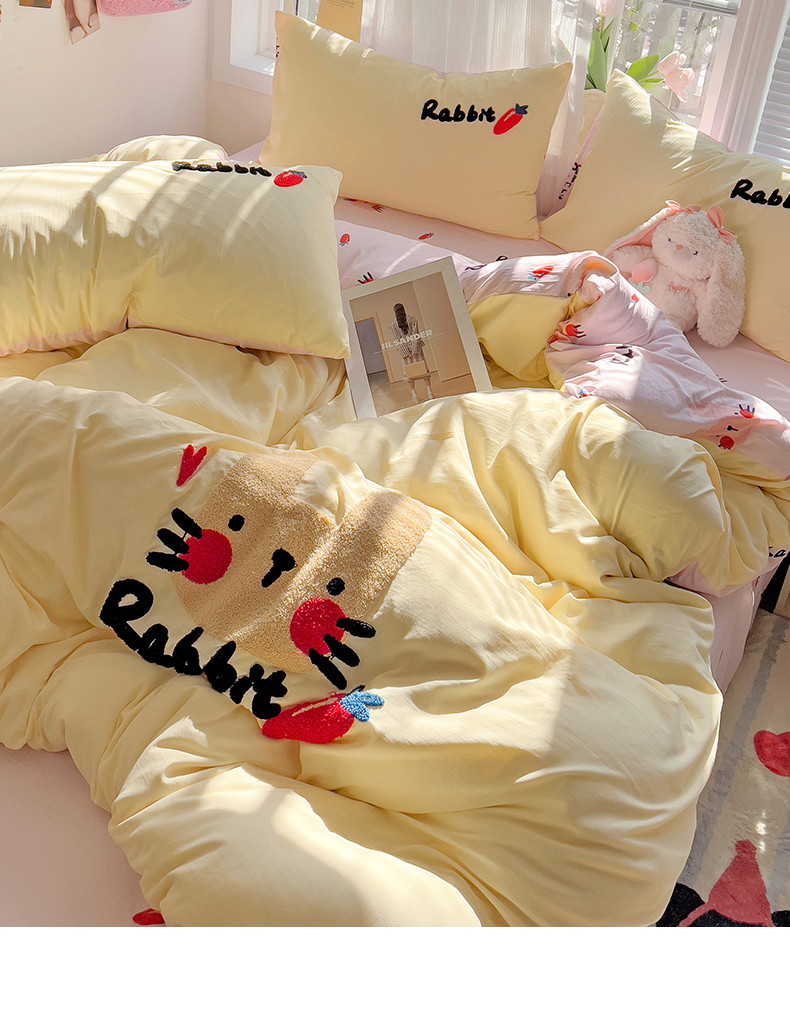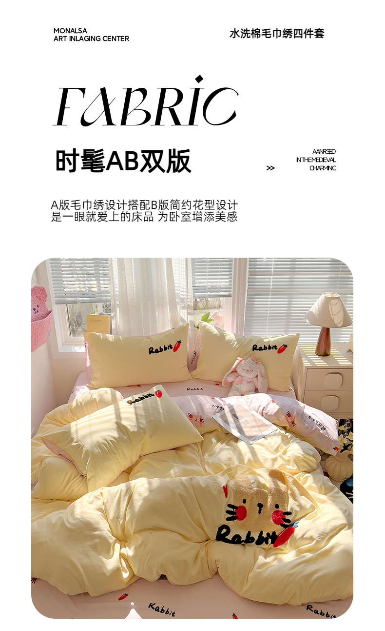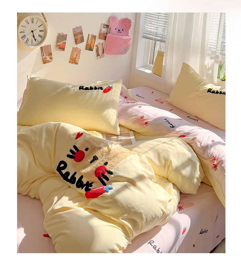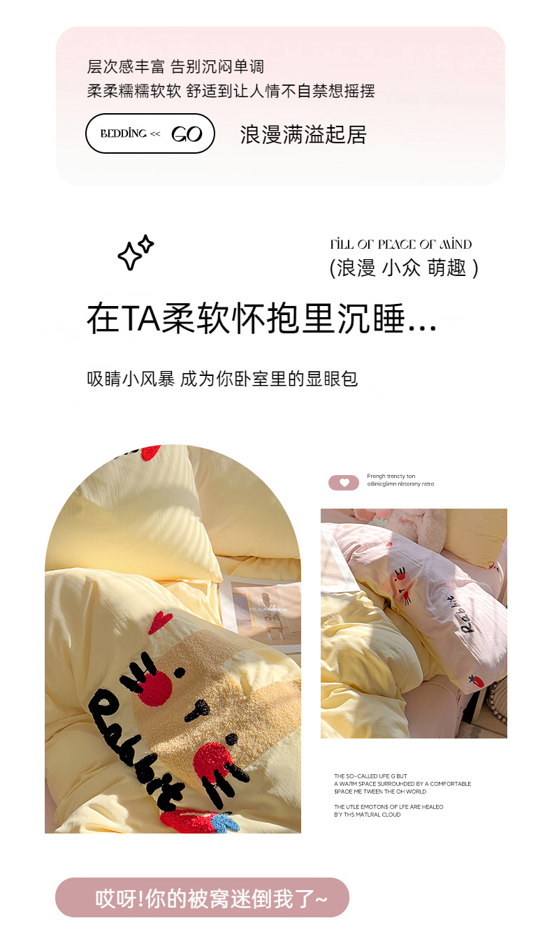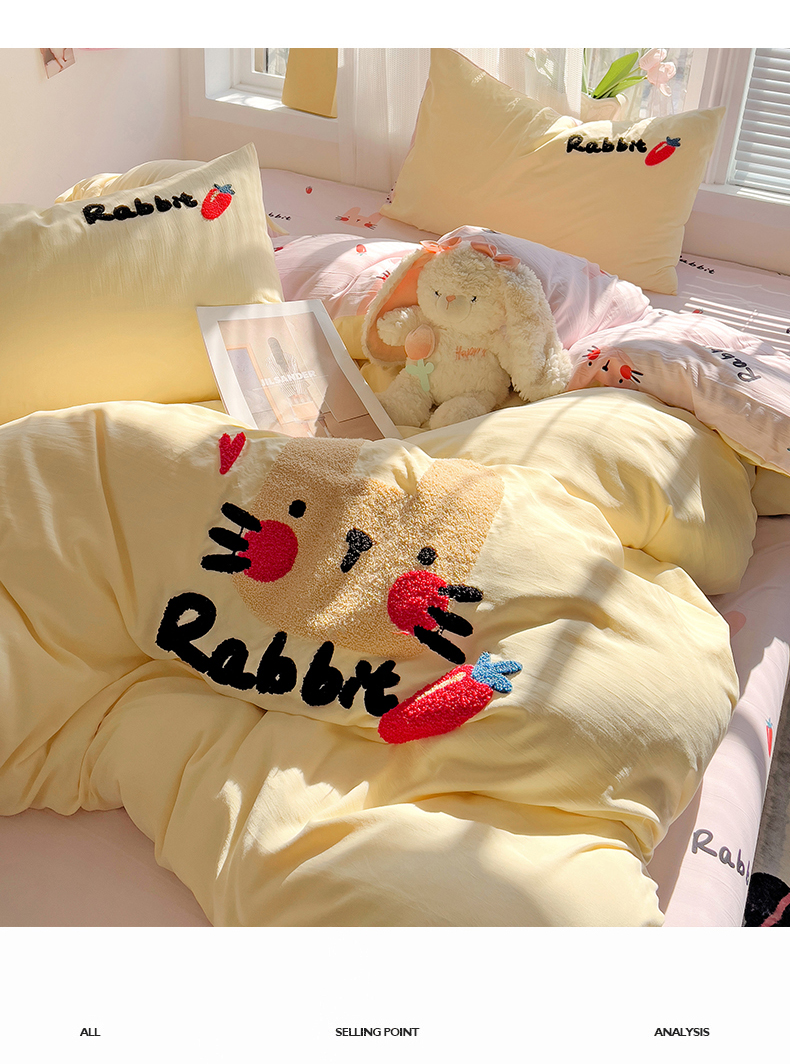 当前位置: 91家纺网 > 商品网购 > 床品套件 > 四件套 > 水洗棉四件套 > 凯洛奇 2025新款1卡通水洗棉印+绣毛巾绣四件套 萌趣粉兔