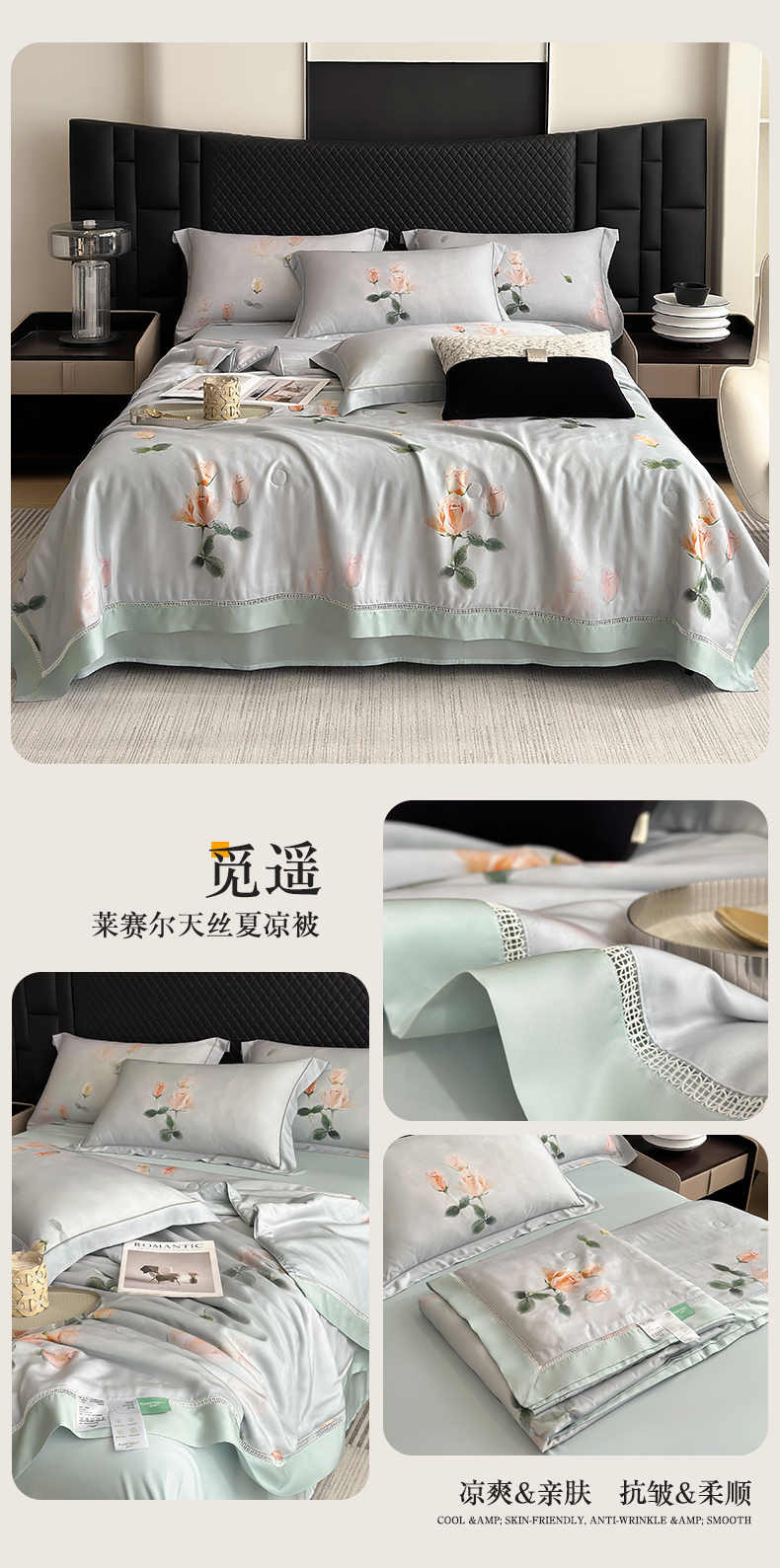 商品名称:娇逸家居 2025新款50支印花莱赛尔天丝夏被镂空款花边夏凉被 觅遥