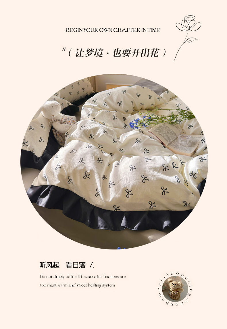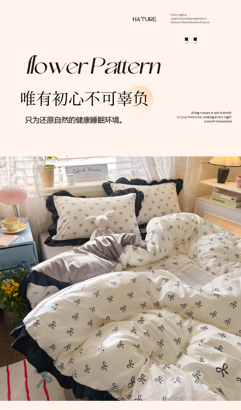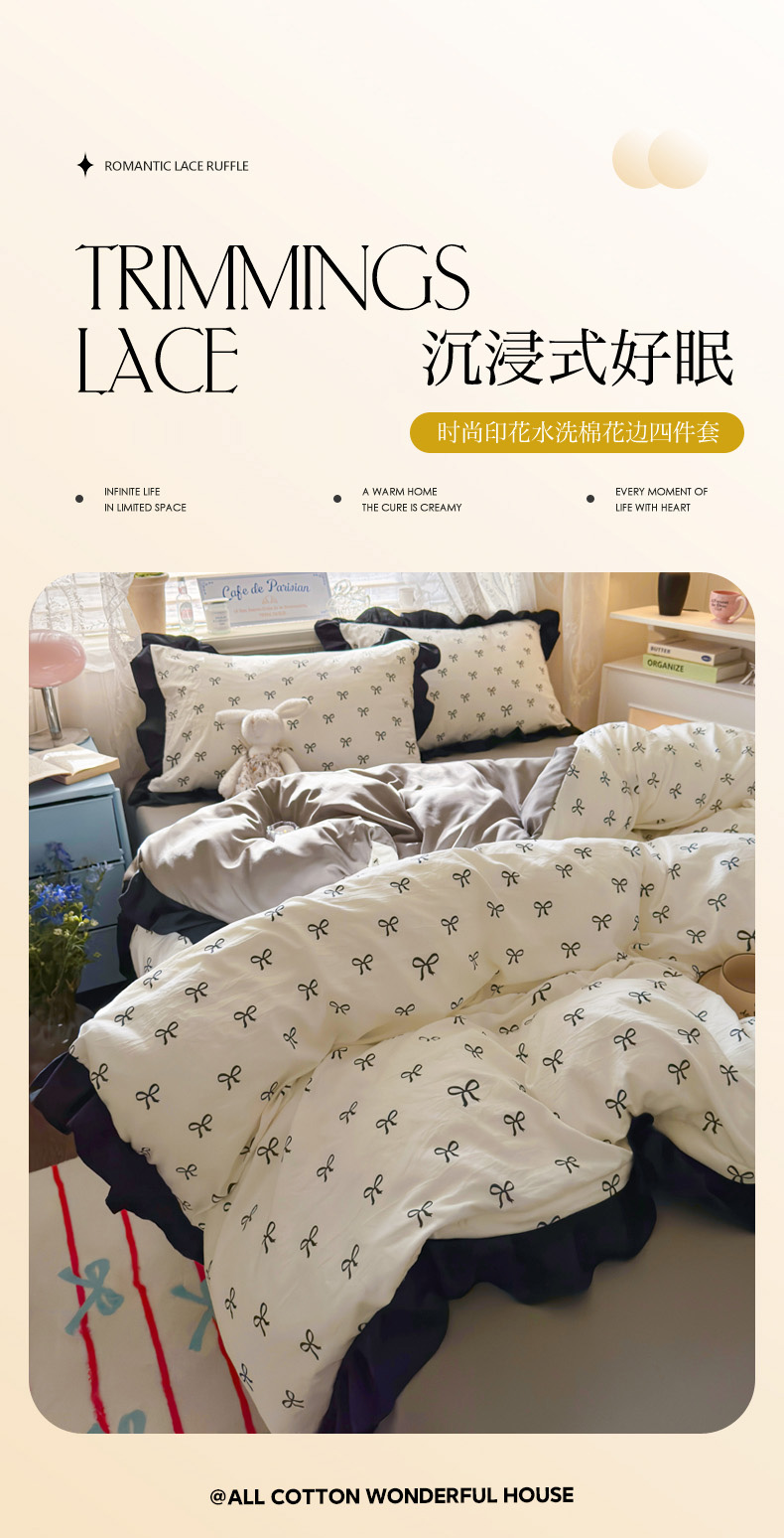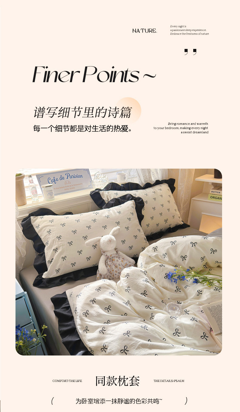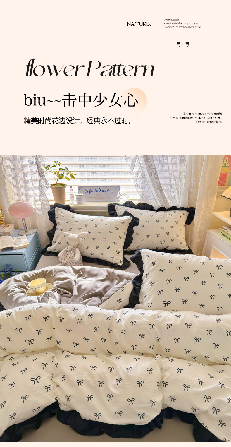 当前位置: 91家纺网 > 商品网购 > 床品套件 > 四件套 > 水洗棉四件套 > 慕澄家纺 2025新款法式浪漫风花边款水洗棉四件套 花边款-黑系蝴蝶结