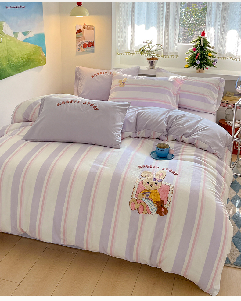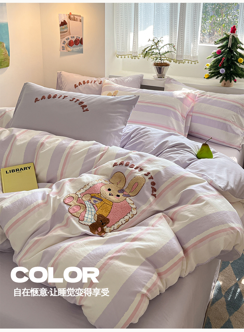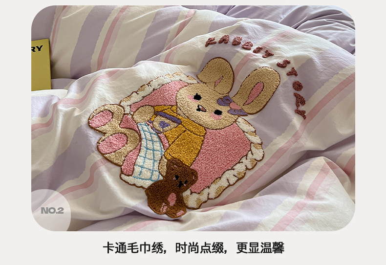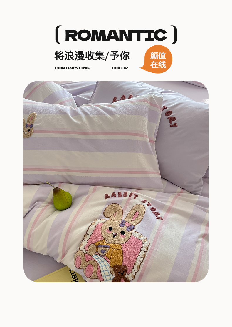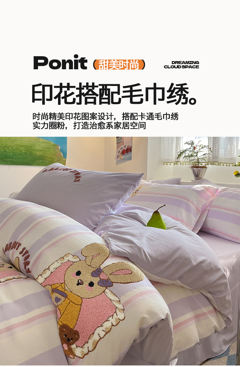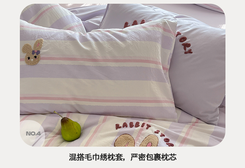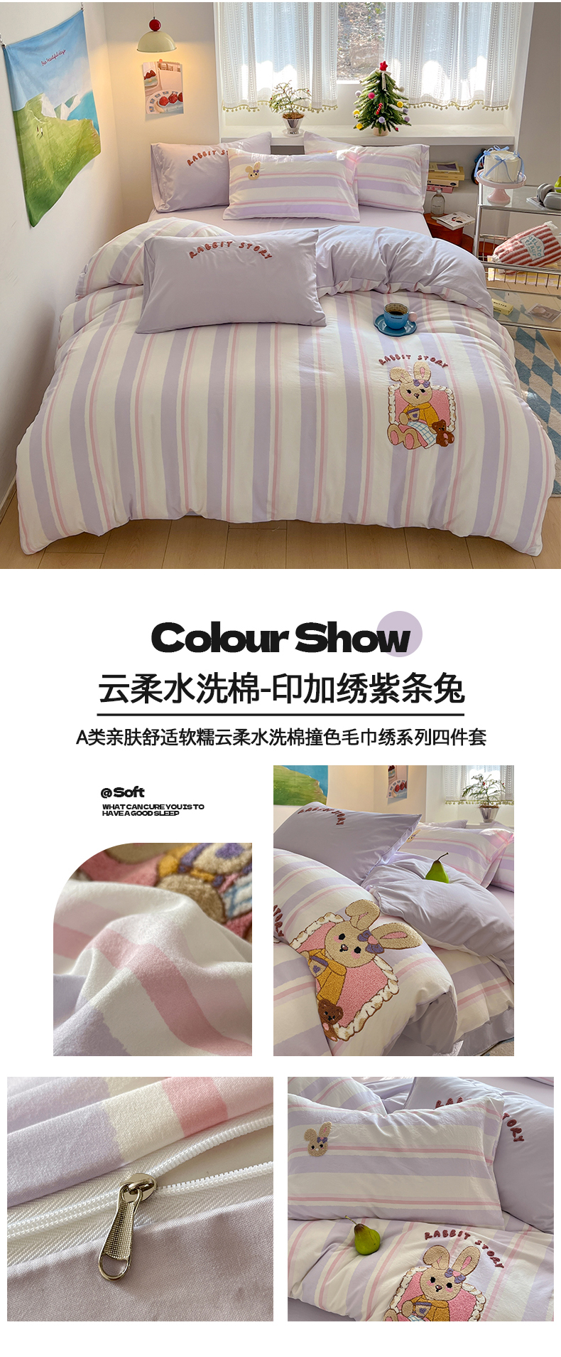 当前位置: 91家纺网 > 商品网购 > 床品套件 > 四件套 > 水洗棉四件套 > 桃心家居 2025新款A类亲肤舒适软糯云柔水洗棉印加绣卡通毛巾绣水洗棉系列 云柔水洗棉-印加绣紫条兔