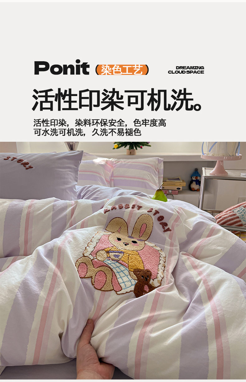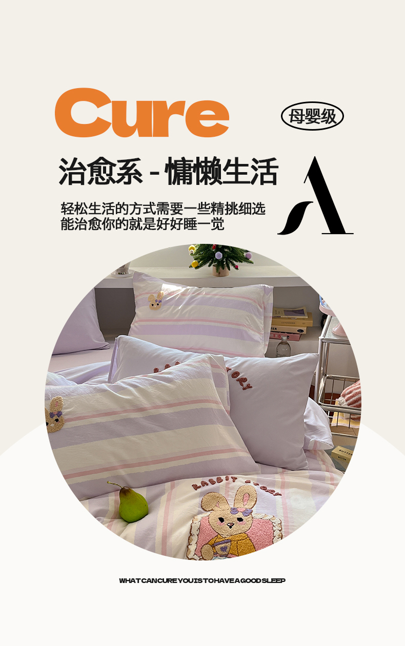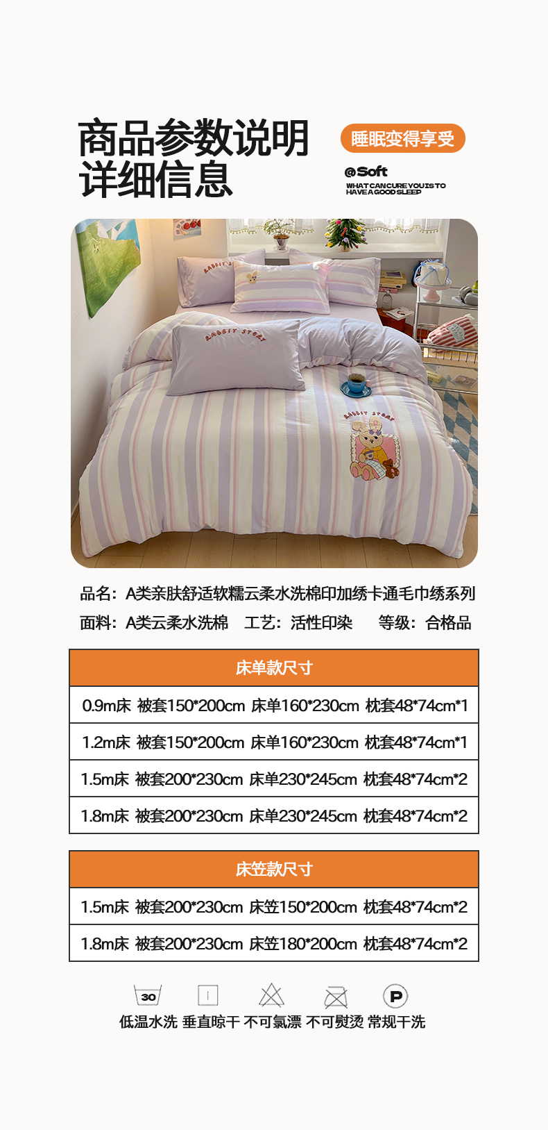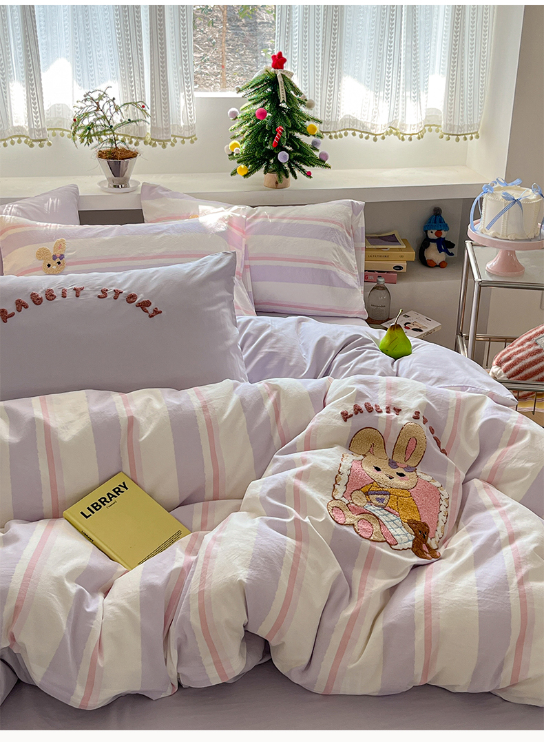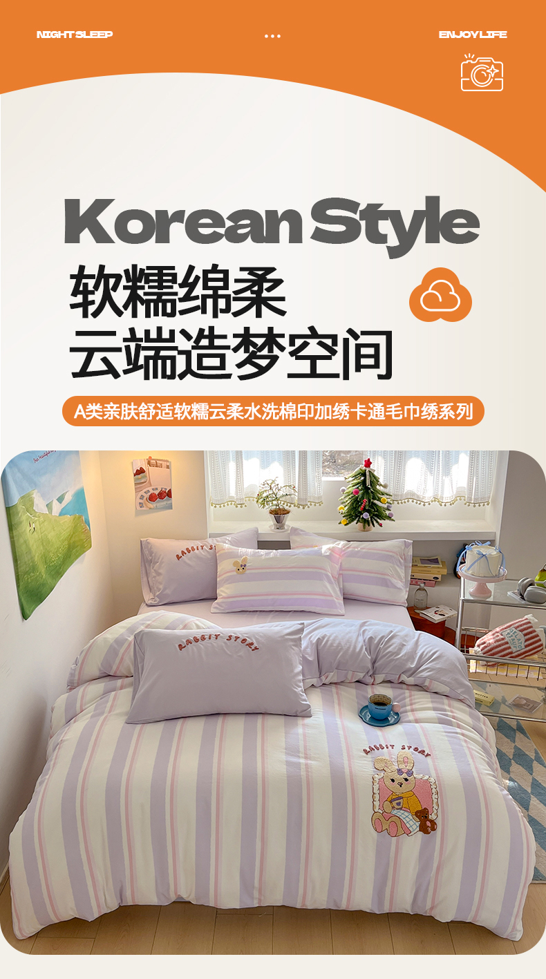当前位置: 91家纺网 > 商品网购 > 床品套件 > 四件套 > 水洗棉四件套 > 桃心家居 2025新款A类亲肤舒适软糯云柔水洗棉印加绣卡通毛巾绣水洗棉系列 云柔水洗棉-印加绣紫条兔