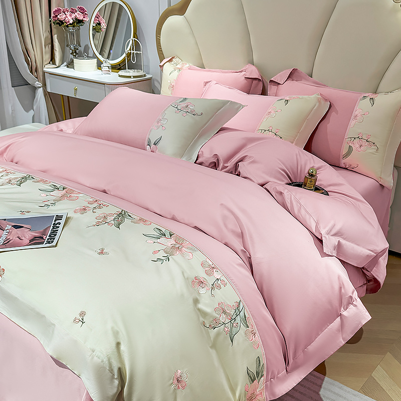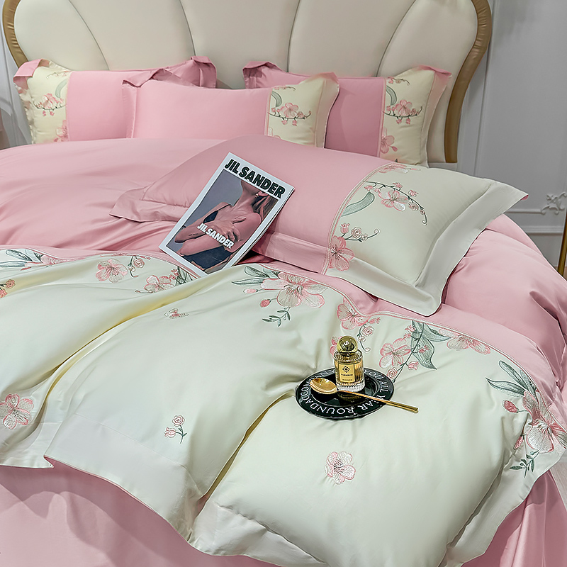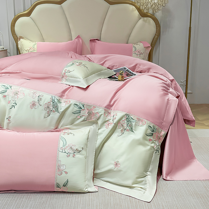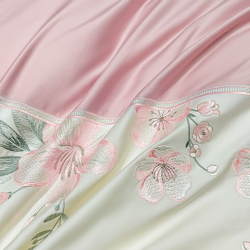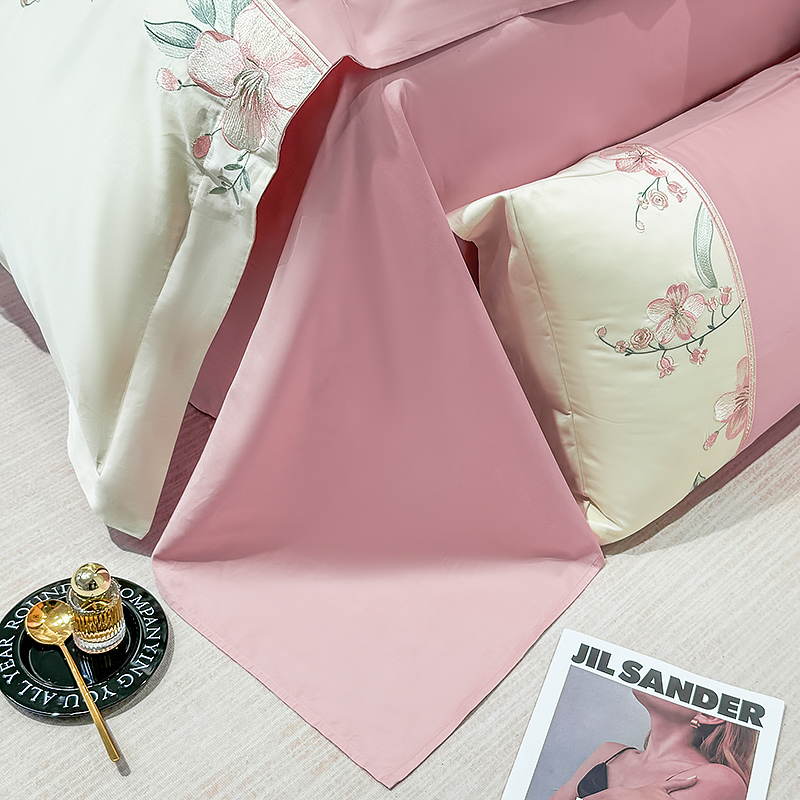 商品名称:宅家居 2025轻奢法式小香风双面纯棉刺绣拼接款长绒棉四件套-樱花恋 樱花粉