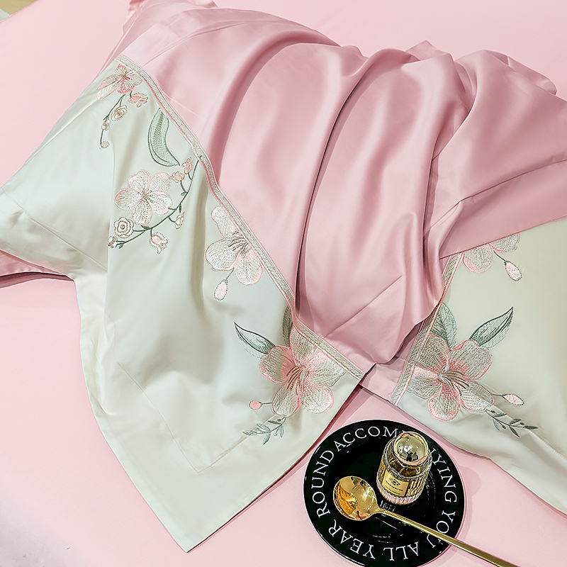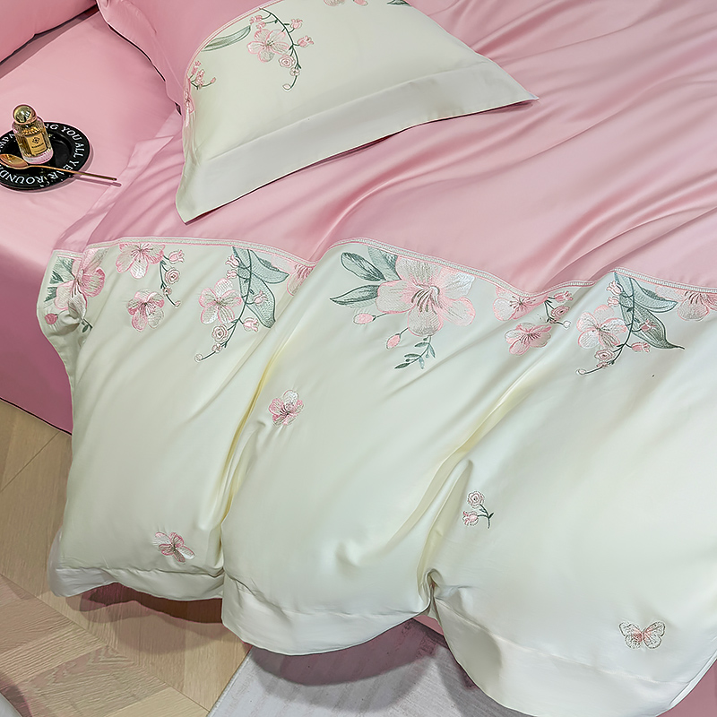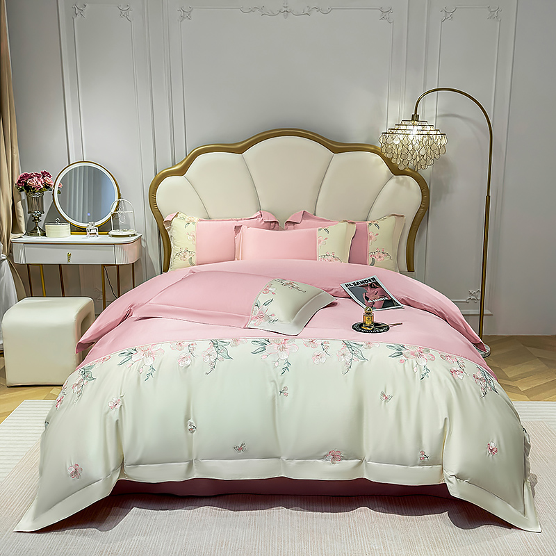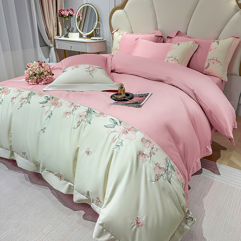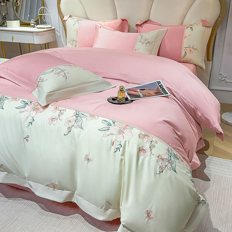 商品名称:宅家居 2025轻奢法式小香风双面纯棉刺绣拼接款长绒棉四件套-樱花恋 樱花粉