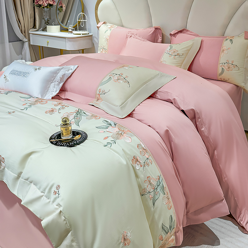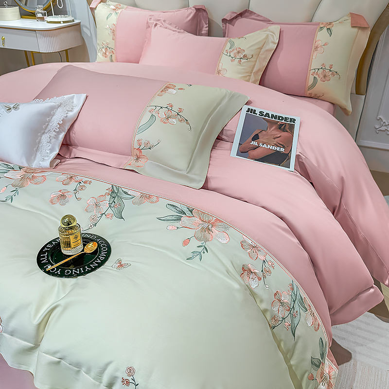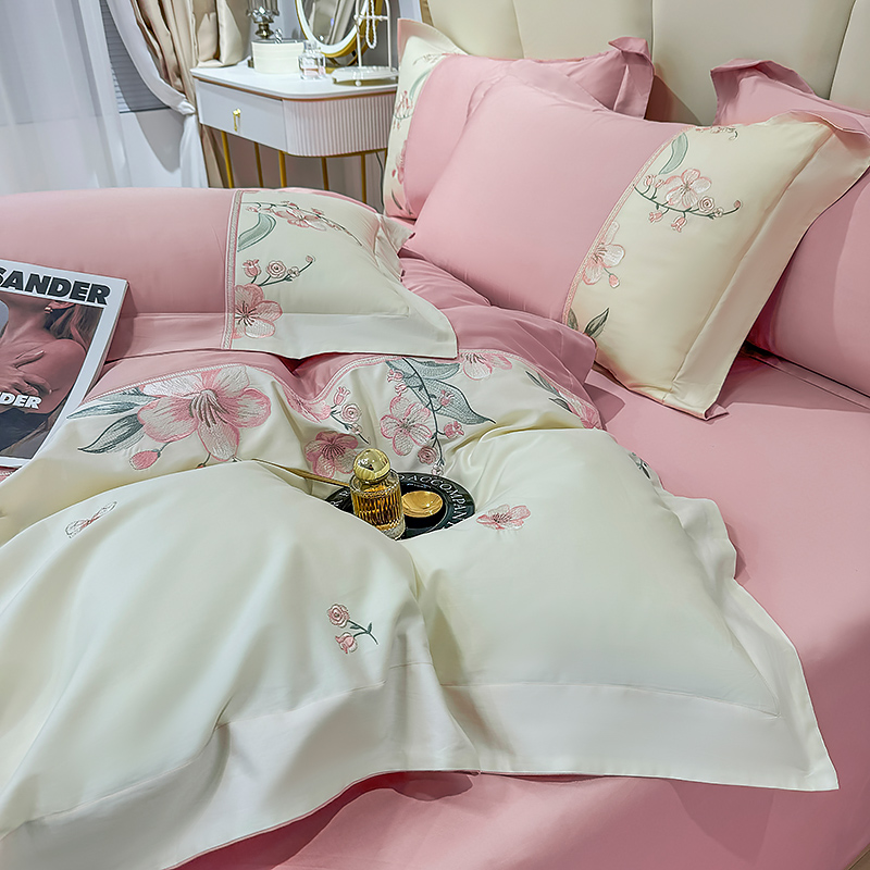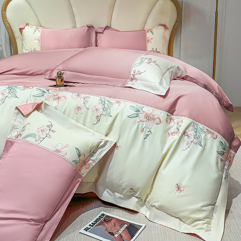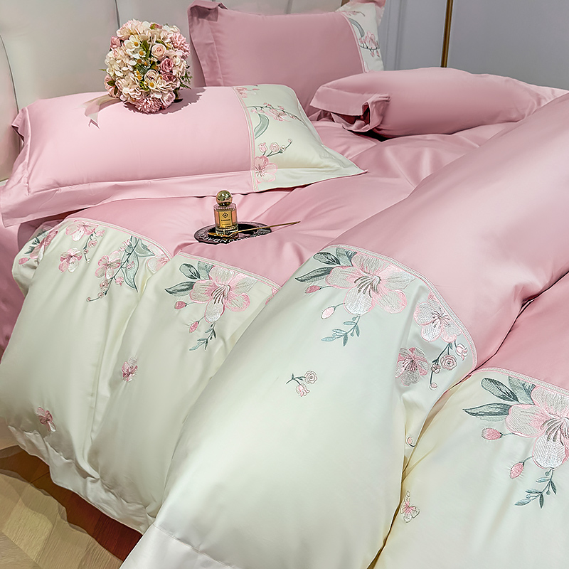 宅家居 2025轻奢法式小香风双面纯棉刺绣拼接款长绒棉四件套-樱花恋 樱花粉