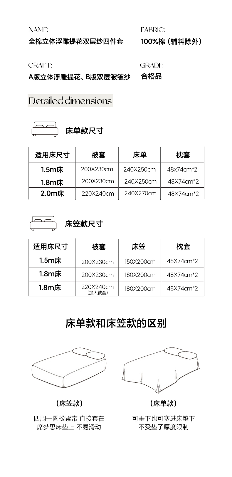 1.8米宽床:被套:200×230 床笠:180×200 枕套48×74*2(只)