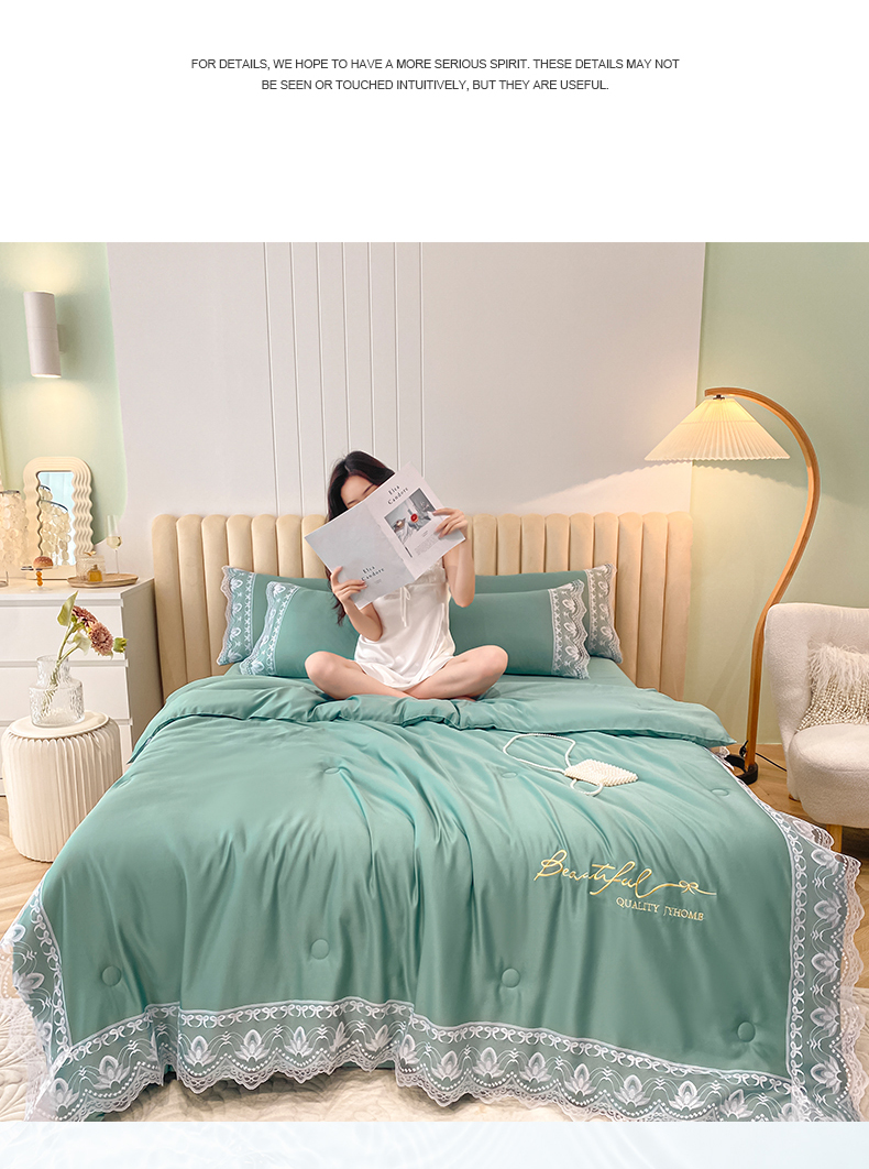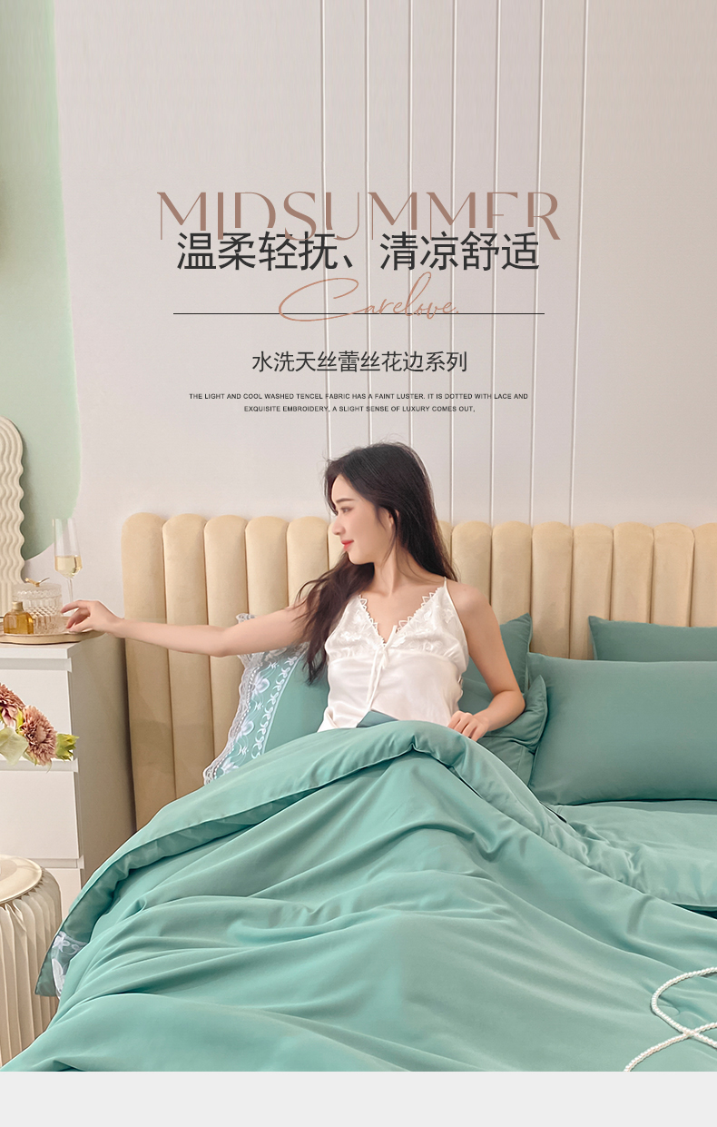 • 91家纺网 家纺一手货源 找家纺 益多眠 2026新款水洗天丝蕾丝花边夏被四件套轻奢夏被花边夏被-公主风 公主-琉璃绿