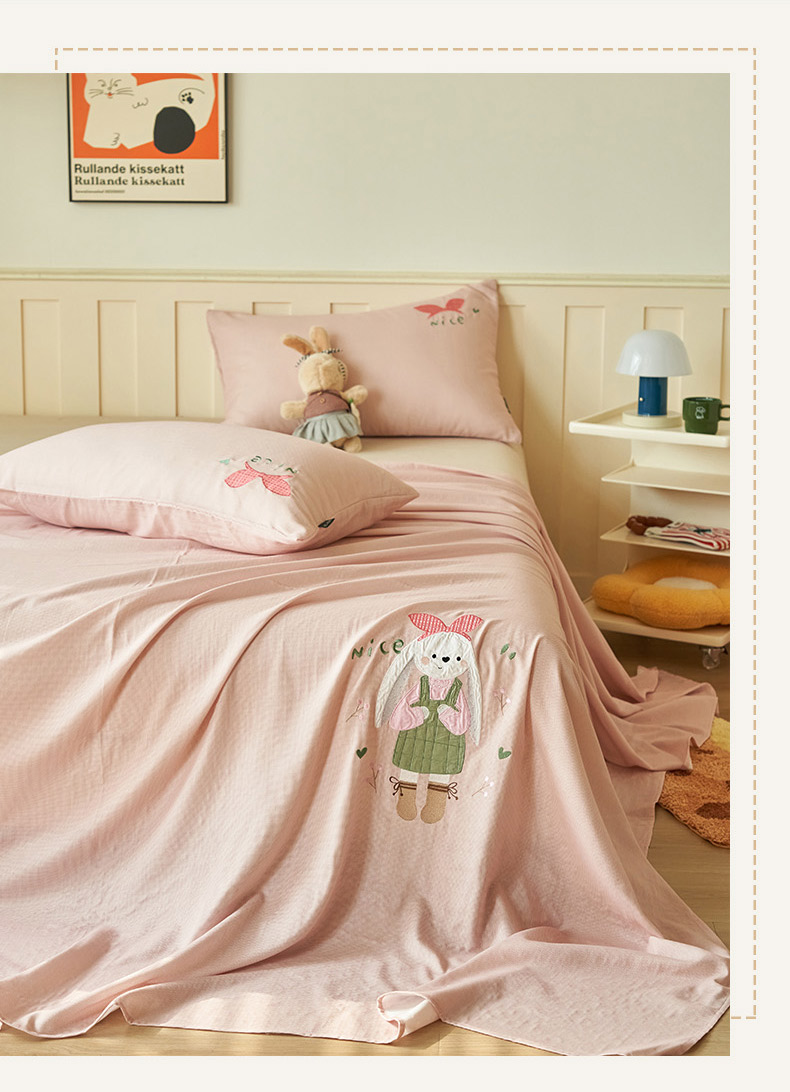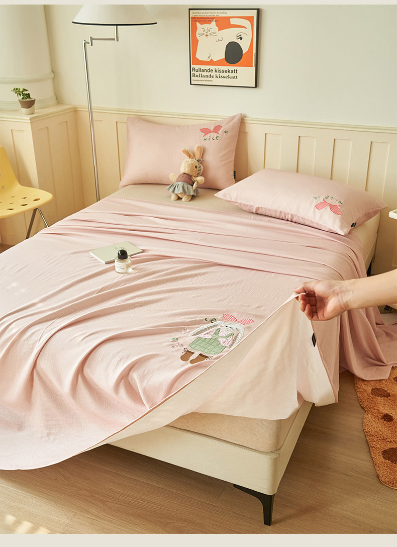 • 91家纺网 家纺一手货源 找家纺 寐绸家纺 2025新款纯棉双层纱贴布绣单床单 贴布双层纱床单-暗粉