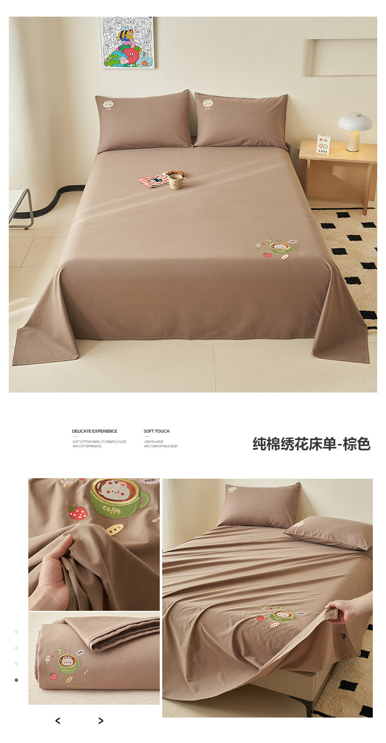 • 91家纺网 家纺一手货源 找家纺 寐绸家纺 2025新款纯棉水洗棉纯色绣花单床单 纯棉绣花床单-米驼