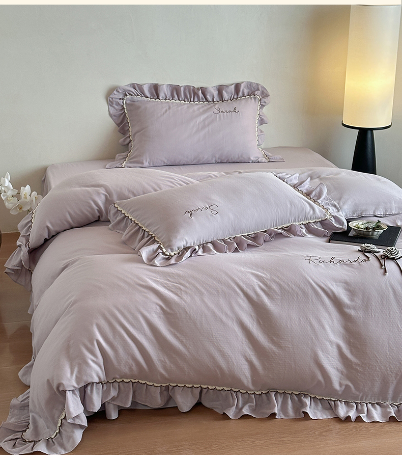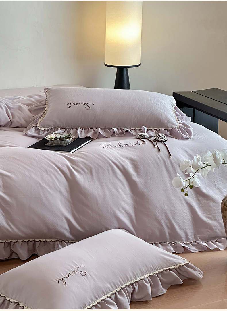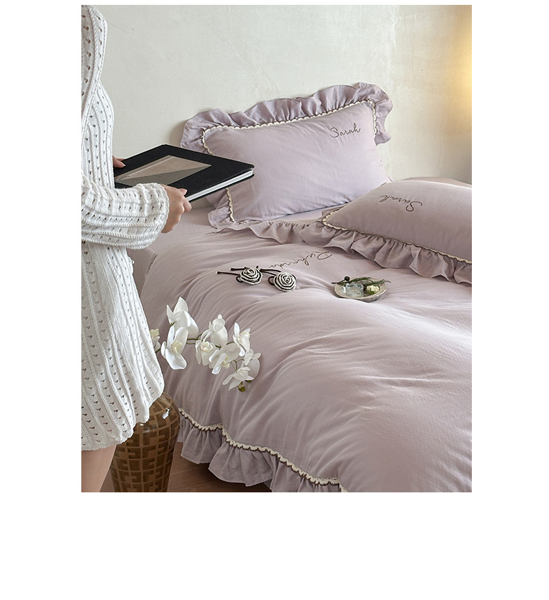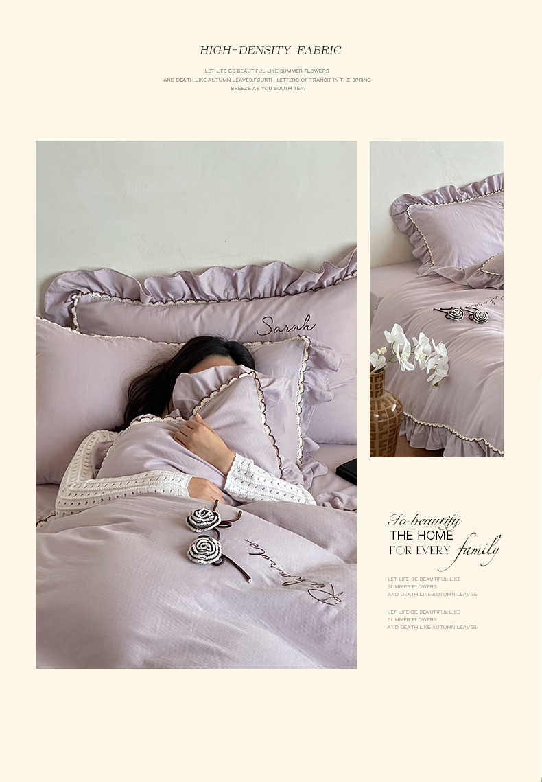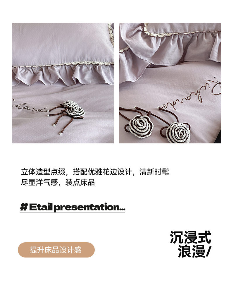 名品优仓 2025新款纯棉水洗棉双层纱提花手工花韩版花边四件套 思颍-烟紫