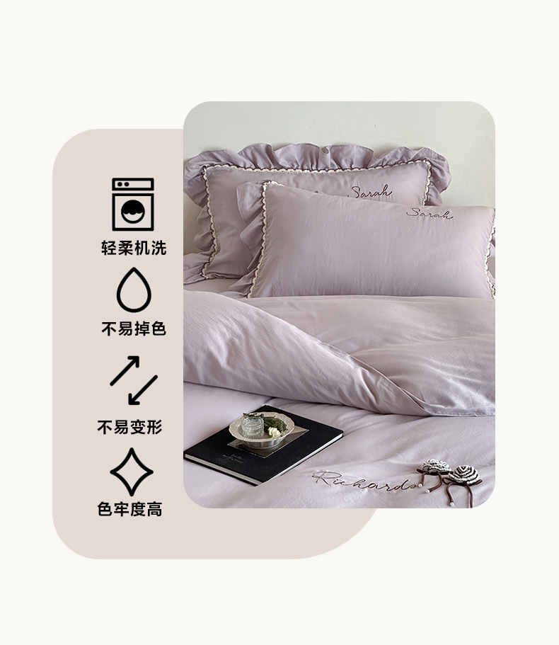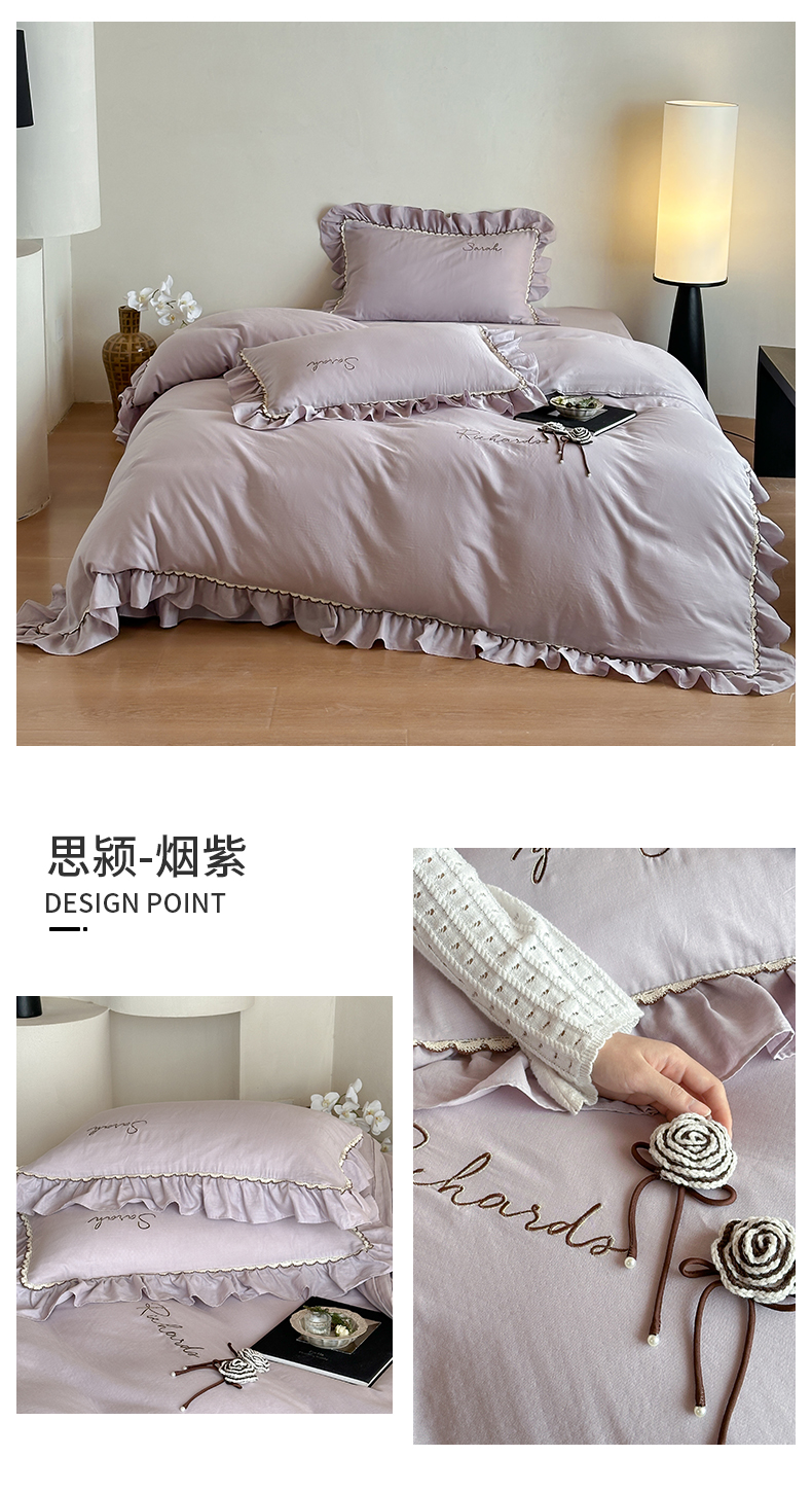 商品名称:名品优仓 2025新款纯棉水洗棉双层纱提花手工花韩版花边四件套 思颍-烟紫