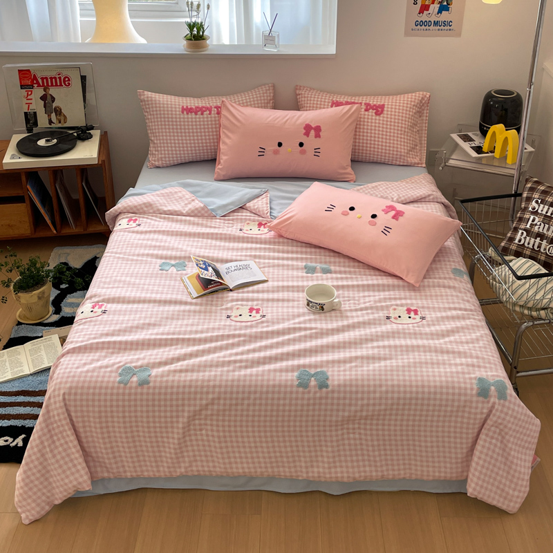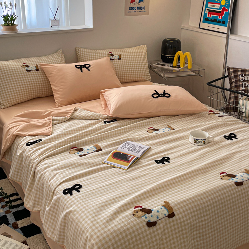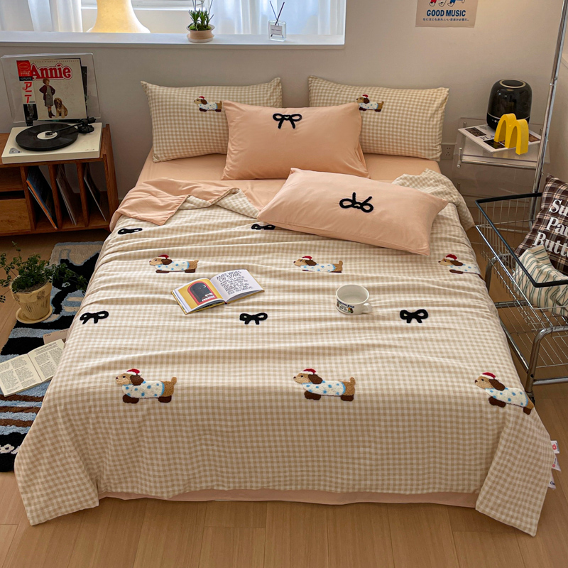 红嘴企鹅2025新款毛巾绣空调被四件套 夏被-粉格狗狗