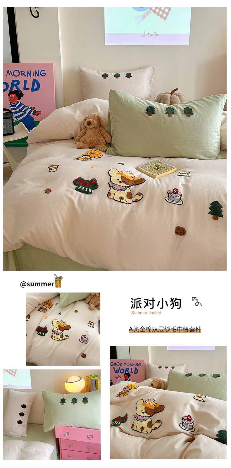 商品名称:TT.one 塔塔家居 2025新款全棉双层纱毛巾绣萌宠系列四件套 派对小狗