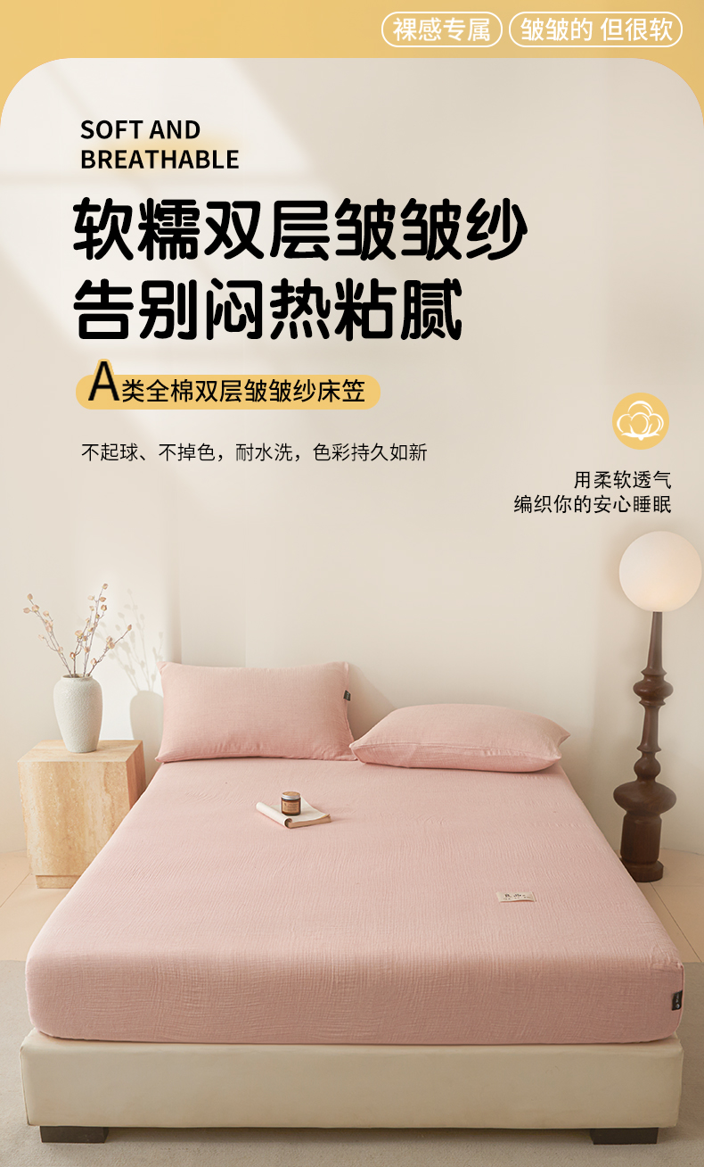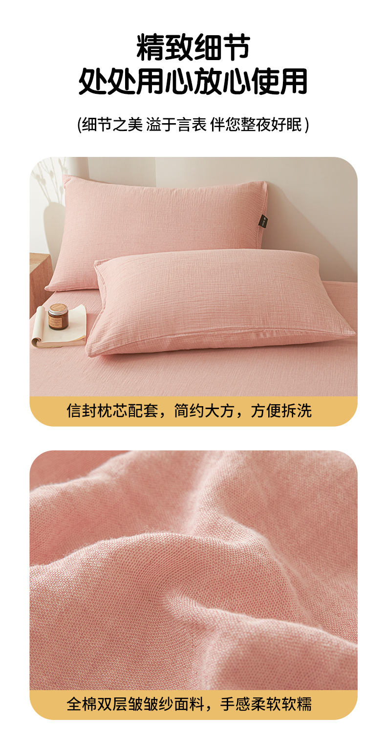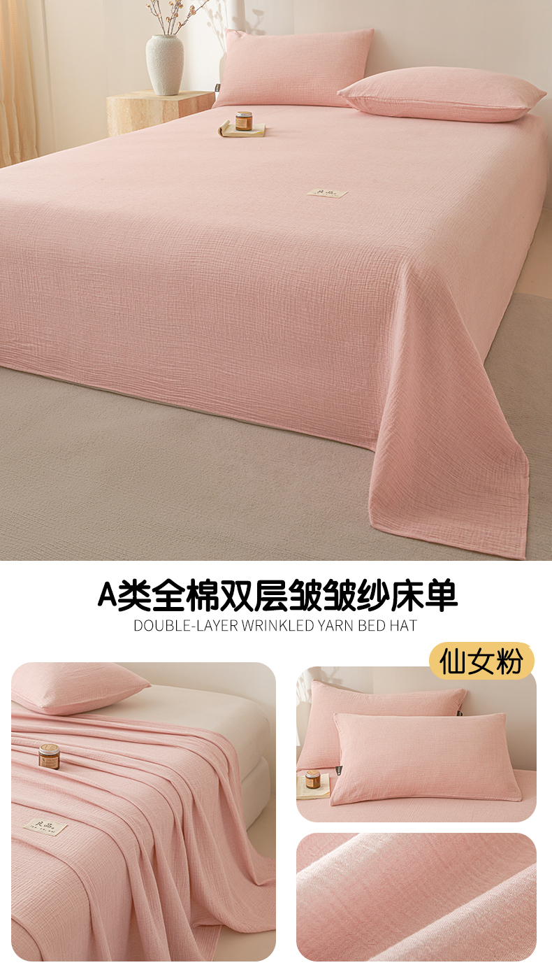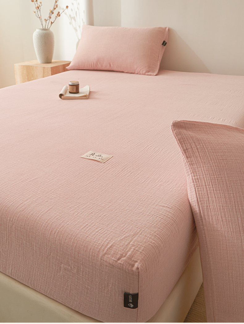 • 91家纺网 家纺一手货源 找家纺 鑫钰 2025新款纯色系列全棉双层皱皱纱床单-床笠 仙女粉-床笠
