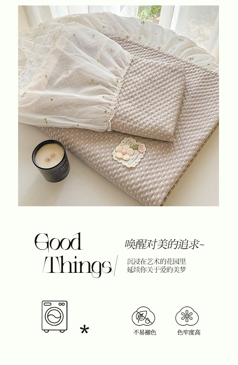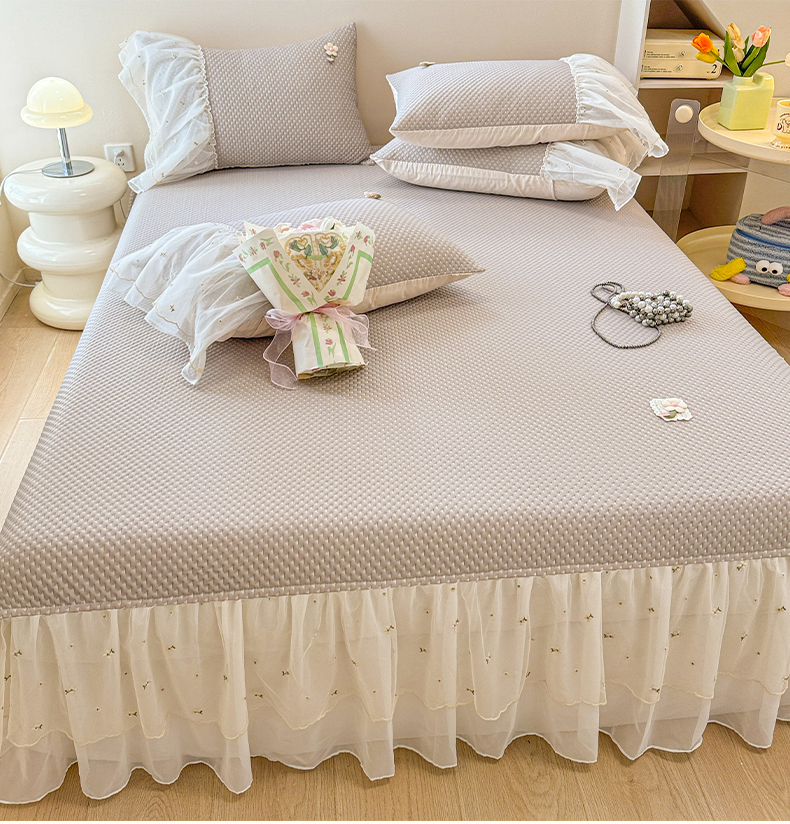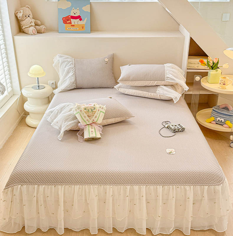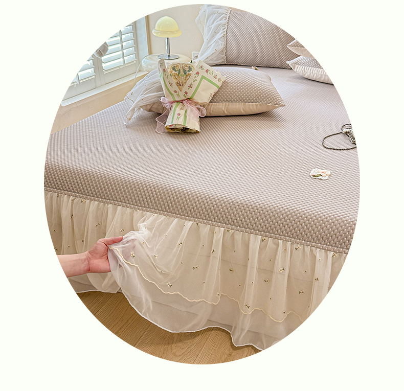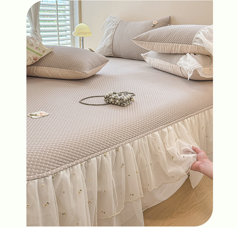 商品名称:蓝邻家纺 2025春夏新款PE提花雪纺+绣花花边凉席席子 夏花-米灰