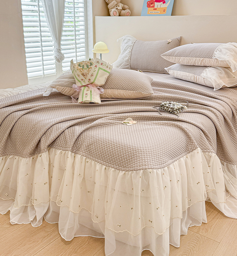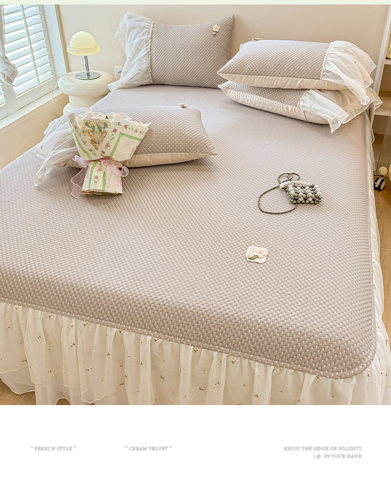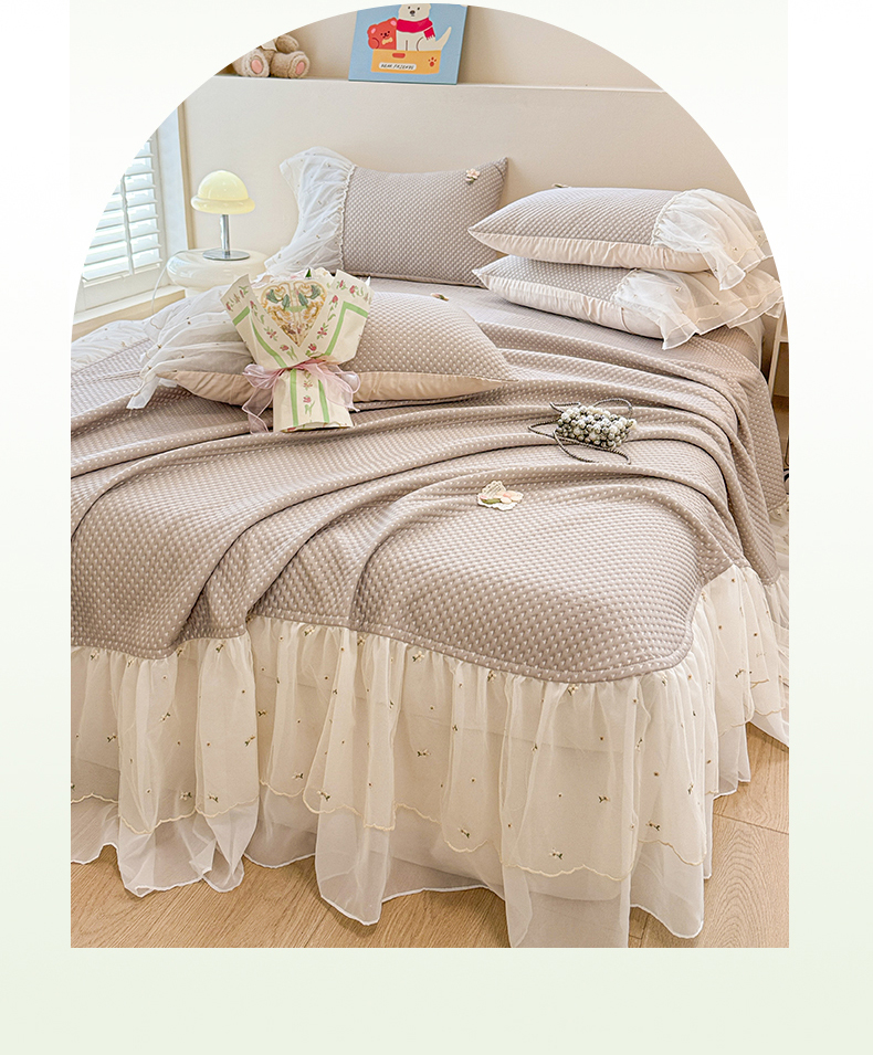蓝邻家纺 2025春夏新款PE提花雪纺+绣花花边凉席席子 夏花-米灰