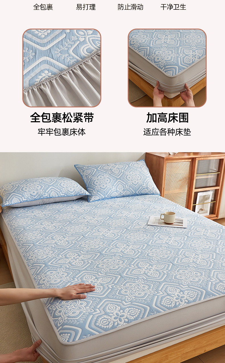梦镜家纺 2025新款A类针织双层纱床笠 花韵-薄雾蓝