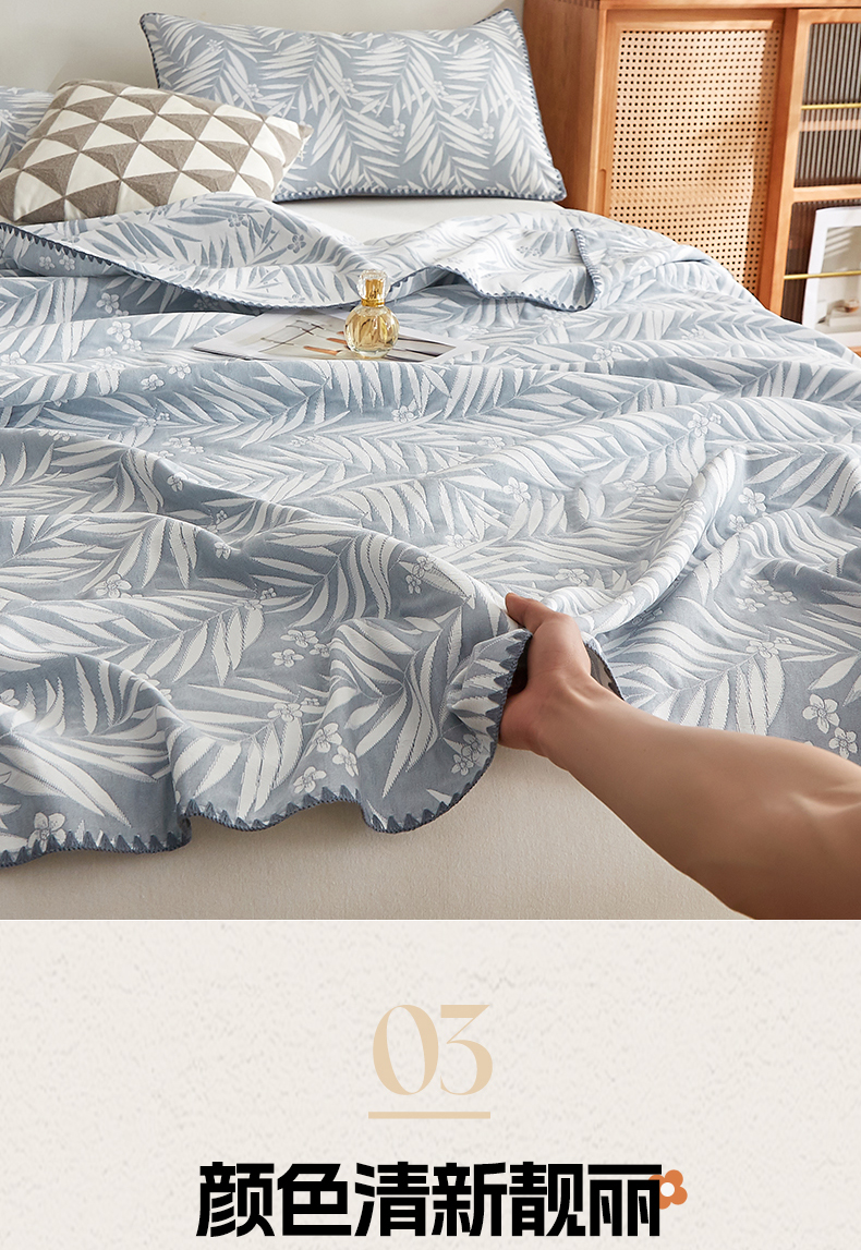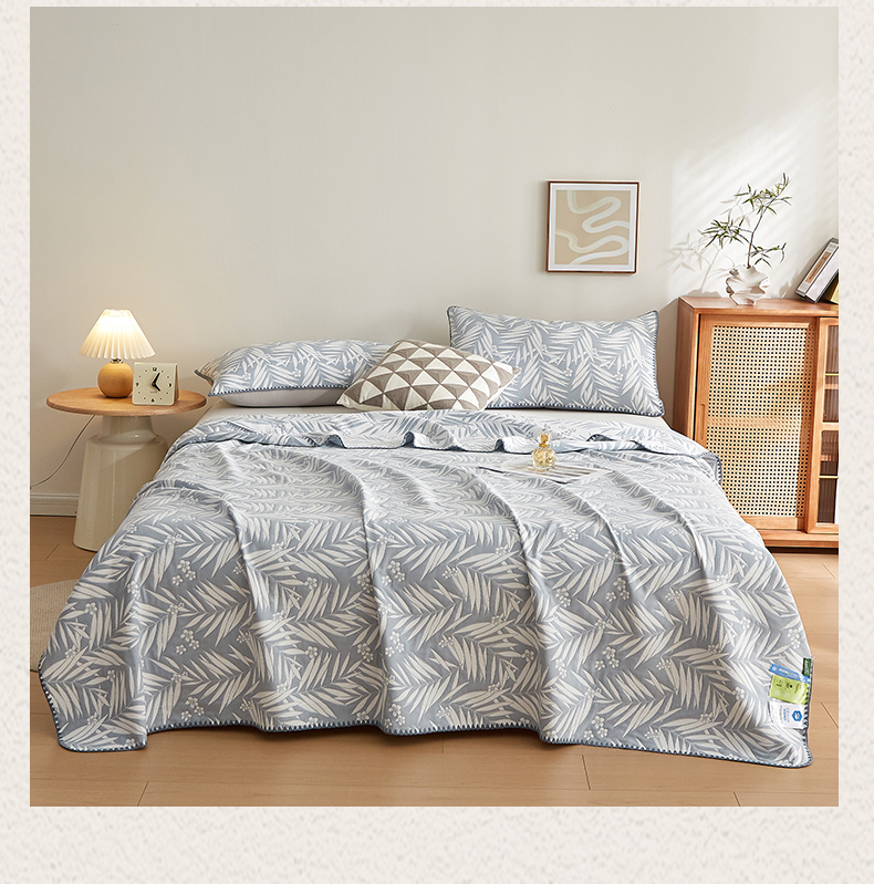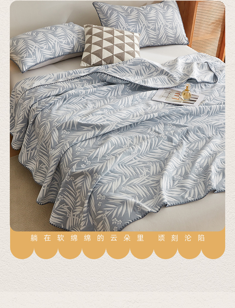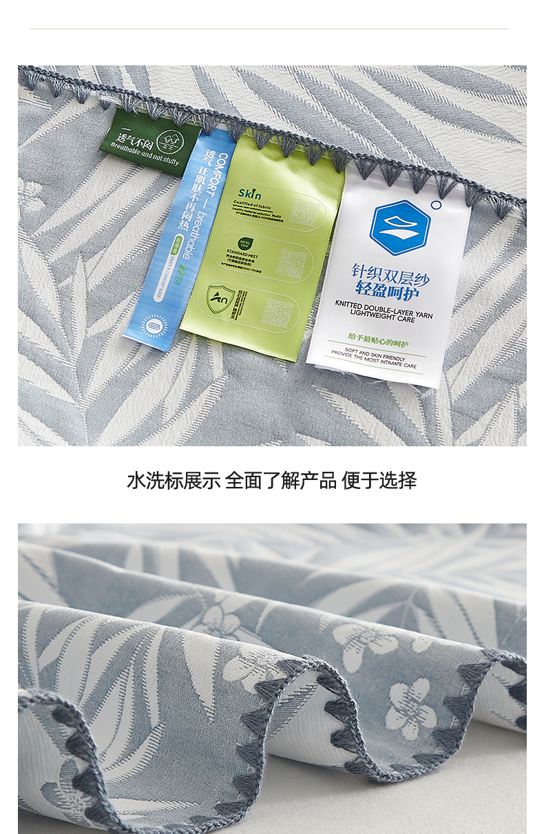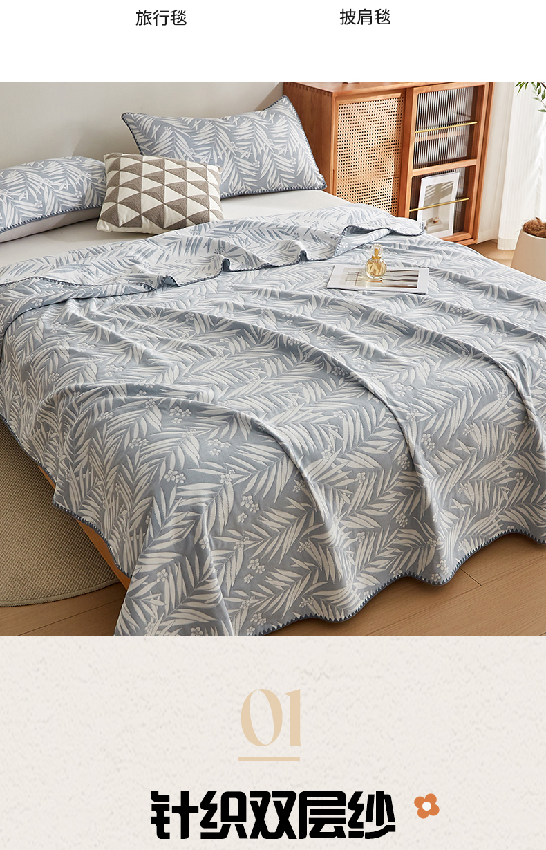 商品名称:梦镜家纺 2025新款A类针织双层纱盖毯毯子 细叶-浅蓝灰