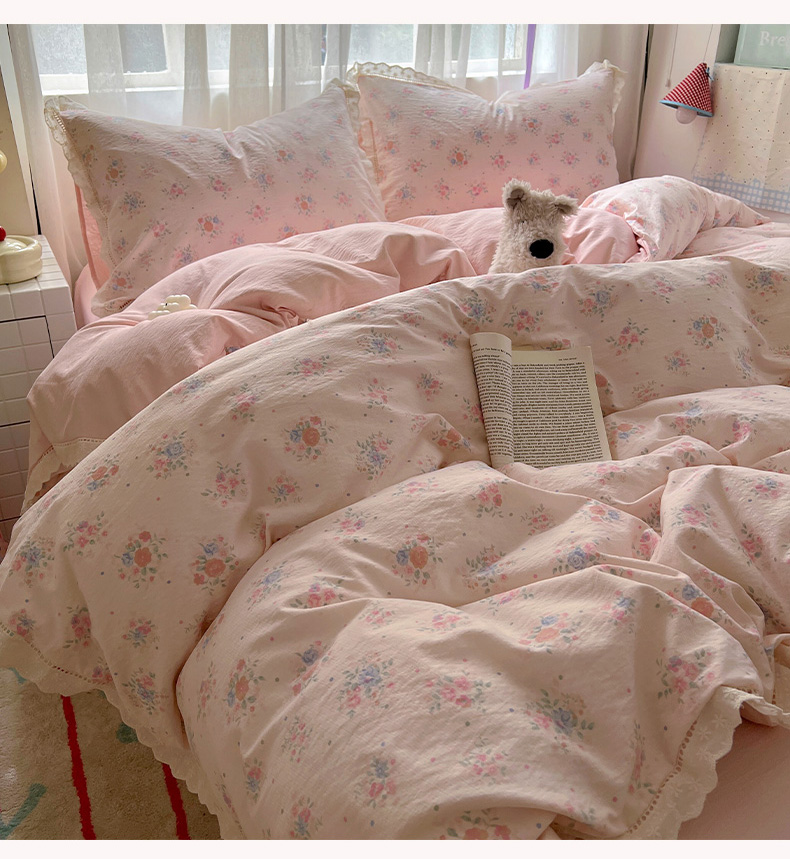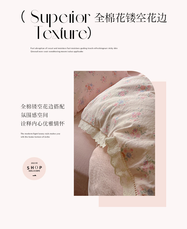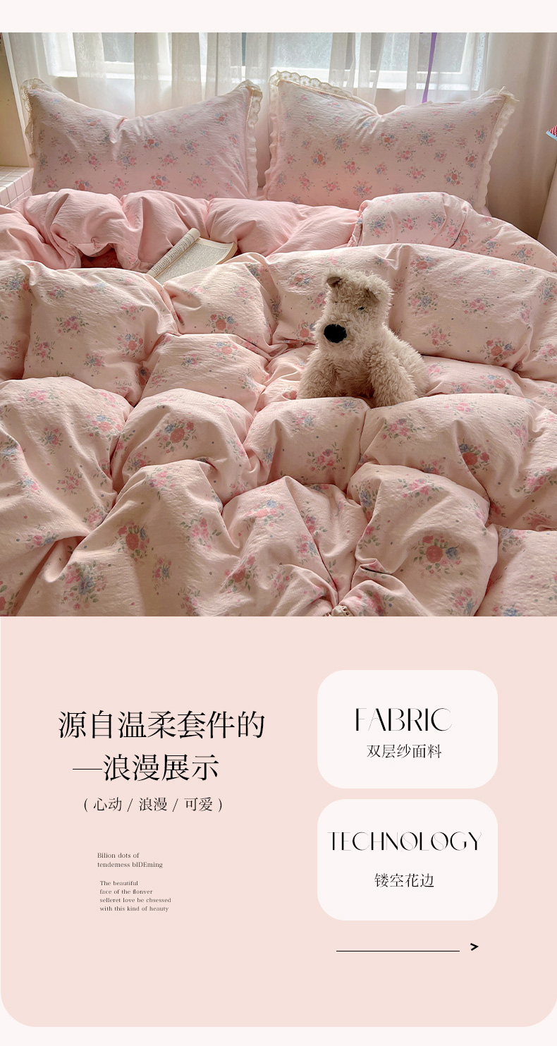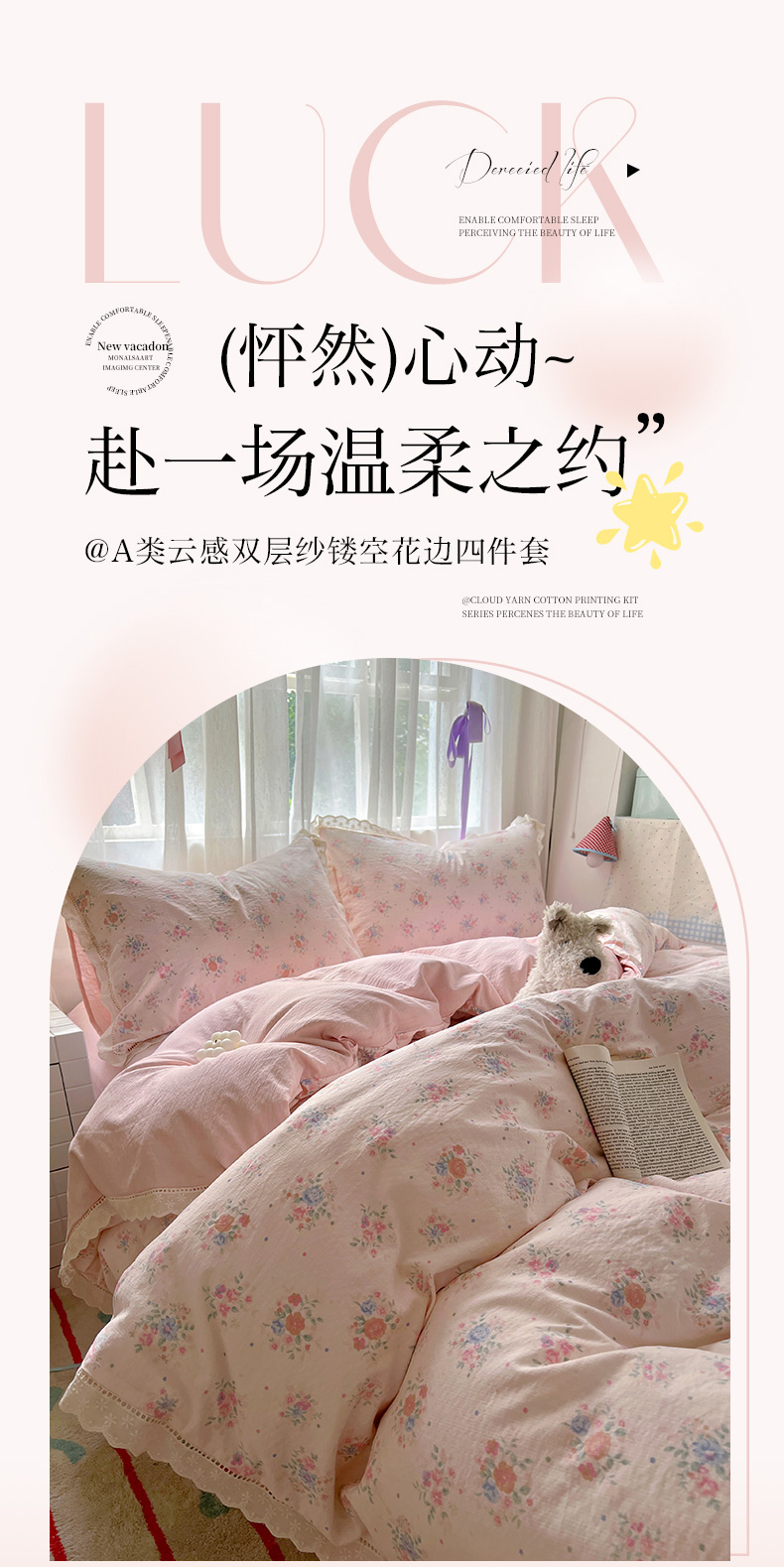 当前位置: 91家纺网 > 商品网购 > 床品套件 > 四件套 > 双层纱四件套 > 罗亿家纺 2025新款云感双层纱全棉镂空花边四件套(提供买家秀) 芊芊花海