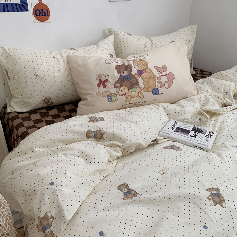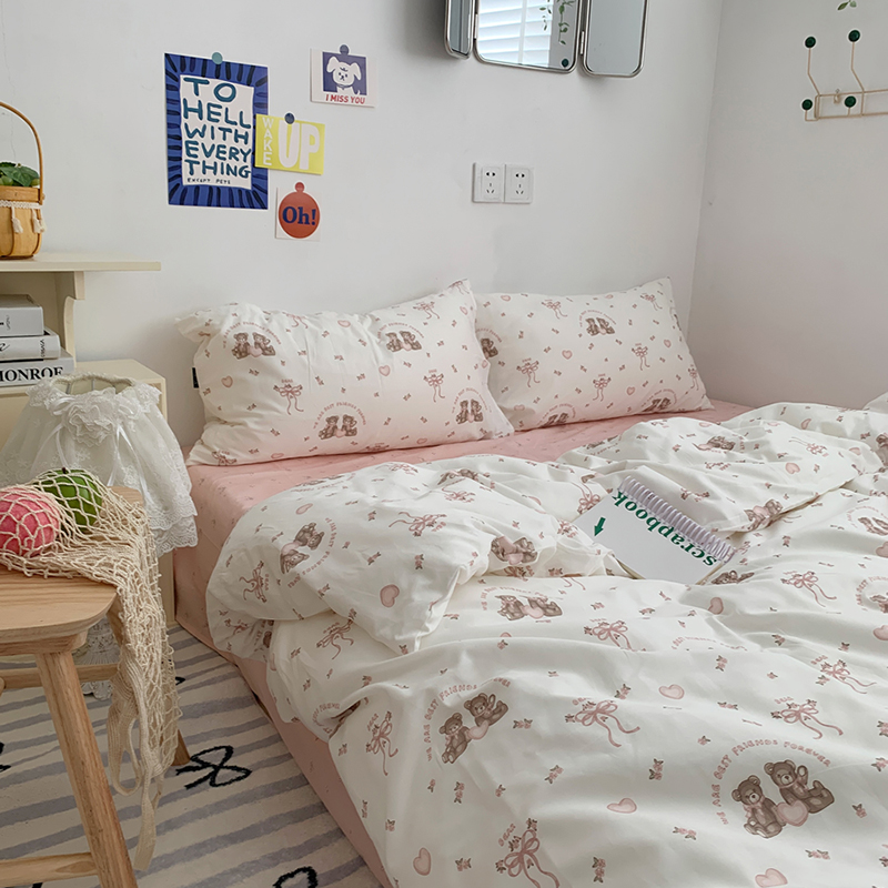 商品名称:柚可家居 2024新款40支纯棉活性印花四件套-小熊系列-实拍图第二组 丝带小熊 白格
