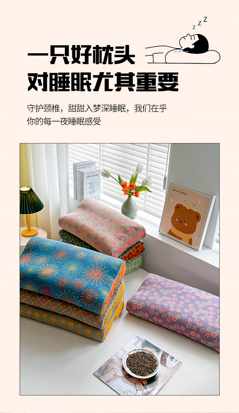 (总)梦莱家纺 2025新款棉麻荞麦枕枕头枕芯,清风-蓝色,丛林-咖色,花影-红色,玫瑰-粉色,玫瑰-黄色,玫瑰-灰色,玫瑰-蓝色
